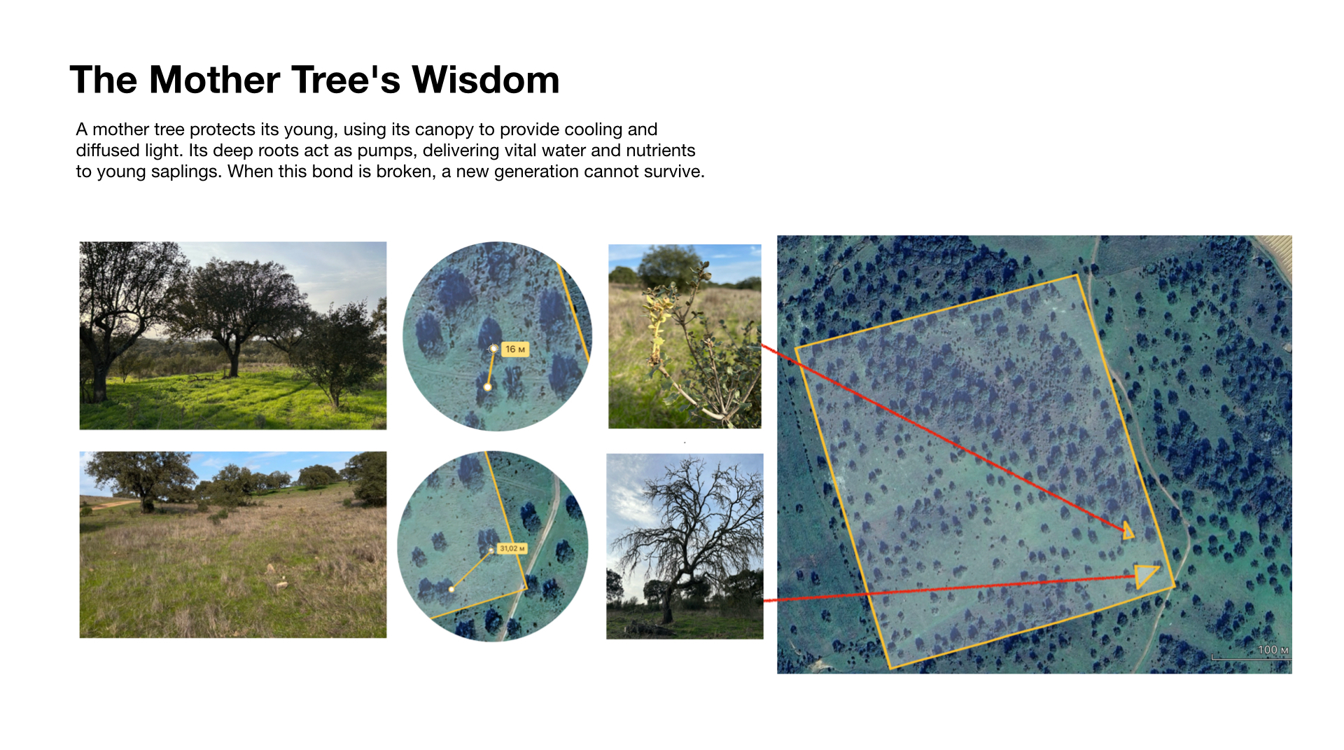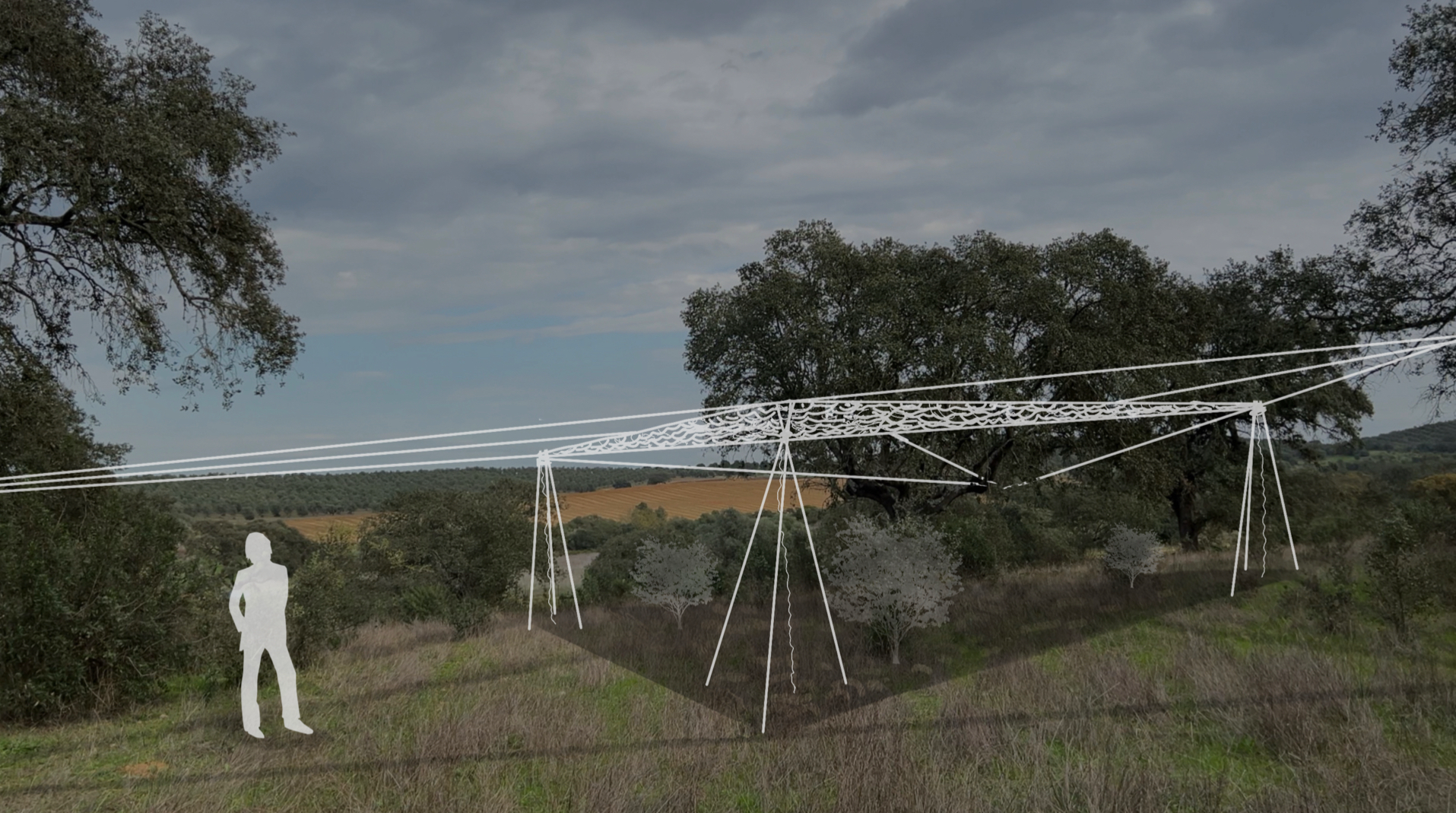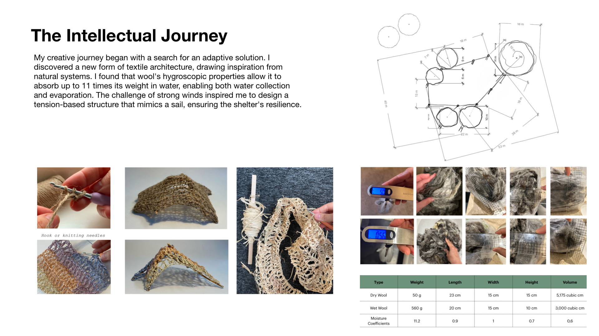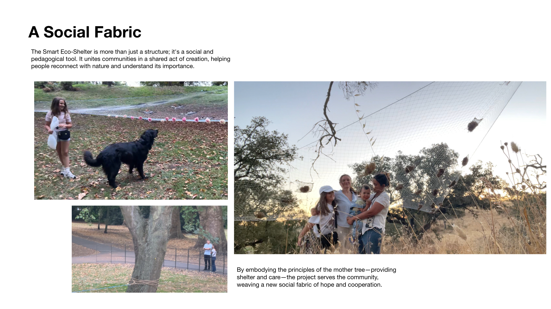 The Smart Eco-Shelter is a textile architecture project from the Royal College of Art, offering an adaptive solution to climate change. Inspired by the ‘mother tree’ concept, it addresses how drought-stricken ecosystems, like Portugal's Montado, fail to protect new saplings. Acting as a 'second canopy,' the shelter uses a unique textile woven with agricultural waste like wool and straw. Its hygroscopic properties collect moisture, while its design cools the microclimate and reduces solar radiation, fostering new life. This project is a tangible promise to restore harmony between human design and the natural world, nurturing life for future generations.