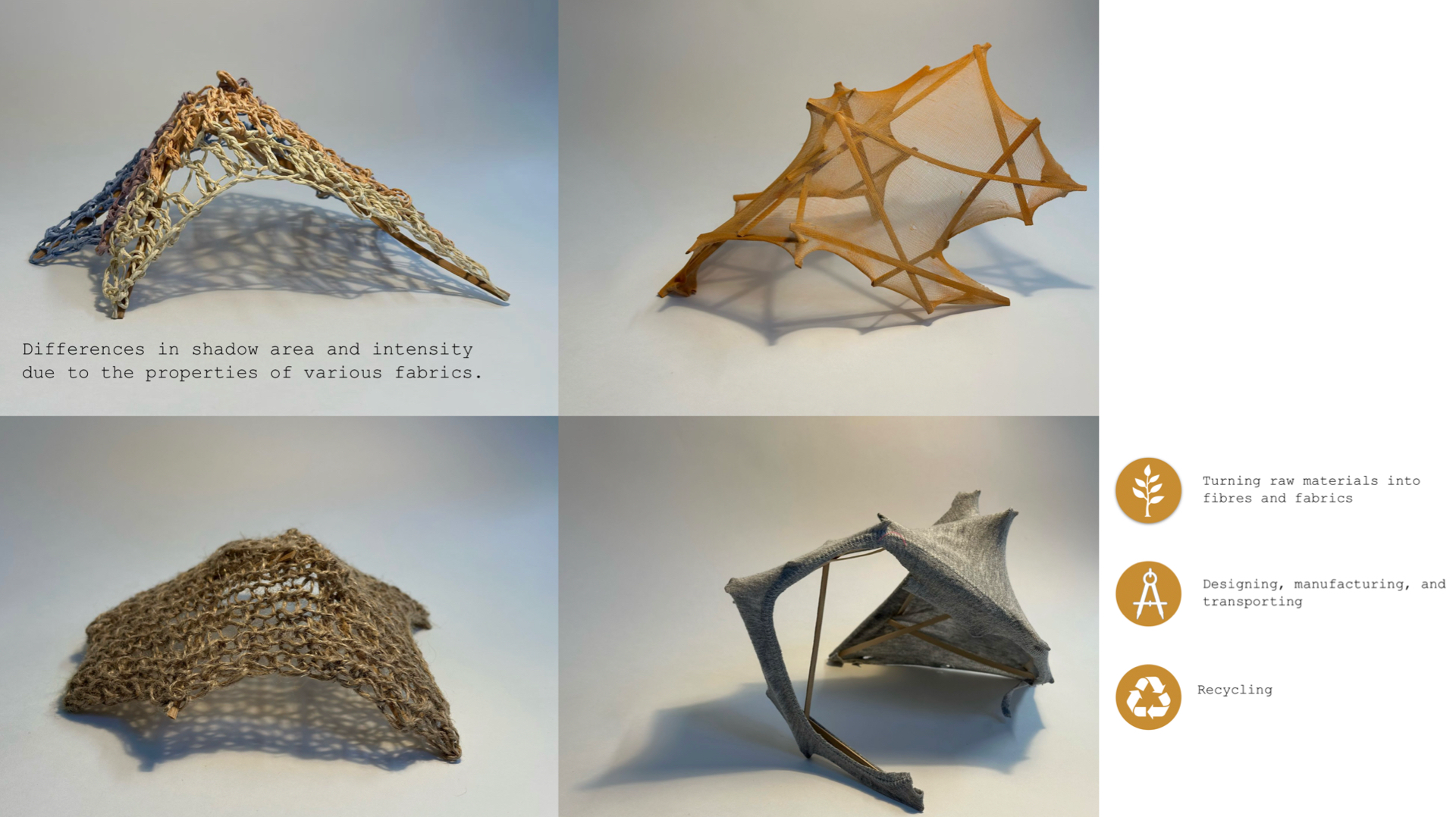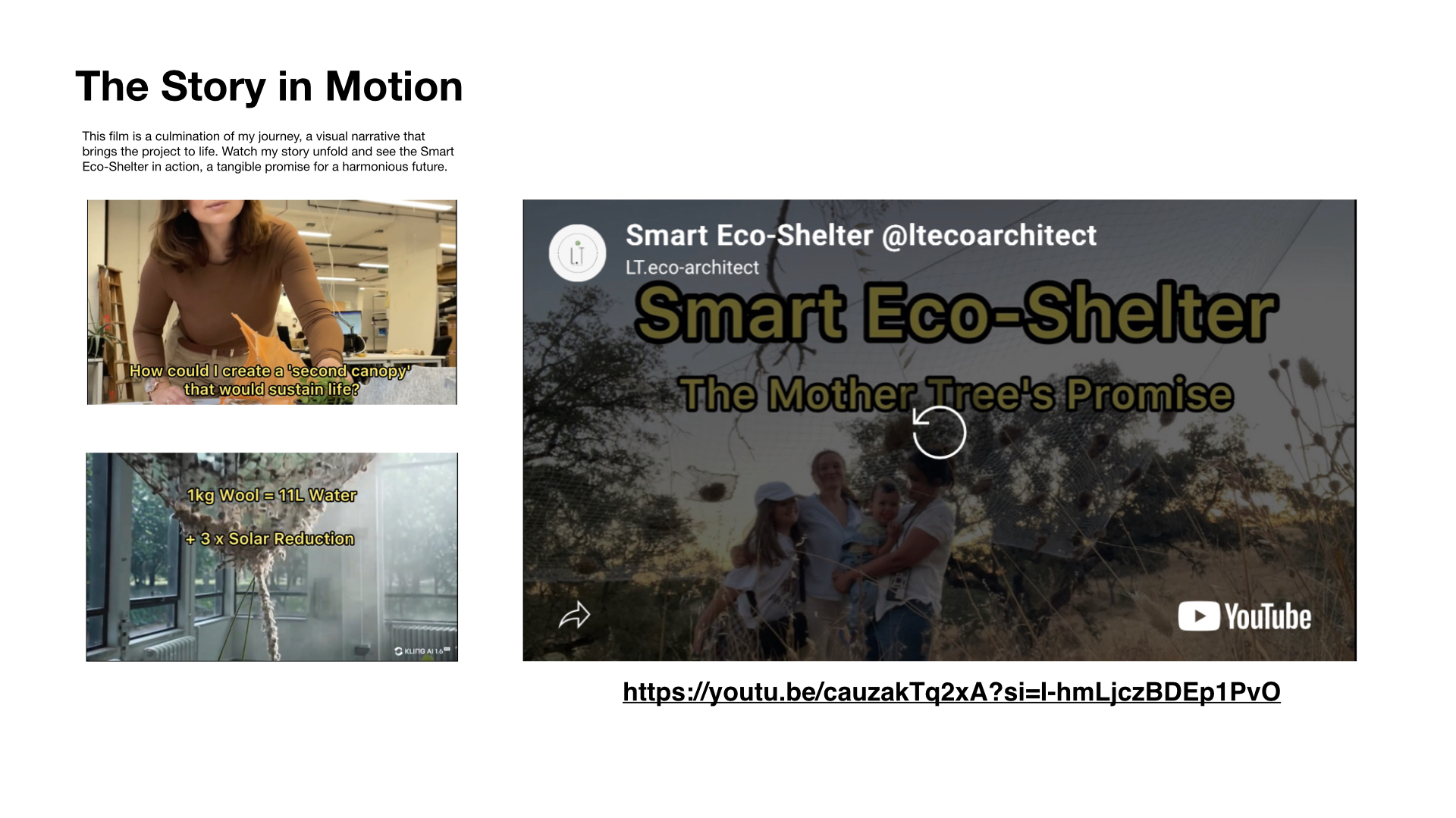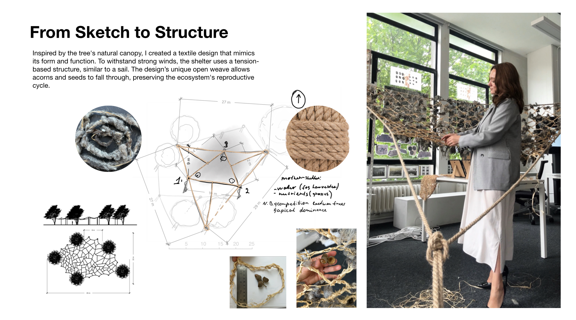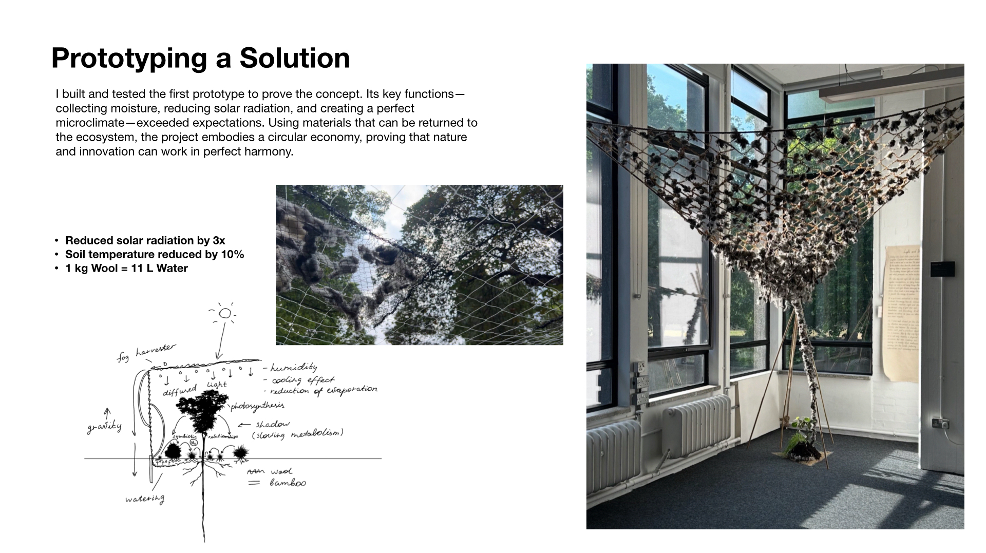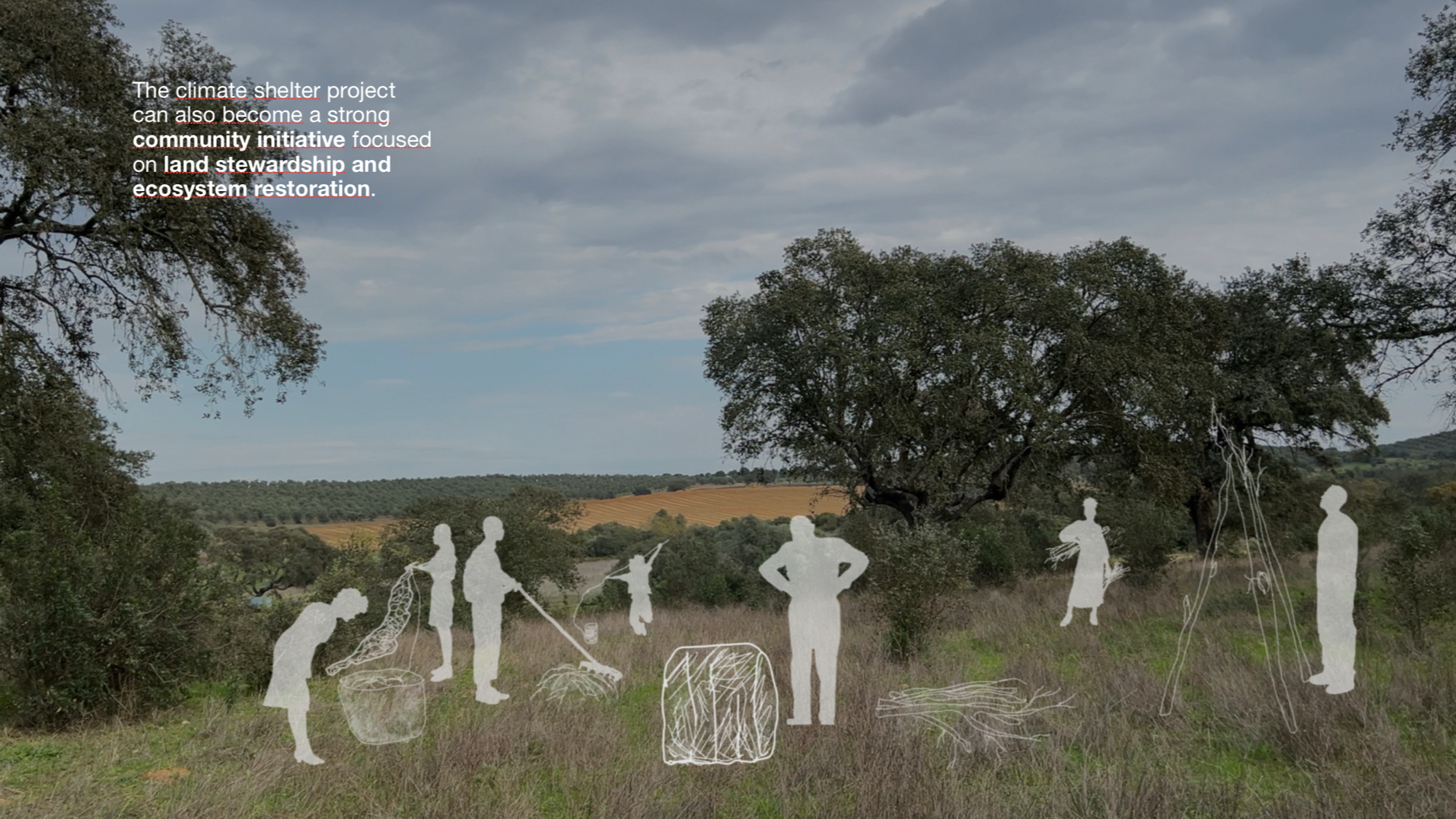 The Smart Eco-Shelter is a textile architecture project from the Royal College of Art, offering an adaptive solution to climate change. Inspired by the ‘mother tree’ concept, it addresses how drought-stricken ecosystems, like Portugal's Montado, fail to protect new saplings. Acting as a 'second canopy,' the shelter uses a unique textile woven with agricultural waste like wool and straw. Its hygroscopic properties collect moisture, while its design cools the microclimate and reduces solar radiation, fostering new life. This project is a tangible promise to restore harmony between human design and the natural world, nurturing life for future generations.