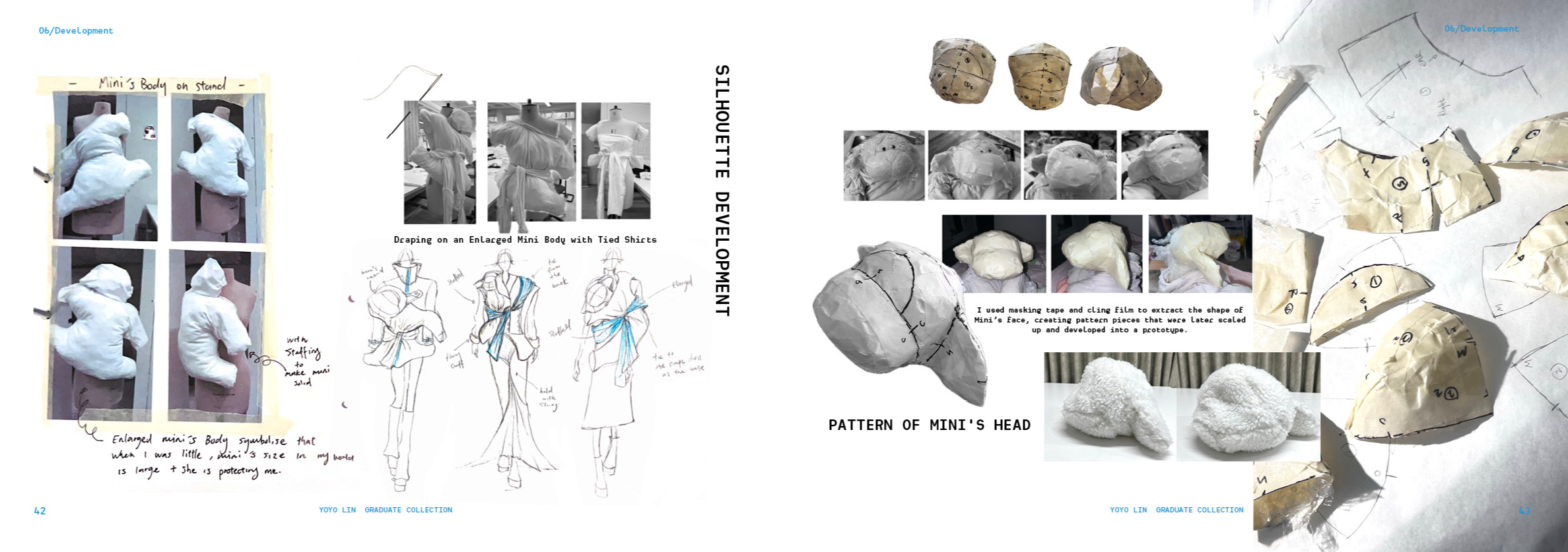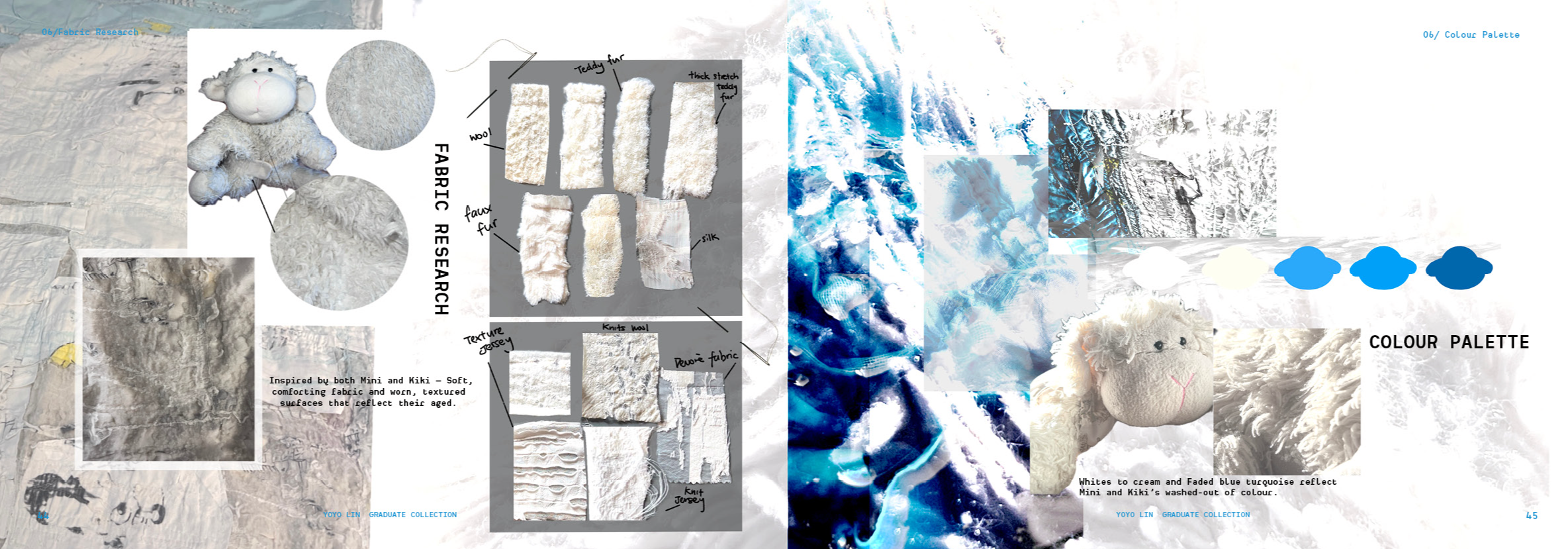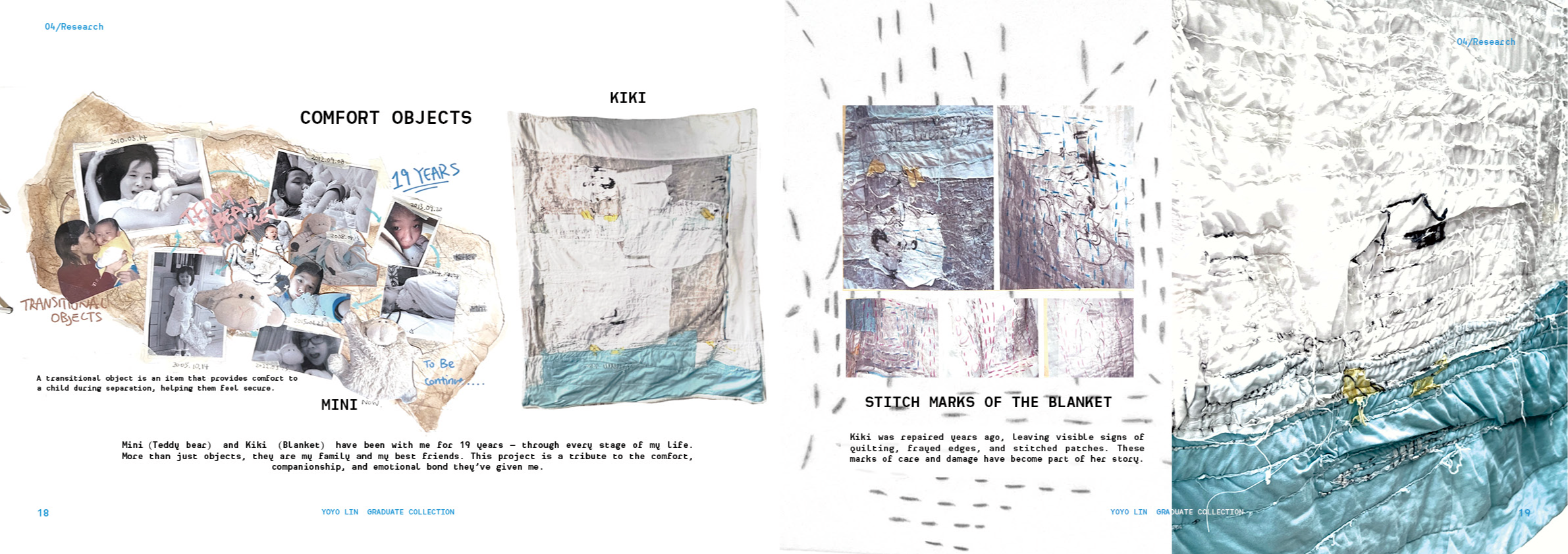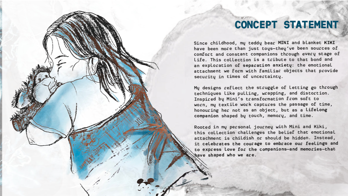 My designs reflect the struggle of letting go through techniques like pulling, wrapping, and distortion. Inspired by Mini’s transformation from soft to worn, my textile work captures the passage of time, honouring her not as an object, but as a lifelong companion shaped by touch, memory, and time. Rooted in my personal journey with Mini and Kiki, this collection challenges the belief that emotional attachment is childish or should be hidden. Instead, it celebrates the courage to embrace our feelings and to express love for the companions—and memories—that have shaped who we are.