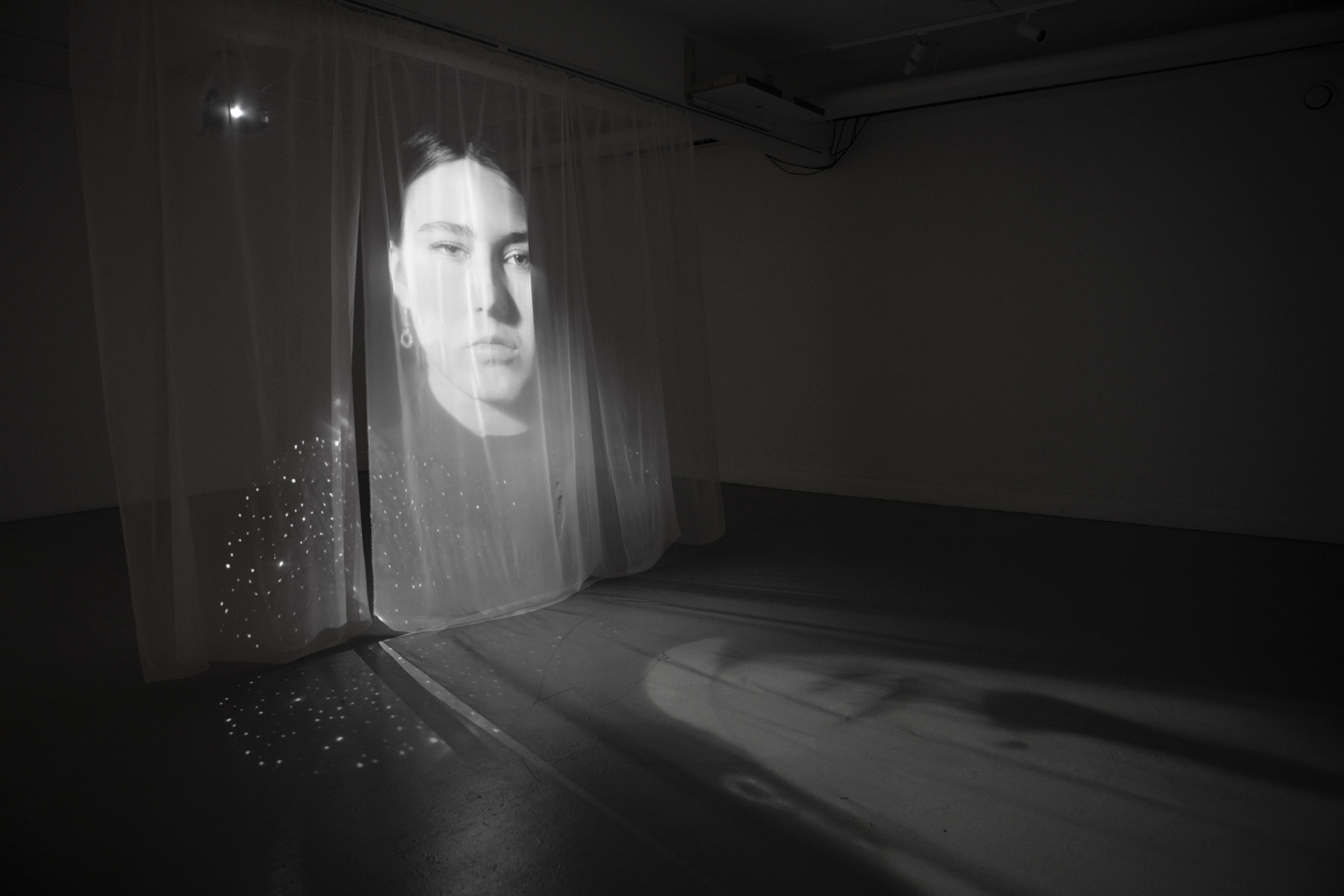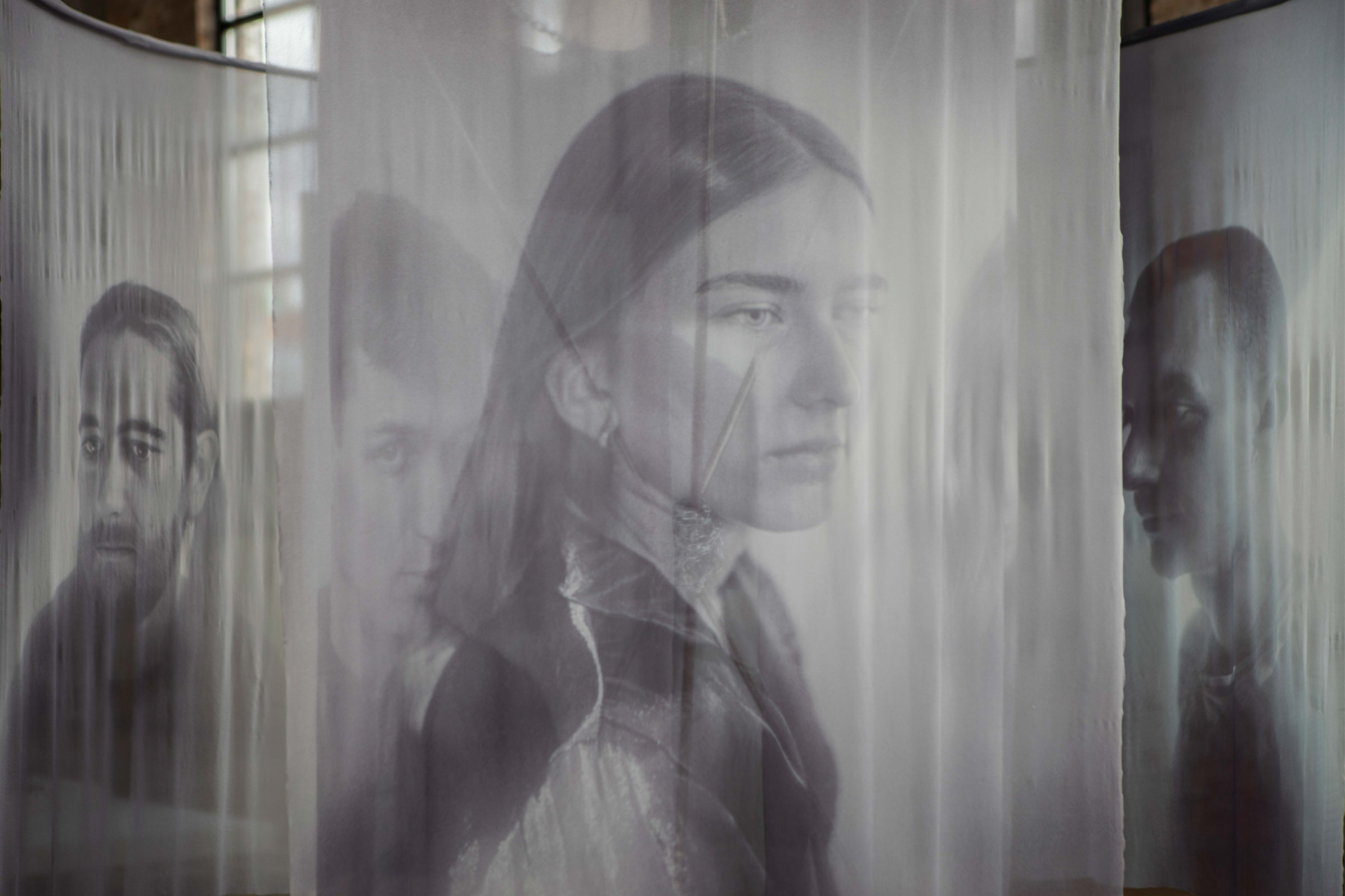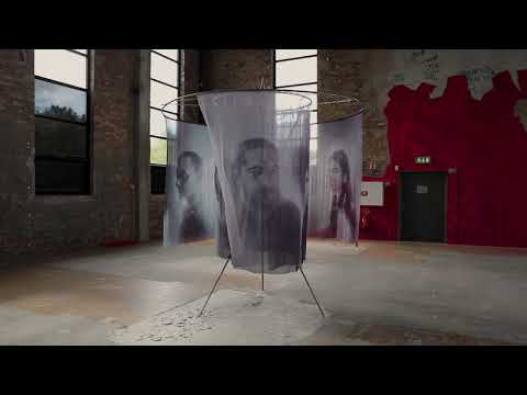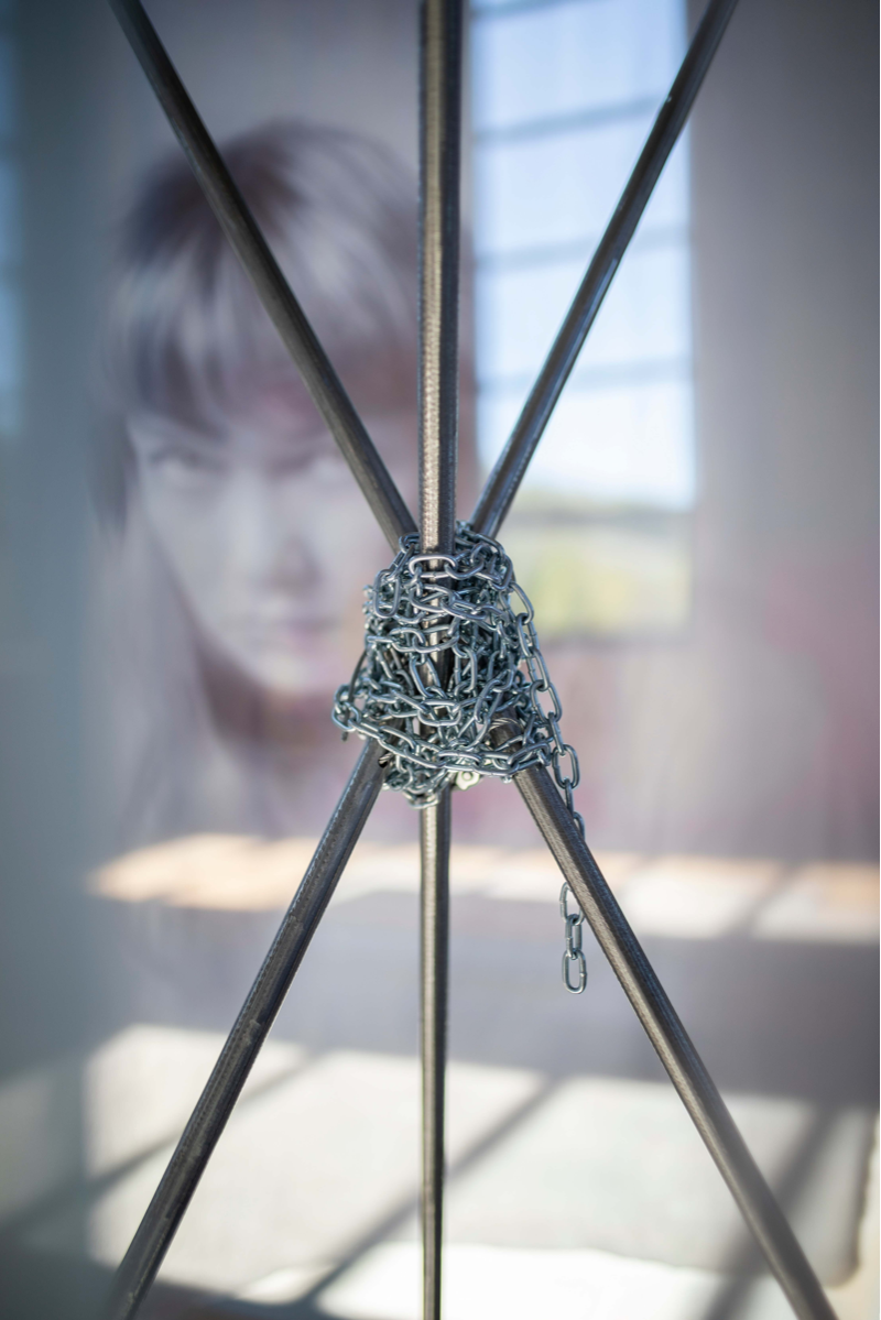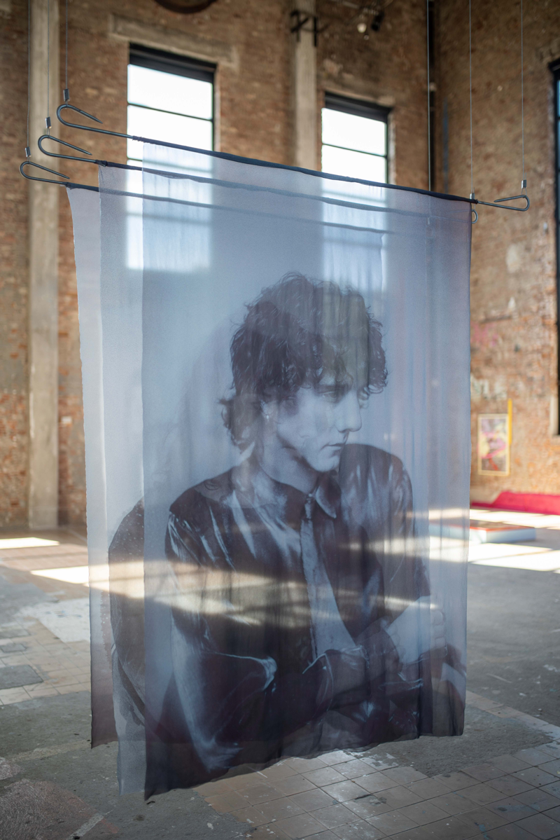 Digital prints with reactive ink on transparent silk, welded and ground steel Stained pine frames, motion detectors connected to fans through Air-duinos Film: 17 min, 22 sec. sound from Drunkna I Ljus by Hugo Randulv Hilda Randulv’s Sunk in a Sea of Silver (2025), exhibited at Röda Sten Konsthall and Gallery Rotor2, is a multimedia work rooted in her childhood experiences with epilepsy and drifting in and out of consciousness. Her fascination with the interplay between presence and absence appears in facial expressions that seem to vanish, emphasizing the subtlety of microexpressions. Interactive elements complicate the viewer’s perception of the subject, mirroring how external events triggered attacks that blurred her awareness and surroundings — moments she, as both the experiencer and artist, cannot remember yet wishes to understand. Custom-built frames, equipped with hidden fans activated by motion sensors, respond to the viewer’s presence by setting the fabric in motion. The fabric’s transparency allows images and projections to overlap, producing an unstable surface of vision. A film projection with sound adds another layer, flickering between intimacy and distance. The polished metal structure reflects light in sharp flashes, recalling the disorienting, strobe-like effect of lamps that can trigger epileptic episodes. Together, these elements extend the dialogue between presence and absence, echoing the fragility of attention and the instability of perception. Working within slow art, Randulv employs a twelve-step printing technique refined since 2021, combining analog photography with digital printing on self-prepared fabric. Each step of the work is executed by hand, including welding, grinding, and bending steel, deepening her connection to the materials and their symbolic meanings.