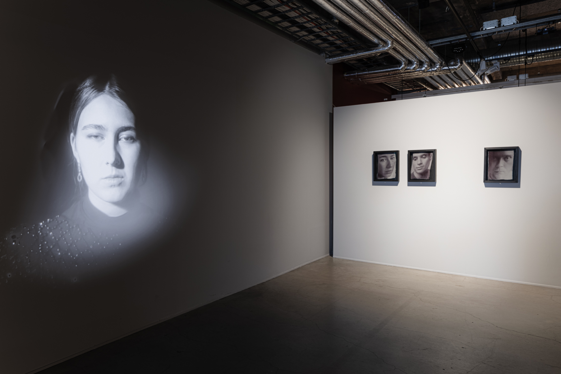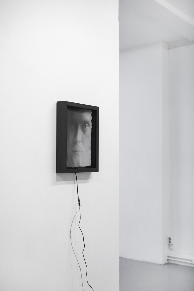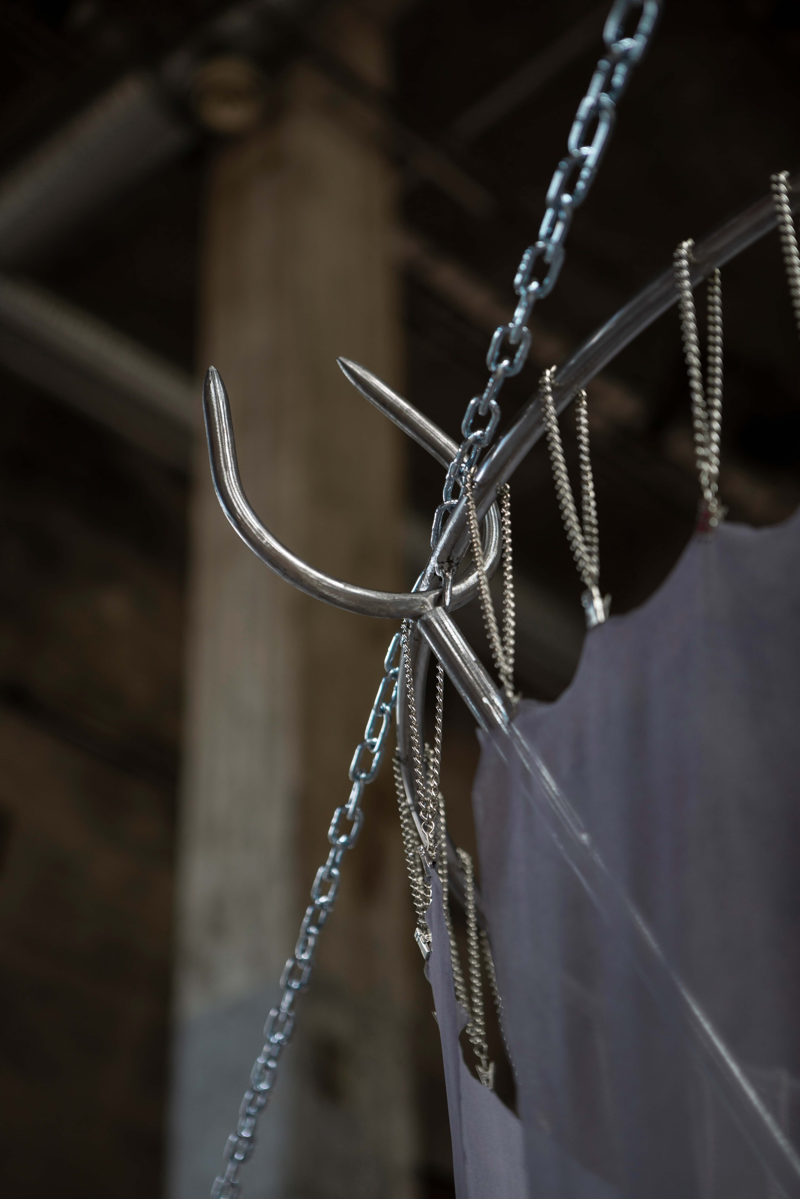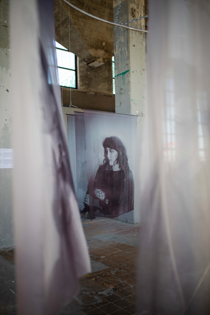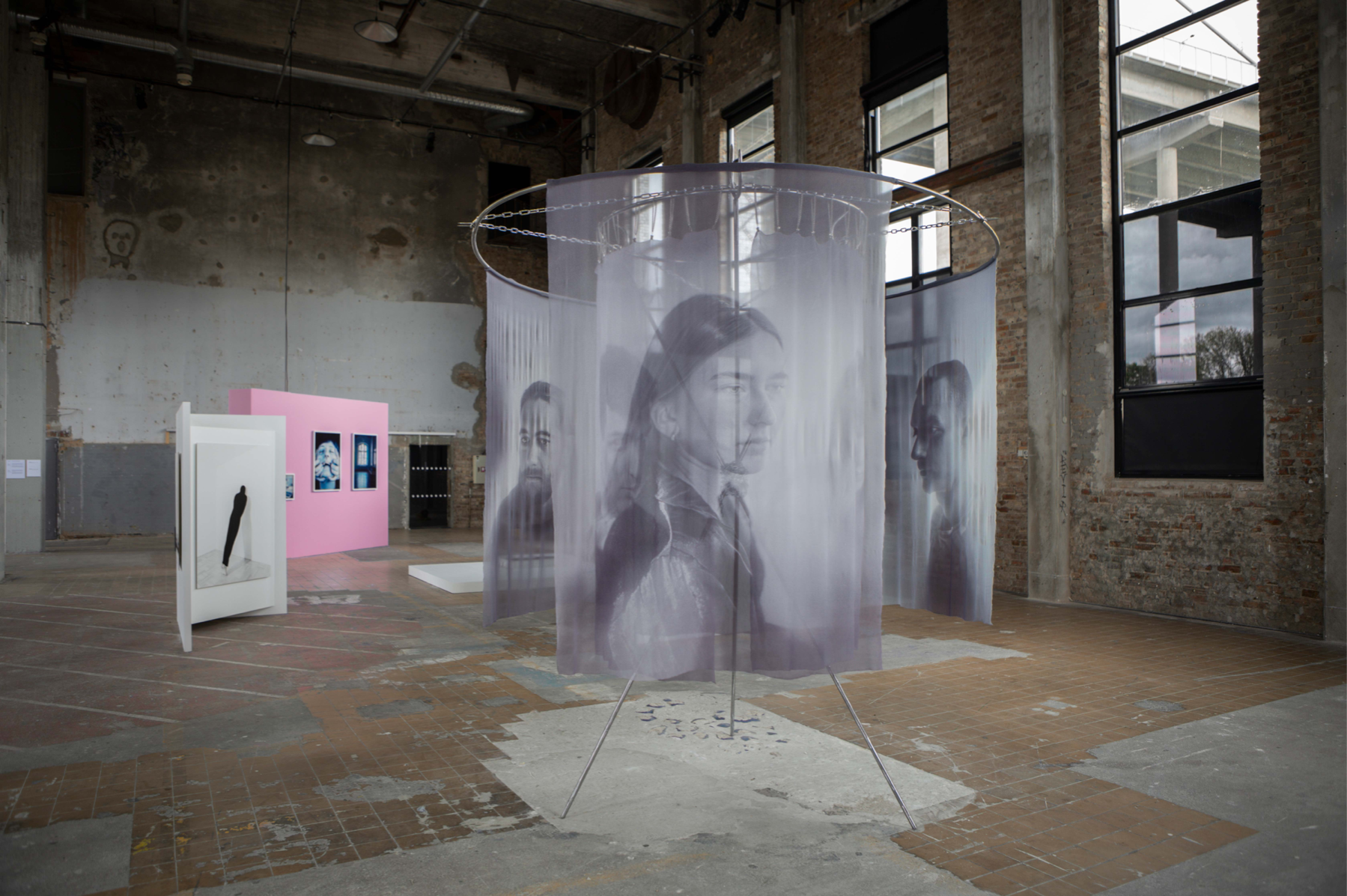 Digital prints with reactive ink on transparent silk, welded and ground steel Stained pine frames, motion detectors connected to fans through Air-duinos Film: 17 min, 22 sec. sound from Drunkna I Ljus by Hugo Randulv Hilda Randulv’s Sunk in a Sea of Silver (2025), exhibited at Röda Sten Konsthall and Gallery Rotor2, is a multimedia work rooted in her childhood experiences with epilepsy and drifting in and out of consciousness. Her fascination with the interplay between presence and absence appears in facial expressions that seem to vanish, emphasizing the subtlety of microexpressions. Interactive elements complicate the viewer’s perception of the subject, mirroring how external events triggered attacks that blurred her awareness and surroundings — moments she, as both the experiencer and artist, cannot remember yet wishes to understand. Custom-built frames, equipped with hidden fans activated by motion sensors, respond to the viewer’s presence by setting the fabric in motion. The fabric’s transparency allows images and projections to overlap, producing an unstable surface of vision. A film projection with sound adds another layer, flickering between intimacy and distance. The polished metal structure reflects light in sharp flashes, recalling the disorienting, strobe-like effect of lamps that can trigger epileptic episodes. Together, these elements extend the dialogue between presence and absence, echoing the fragility of attention and the instability of perception. Working within slow art, Randulv employs a twelve-step printing technique refined since 2021, combining analog photography with digital printing on self-prepared fabric. Each step of the work is executed by hand, including welding, grinding, and bending steel, deepening her connection to the materials and their symbolic meanings.