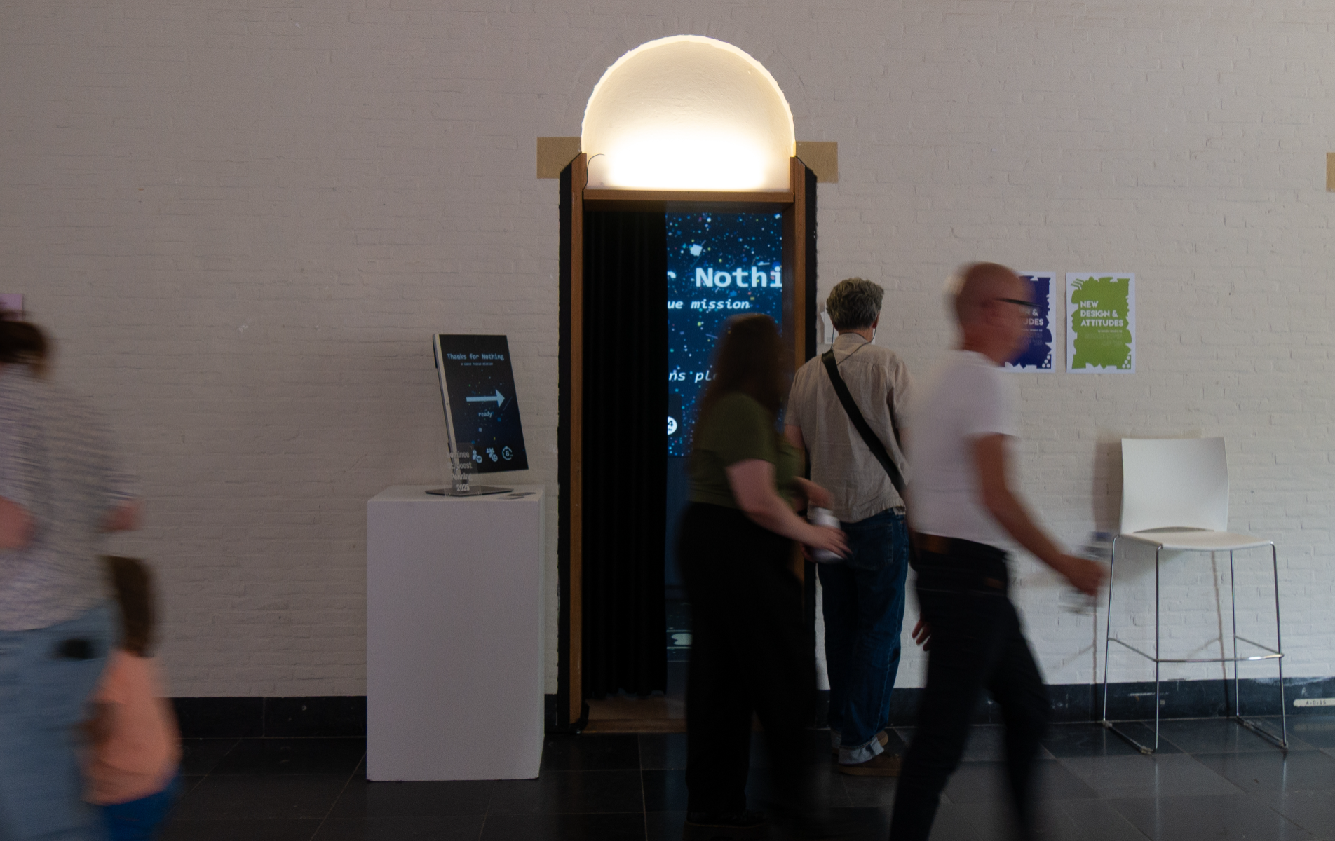 Thanks for Nothing is an 8-minute immersive installation that places the visitor in a fictional world shaped by atmospheric visuals, immersive audio, and moral uncertainty. As part of a narrative voice-guided experience, visitors step into the role of a rescue agent and are confronted with ethical dilemmas — situations with no obvious right or wrong. The story unfolds across all surrounding walls through projection, animation and voice-over, while the physical setup remains intentionally small and intimate. This creates a safe, personal space that encourages intuitive and honest decision-making — free from external judgment. The dilemmas presented ask not what is “correct,” but what feels true to you in the moment. How much are you willing to sacrifice to help someone else? The experience reveals how your decisions reflect your personal values, inviting you to consider what your choices say about who you are. In an age where quick judgments and polarised opinions dominate public spaces, this project creates a pause — a space to practice moral reflection without external noise. Confrontation is not avoided, but carefully staged as something constructive and intimate. Thanks for Nothing is a reflection on individualism, empathy, and how we act when we are invited to choose freely — without pressure, and guided only by our own intuition. Nominated for the St. Joost Penning 2025