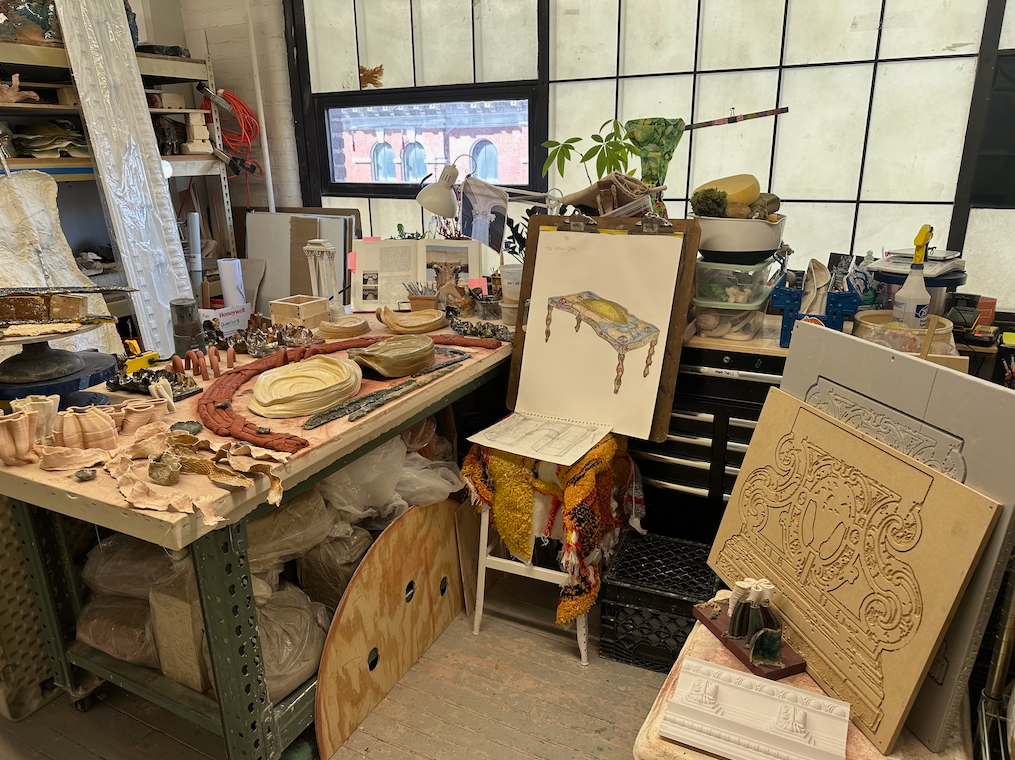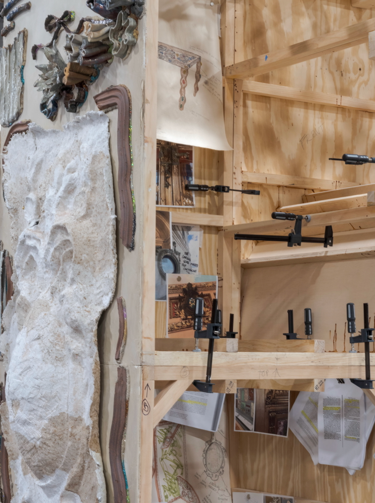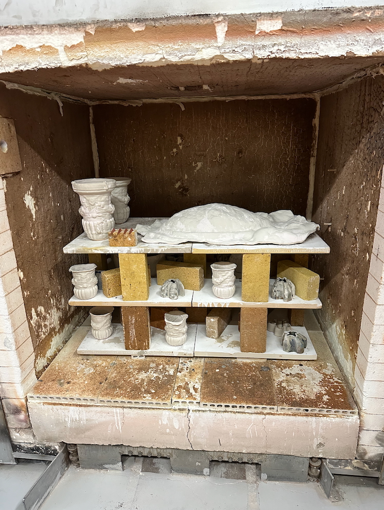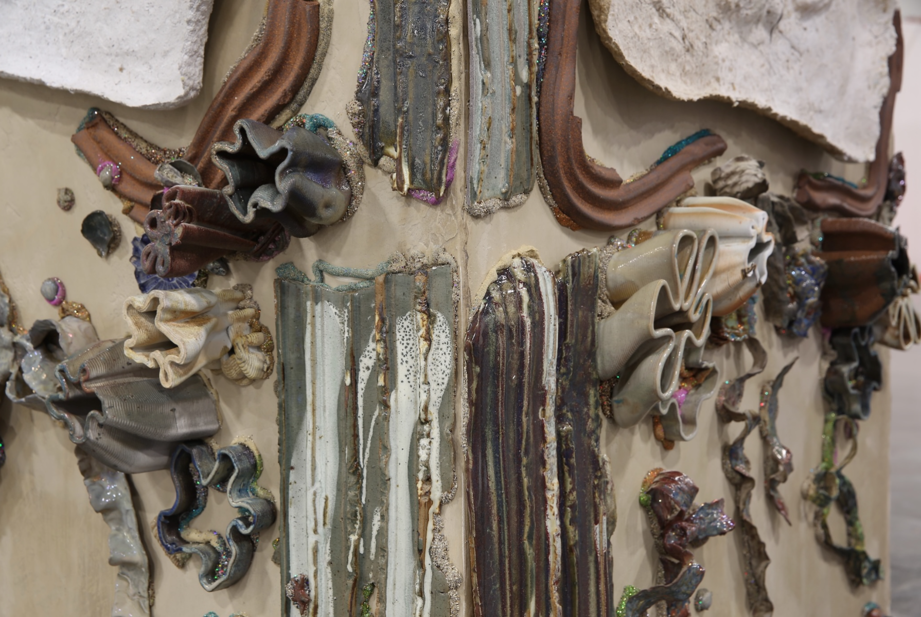 Ana Popescu (b. 1988) is a Romanian-American, multi-disciplinary artist currently living in Providence, Rhode Island. After receiving her BFA from Pratt Institute, Ana co-founded an immersive underground event company in NYC where, under the moniker A.Pop, she designed and produced site-specific art installations, and curated a roster of local performance artists for each thematic event. She continued to grow her production career from there, leading large-scale, high-profile branded productions across the US for various prominent advertising agencies based in NYC. One positive outcome of the pandemic was the opportunity for Ana to focus more deeply on her fine art practice. She earned the Friends of Arrowmont Scholarship and the Trudy and Henry Gillette Sculpture Scholarship for the 148th Regular Session at the Art Students League of New York in 2022. In 2023, she completed a residency at the Watershed Center for Ceramic Arts, followed by the Anderson Ranch Scholarship in 2024. Ana received her MFA in Ceramics from the Rhode Island School of Design in 2025, where she was awarded the RISD Fellowship, the Windgate Foundation Scholarship, the RISD Graduate Ceramic Award, and the Graduate Ceramic Residency. She has exhibited her work in over two dozen exhibitions across New York City, Bucharest, and Providence, Rhode Island. My practice explores the tensions and contradictions that shape identity, memory, and perception. As an immigrant from communist-era Romania raised in the hyper-ornamented sprawl of suburban Florida, I exist between worlds—between austerity and excess, mythology and fact, survival and comfort. This in-betweenness is both a site of inquiry and a source of creation. Whether working in large immersive installations or object-based sculptural works, I draw from the historical forms, scale, and energy of monuments, ruins, and maximalist decorative motifs—not to replicate them, but to question the ideologies they carry. Ornament becomes a tool for reflection: a language of illusion, power, and embedded narrative. By deconstructing these excessive details, I aim to reveal the scaffolding behind the spectacle—the hidden frameworks that shape how we remember, value, and mythologize. Each piece is built from accumulations of fragments, found materials, ceramics, and cast objects already charged with personal meaning. Through an intuitive process of collecting and embedding, these elements become part of a broader system of remembrance.By combining materials such as wood and ceramic, or fibers and resin, with both old and new processes, I aim to subvert the ornament’s original purpose—allowing a new record to take its place in history. What began as an instinctive impulse to hold onto past spaces soon crystallized into a way of thinking. I began referring to these works as “time capsules”: vessels for memory and transformation, containers of personal history reframed through making. This process is intuitive, guided as much by material response as by conceptual intent. As the work evolves, it absorbs traces of my past, my questions, and my unconscious. Each piece becomes a kind of sealed diary—imprinted with my psyche, layered with contradiction, and offered as both artifact and mirror.