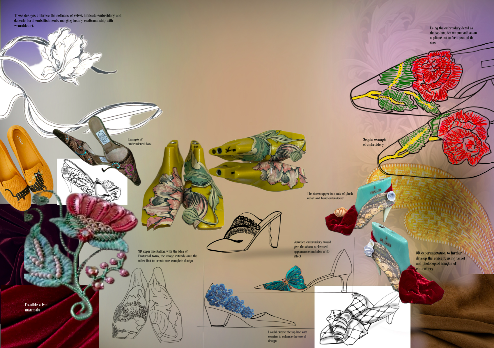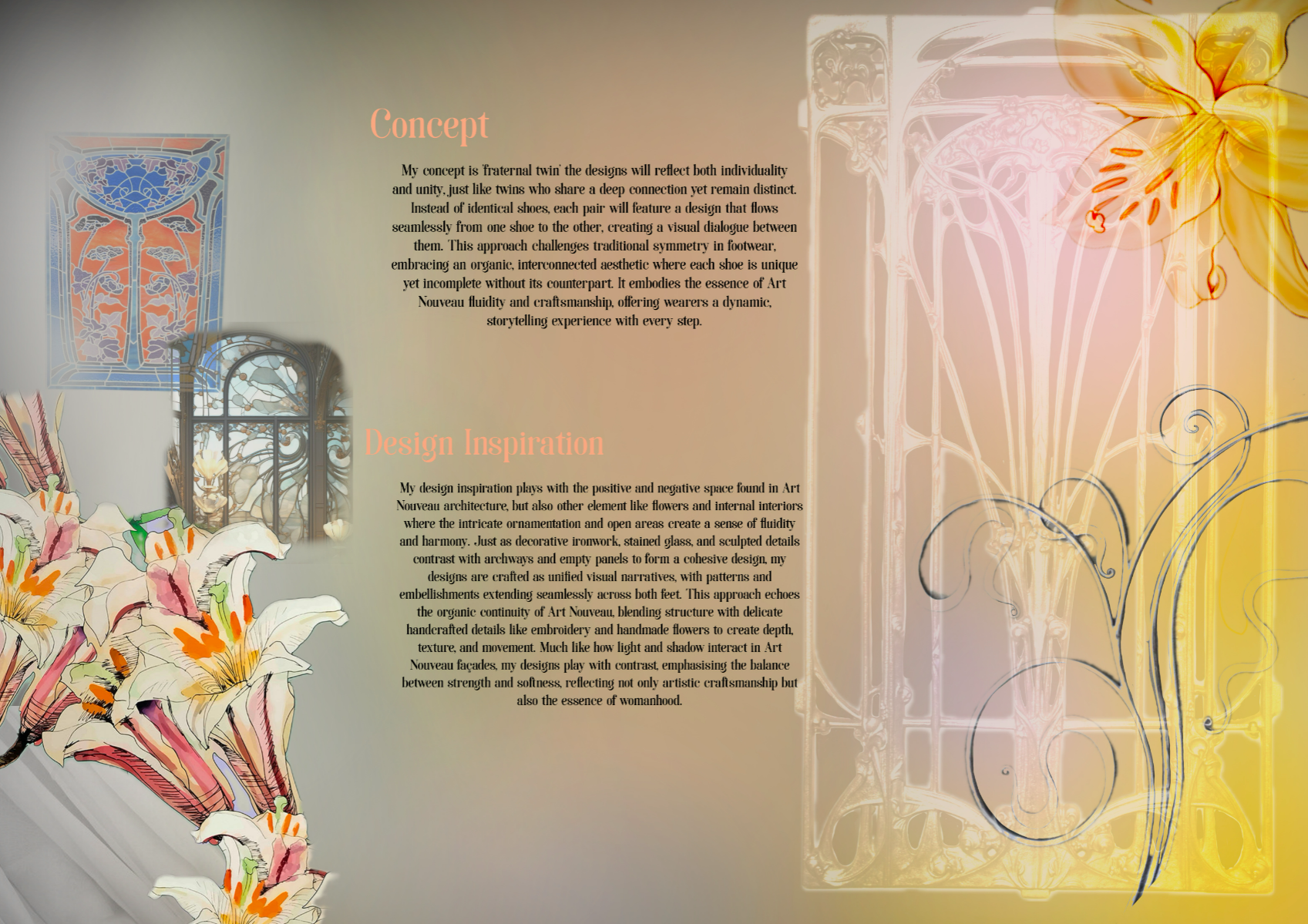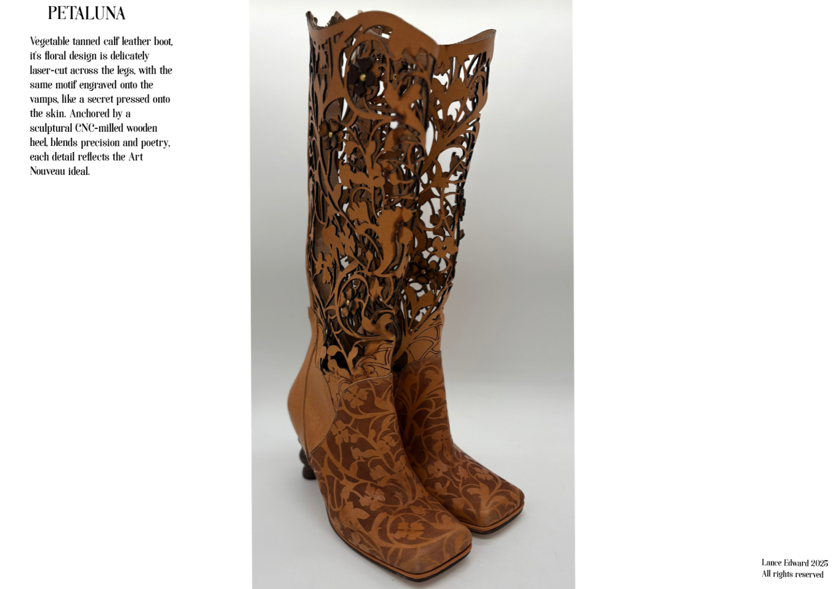 Being an identical twin has made me deeply aware of the tension between sameness and individuality. While my twin and I mirror one another, we are never truly identical, this duality inspires my footwear. I design shoes that reject repetition, instead becoming “fraternal twins” that flow together yet remain distinct. Each pair tells a story across both feet, forming a dialogue rather than a duplication. In contrast to the uniformity of mass production, my work celebrates difference, craftsmanship, and the beauty of imperfection. Through this approach, I aim to challenge conventions and offer footwear that feels both personal and poetic.