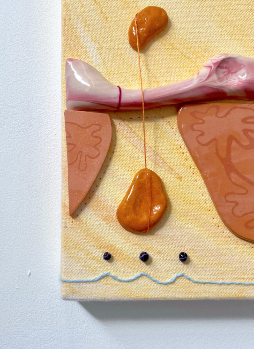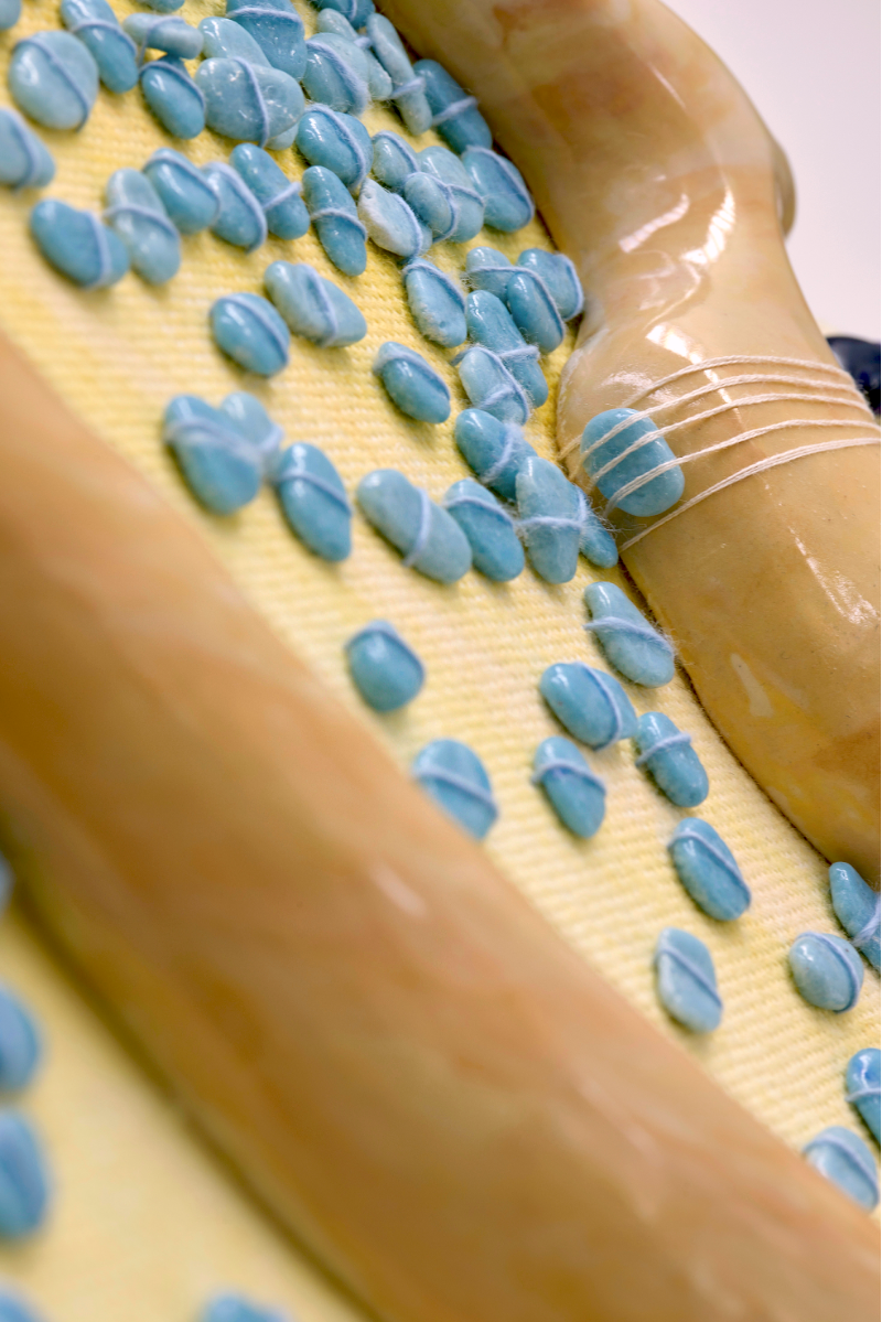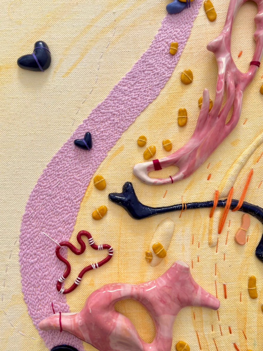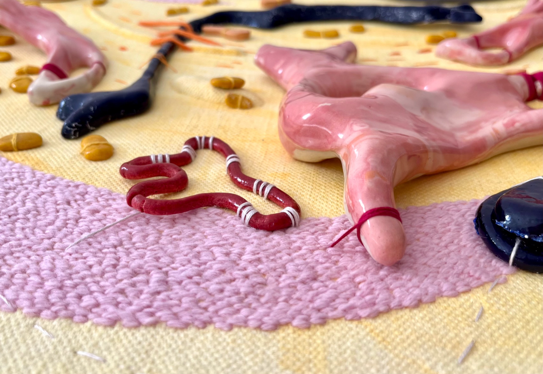 The Cyclical Nature of Trying to Add Something New to Your Brain is a ceramic/textile/painting, materially discovering the connections that can be made between ceramic, stitch and fabric. Through the marbled pinks/reds/white slipped ceramics, blue/yellow pebble-like Egyptian paste, thread winds its way through this playground of objects creating a flowing cycle throughout the piece. It explores the world of abstracted biomorphic forms, discovering whether through the use of play, joy can be found for the viewer.