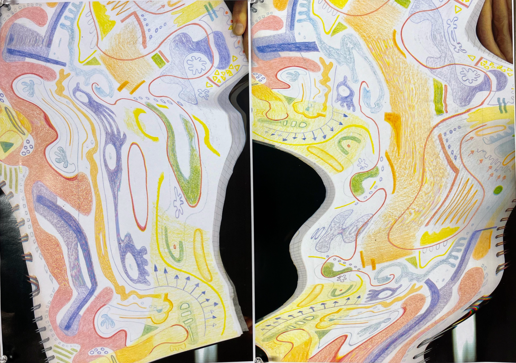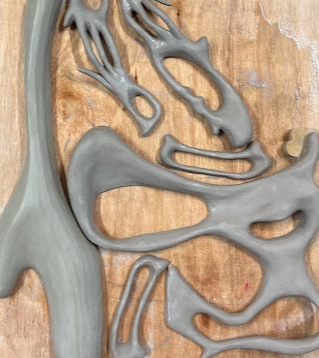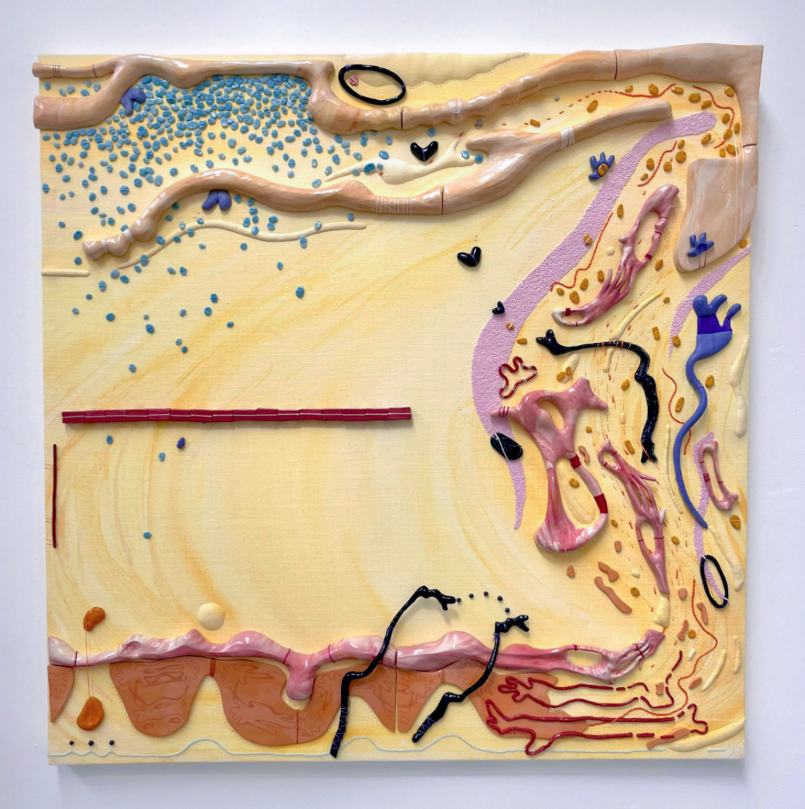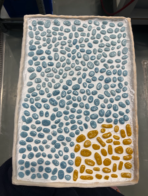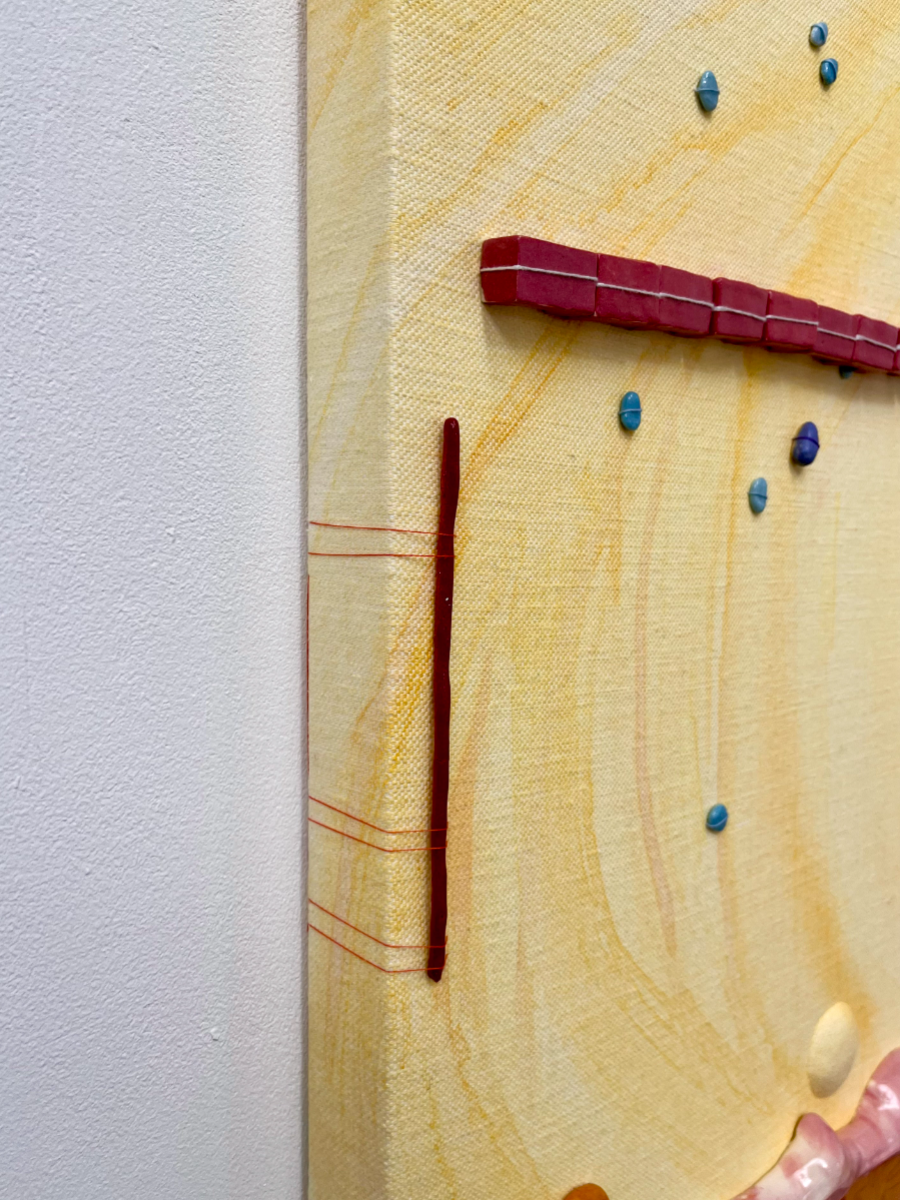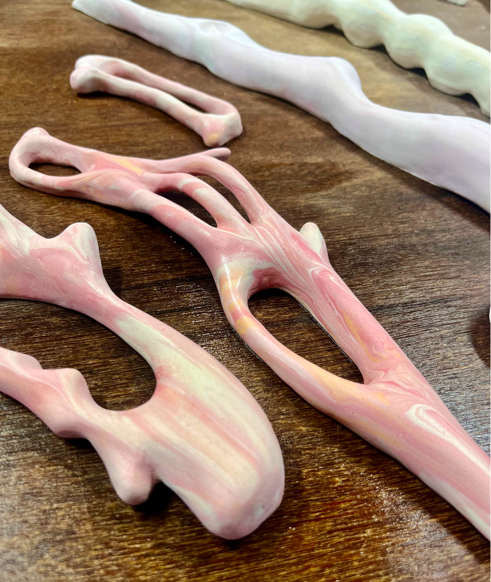 The Cyclical Nature of Trying to Add Something New to Your Brain is a ceramic/textile/painting, materially discovering the connections that can be made between ceramic, stitch and fabric. Through the marbled pinks/reds/white slipped ceramics, blue/yellow pebble-like Egyptian paste, thread winds its way through this playground of objects creating a flowing cycle throughout the piece. It explores the world of abstracted biomorphic forms, discovering whether through the use of play, joy can be found for the viewer.