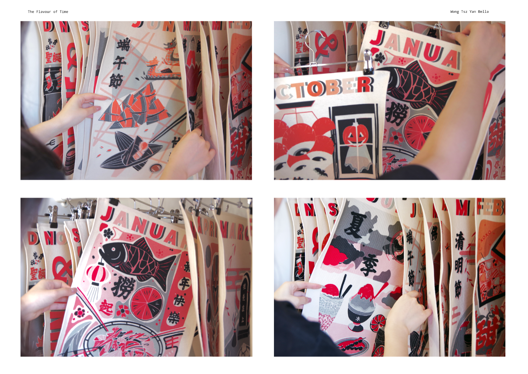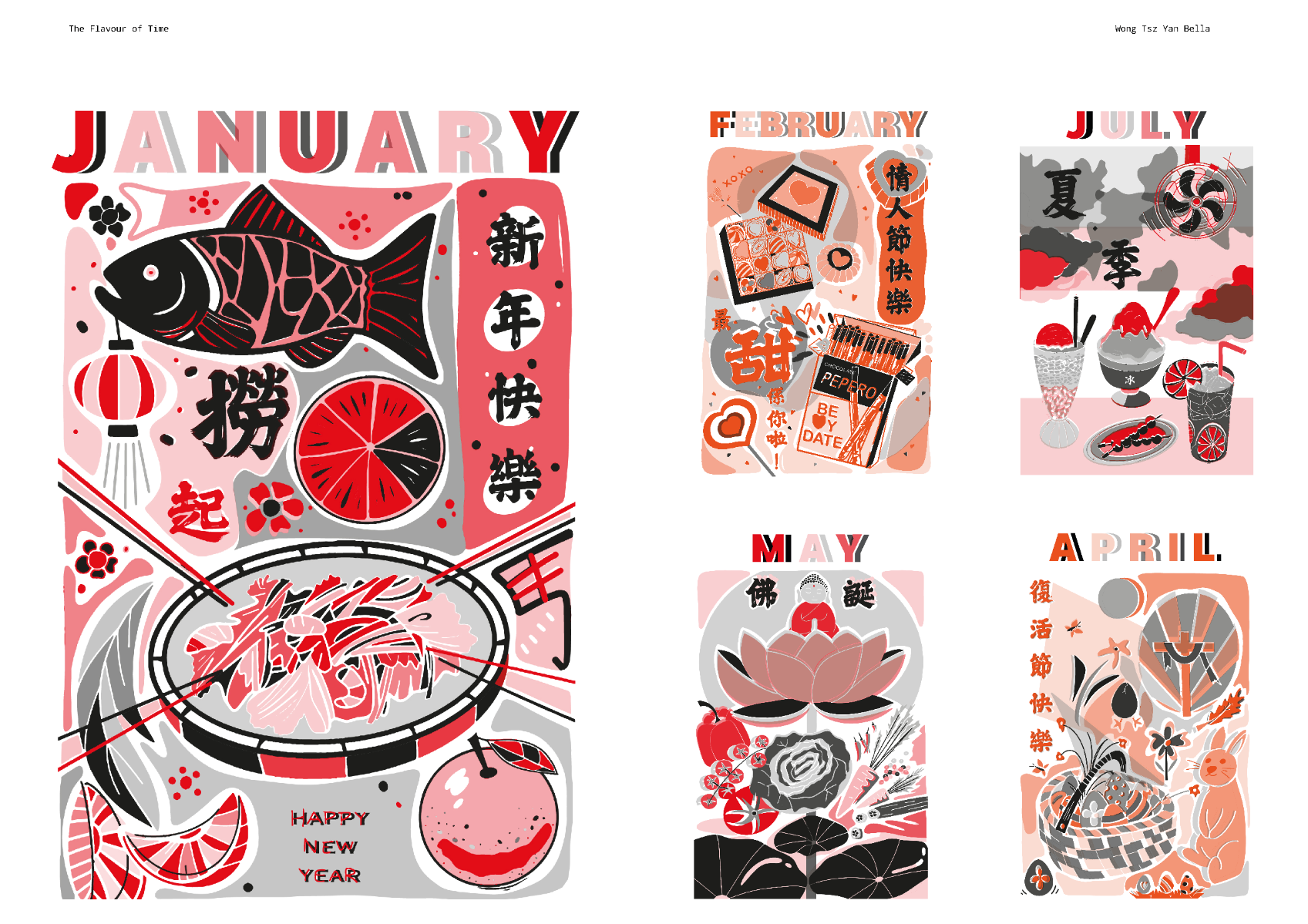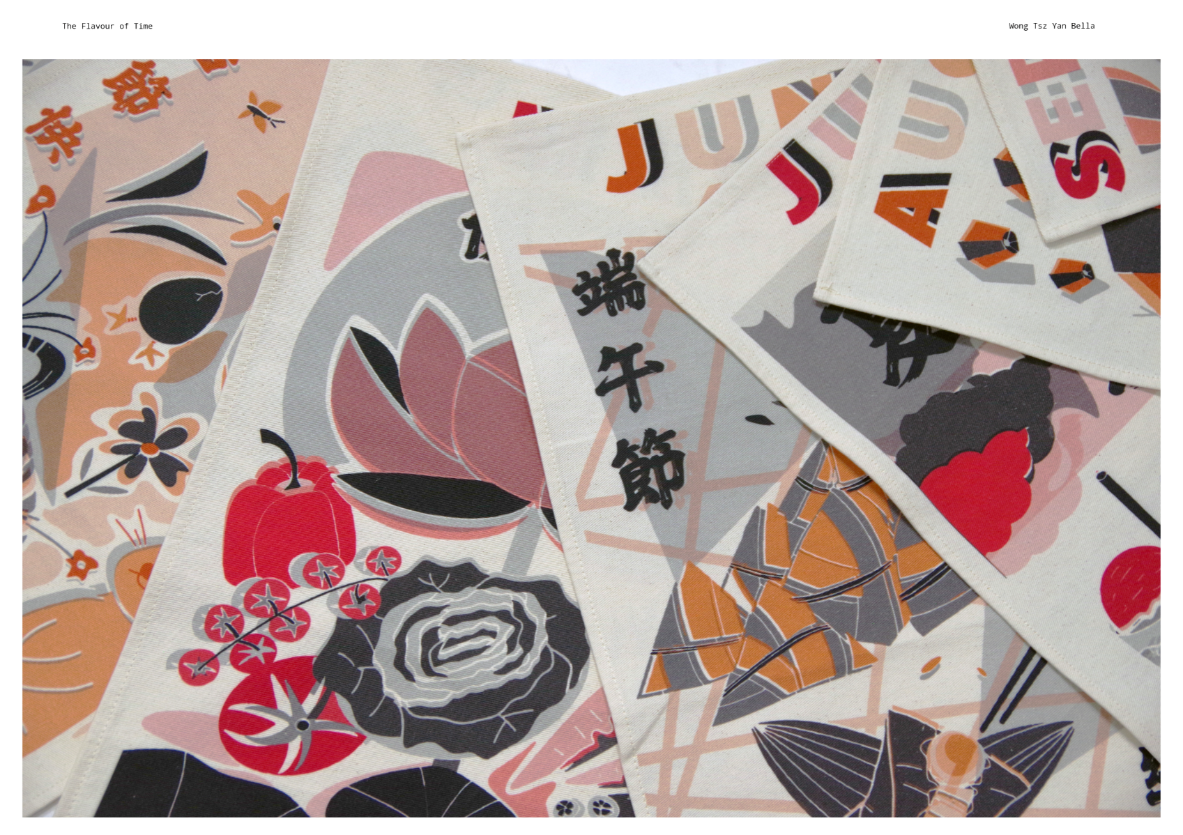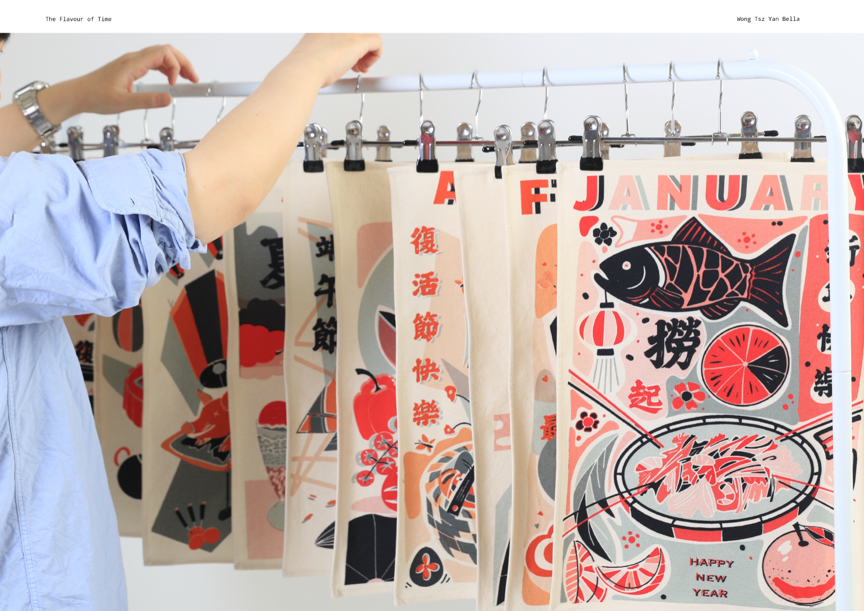 The Flavour of Time is all about bringing festivals into everyday life. I created twelve illustrated tea towels, each one representing a Hong Kong festival tied to its month. I love food, colour, and playful illustration, so the project combines all of that with a bold, risograph-inspired style. The idea is that tea towels are like clothes you can “wear” in each month — functional, timeless, and fun — while also keeping cultural traditions alive. Alongside the teatowel, I also made a standing calendar with tracing paper overlays to tell the story of each festival month by month.