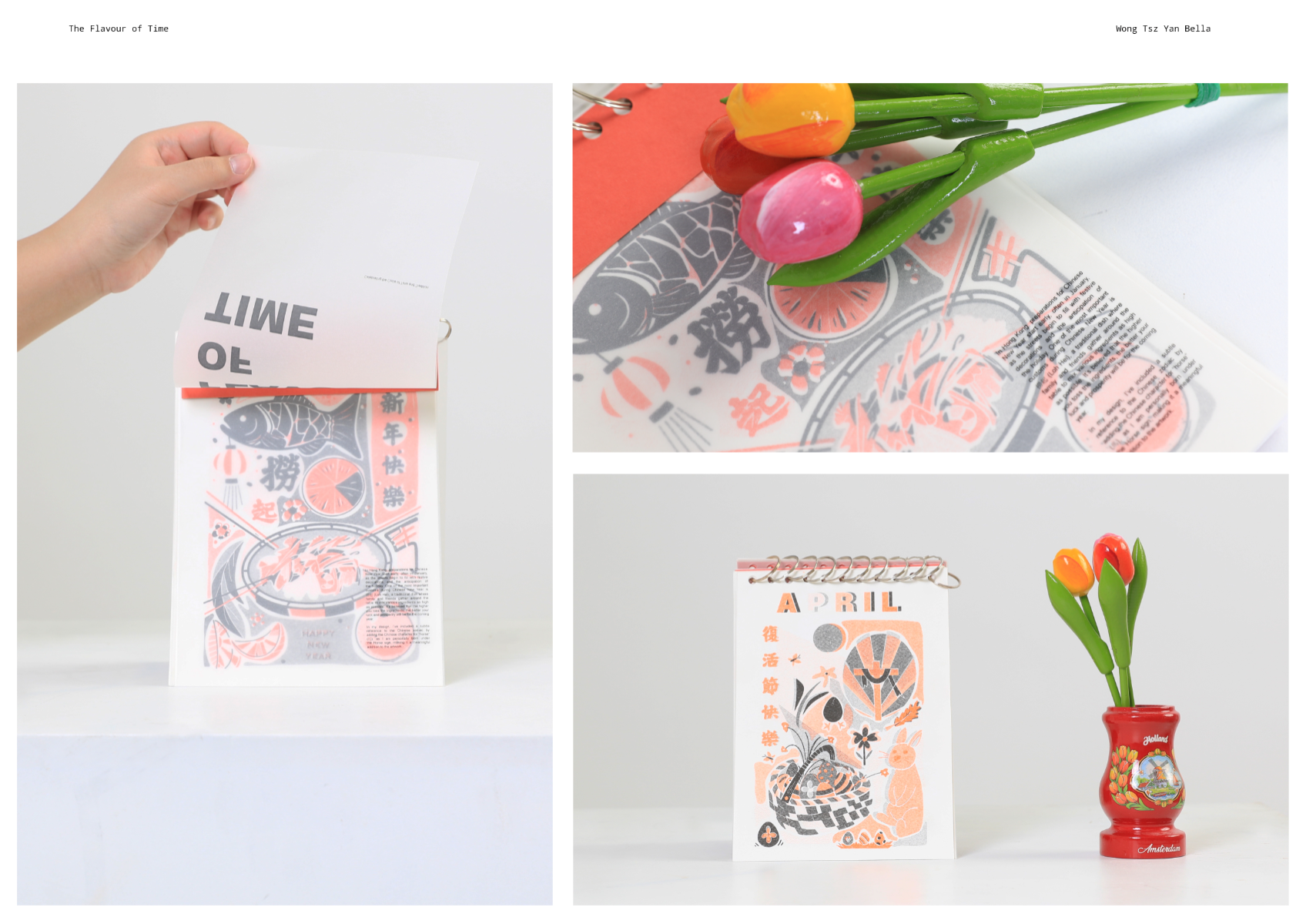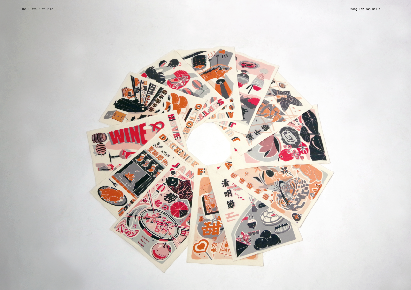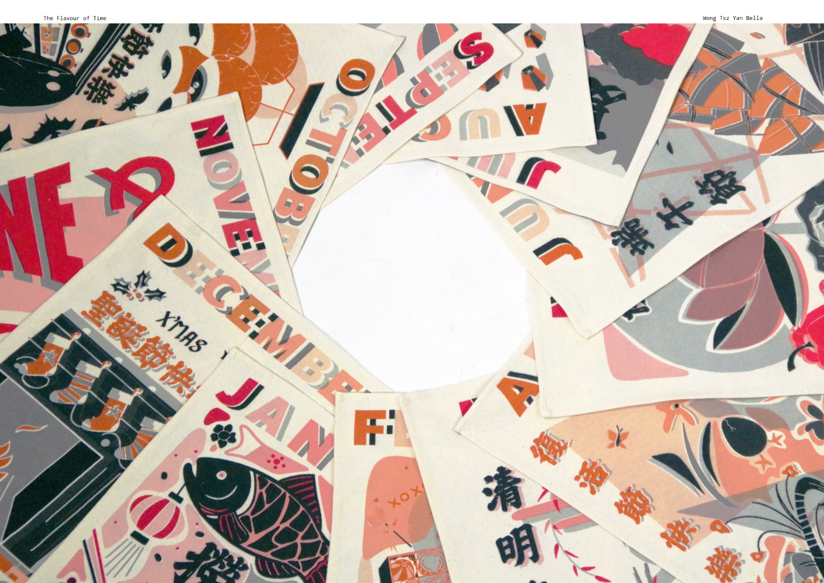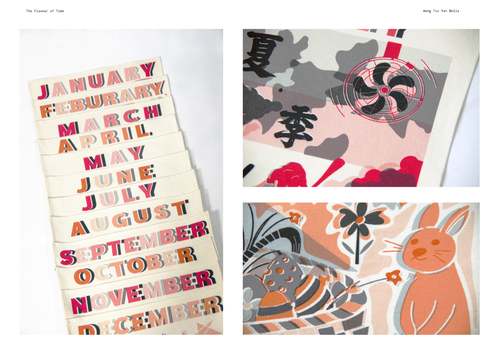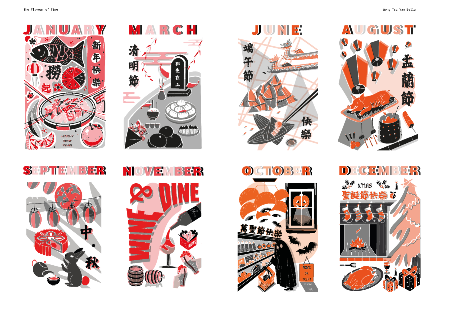 The Flavour of Time is all about bringing festivals into everyday life. I created twelve illustrated tea towels, each one representing a Hong Kong festival tied to its month. I love food, colour, and playful illustration, so the project combines all of that with a bold, risograph-inspired style. The idea is that tea towels are like clothes you can “wear” in each month — functional, timeless, and fun — while also keeping cultural traditions alive. Alongside the teatowel, I also made a standing calendar with tracing paper overlays to tell the story of each festival month by month.