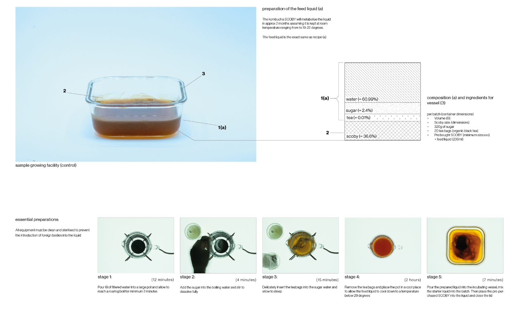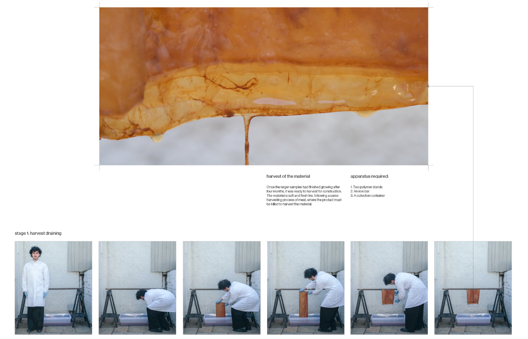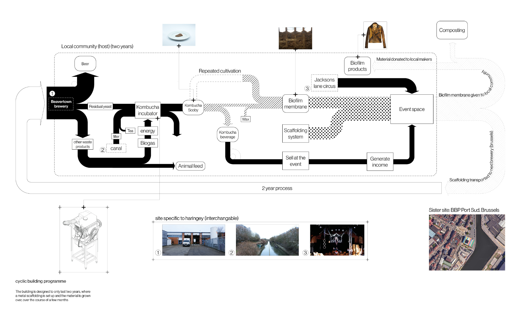 Haringey is at a crossroads. With its rich industrial heritage and vast nature reserves the borough is poised for a spectacle to bring the community together. Waste from the Beavertown Brewery and the disused canal is metabolised by a culture of kombucha bacteria and yeast, transforming it into a cellulose mat. This flesh-like material, once dried becomes a golden translucent leather, that slowly envelopes the scaffolding structure that houses the Jackson’s Lane circus troupe. Spotlights project the acrobats onto the building’s skin, a way of celebrating both the fleshy material of kombucha, the dynamism of the human body and how it moves within the space.