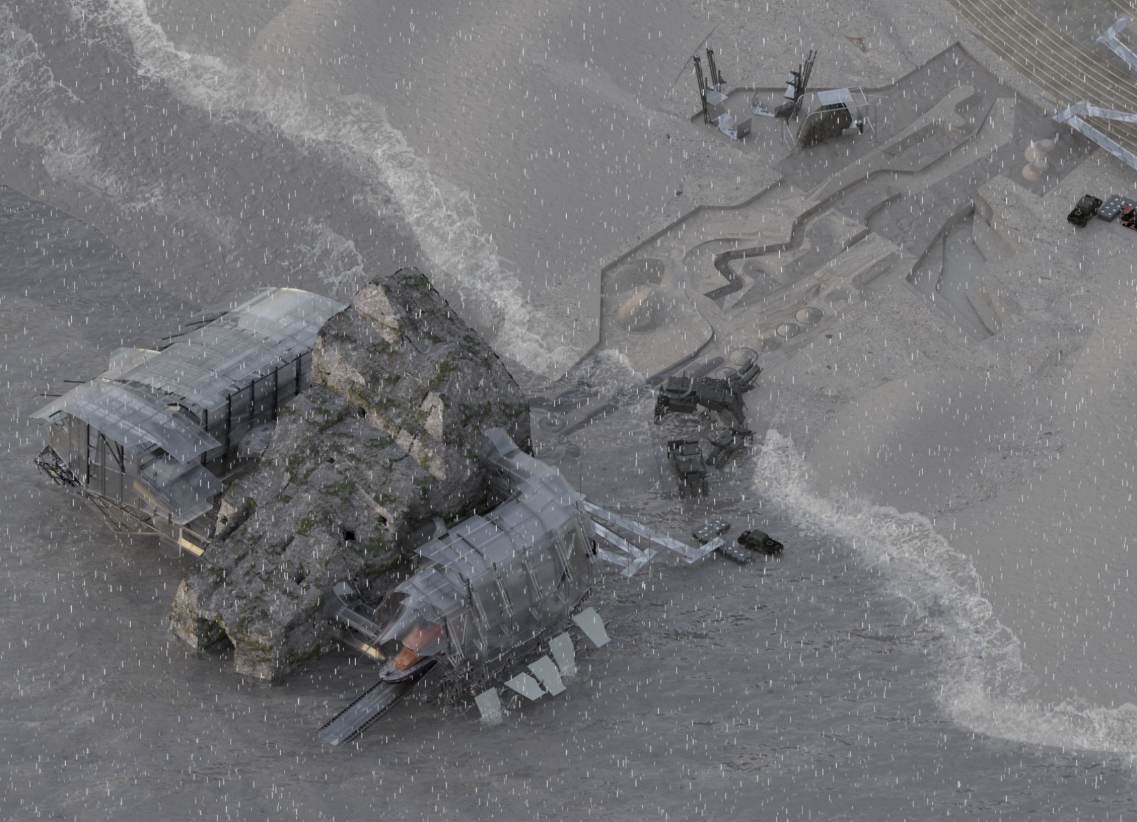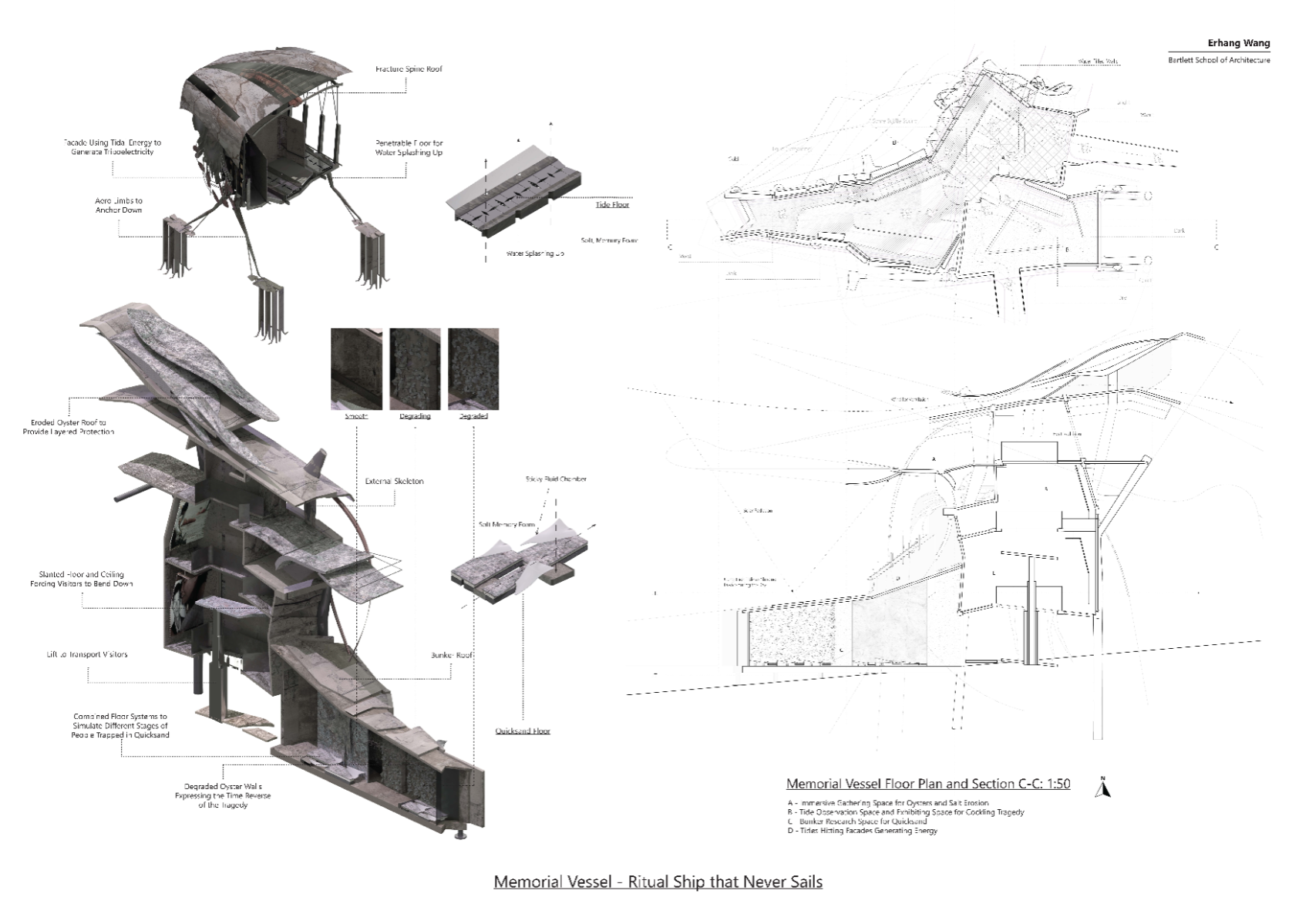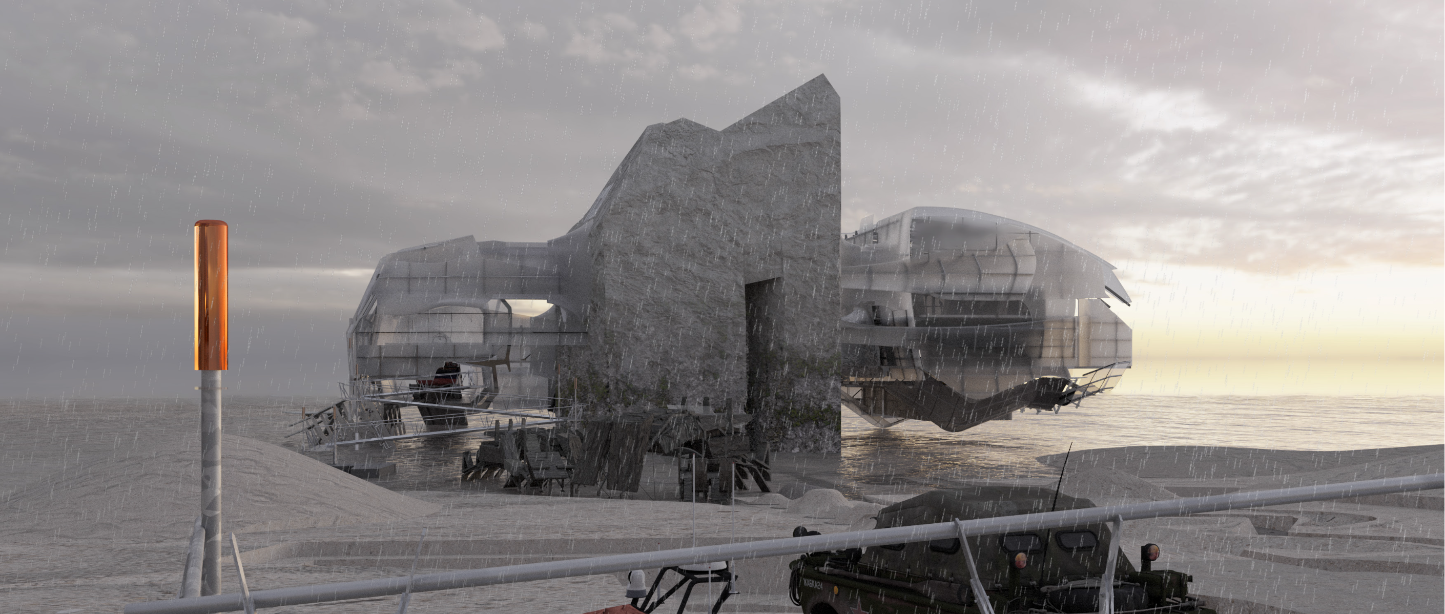 In the winter of 2004, a group of Chinese cockle pickers lost their lives in the cold waters of Morecambe Bay after being caught unaware by fast-rising tides and the bay’s treacherous geographic conditions. Set in Blackpool, North West England, The Lost Boys: It's OK to Cry explores an engineered architecture comprising a memorial to the Morecambe Bay cockling disaster, an RNLI lifeboat station, and a survival training pool. Together, these elements aim to educate coastal communities about marine dangers and raise public awareness of coastal risks. The design responds to Lancashire’s geotrauma—shifting sands and rapid tidal change through three interrelated programmes. The memorial offers a space for Blackpool’s residents and visitors to engage in a Chinese ritual ceremony 20 years on, acting as a symbolic tombstone. The RNLI facilities investigate architectural strategies for coastal resilience. A time-based, episodic design methodology fosters emotionally resonant experiences and repositions Blackpool’s lost generation as lifesavers.