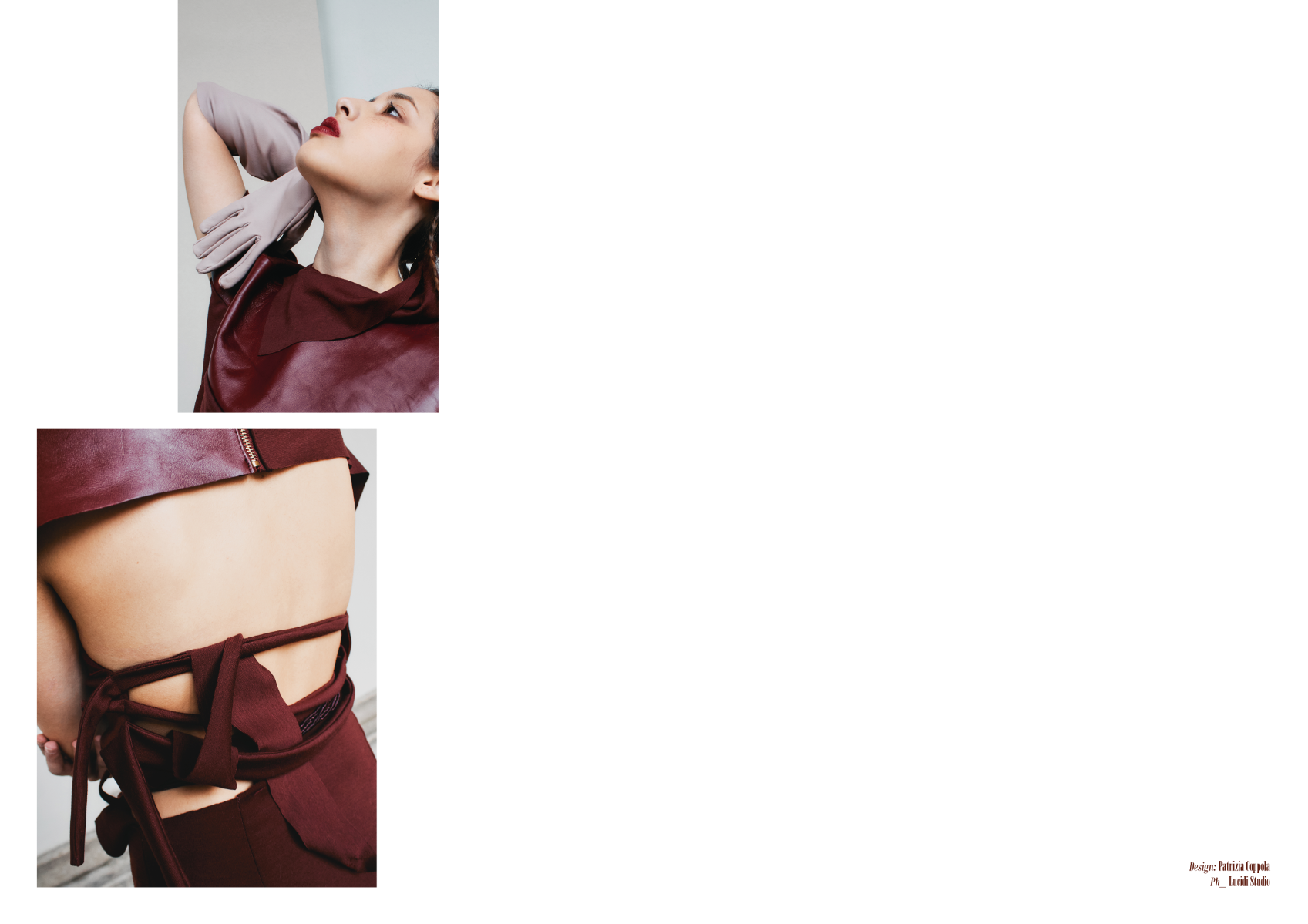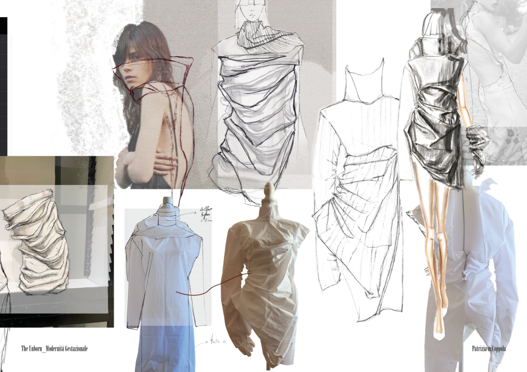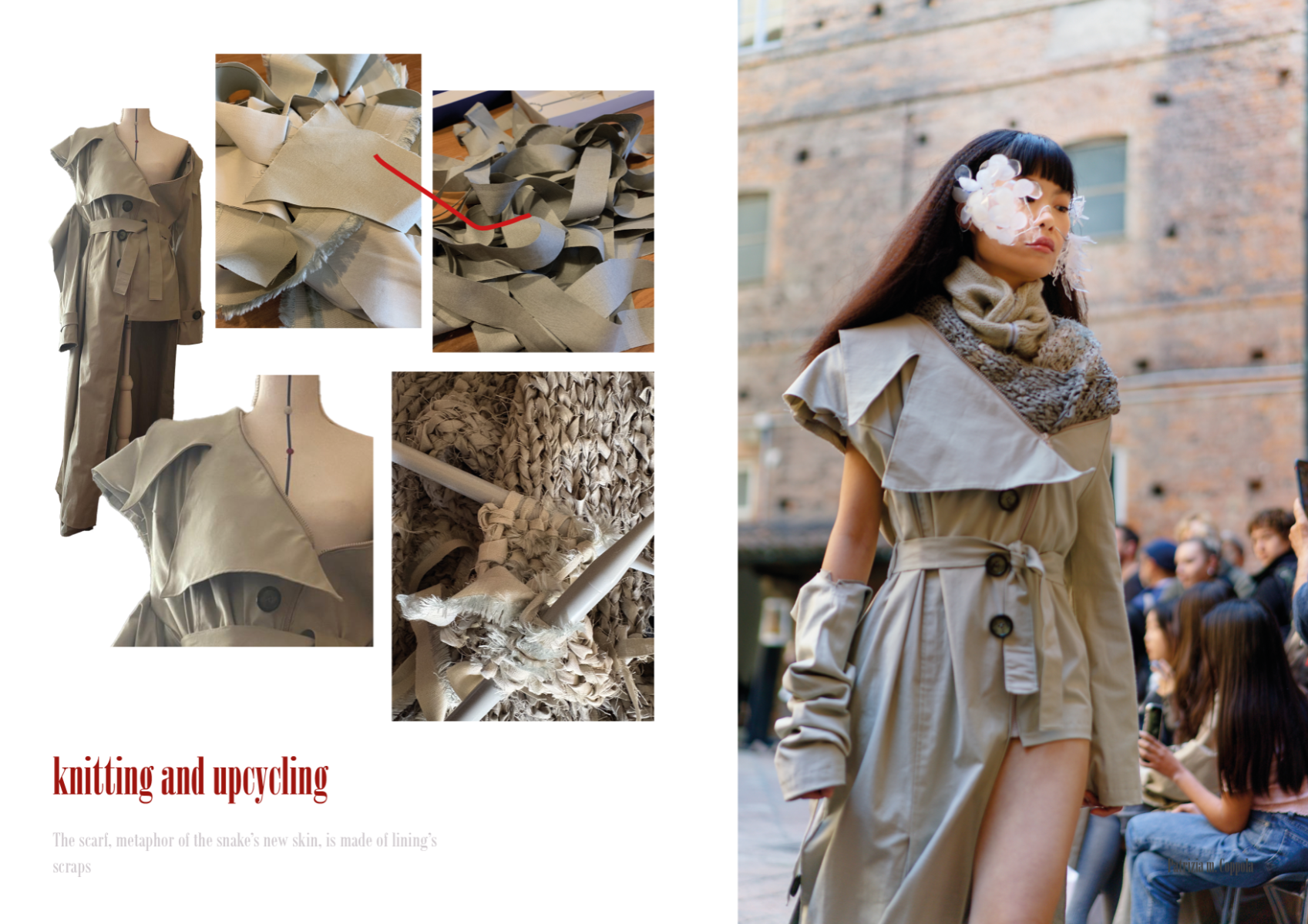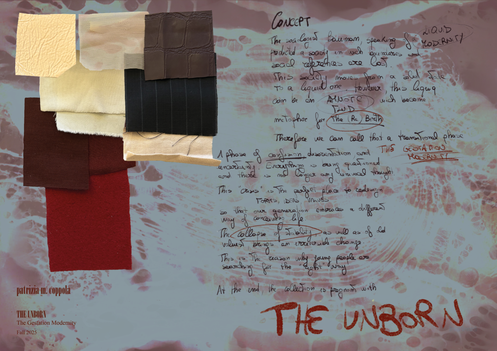 ‘The Unborn: Gestational Modernity’ is rooted in a reflection on contemporary society, inspired by Z. Bauman’s concept of Liquid Modernity. But, in a world marked by uncertainty and constant transformation, the fluid is perceived not as a loss of values but as a fertile environment: an amniotic fluid from which new forms, identities, and values can be born. As a result, the fabrics are manipulated to achieve a more fluid appearance, through draping or unraveling them. The collection embodies this transitional phase: a gestational modernity where everything changes and is going to be defined. So the garments are wearable in different ways, letting anyone to find their own style, through the use of zippers and cords. The garments includes Lineapelle deadstocks and the upcycling use of textile scraps. Visual inspirations range from pictures of exhibitions, contemporary art and vases to the moulting of the snake as a symbol of rebirth.