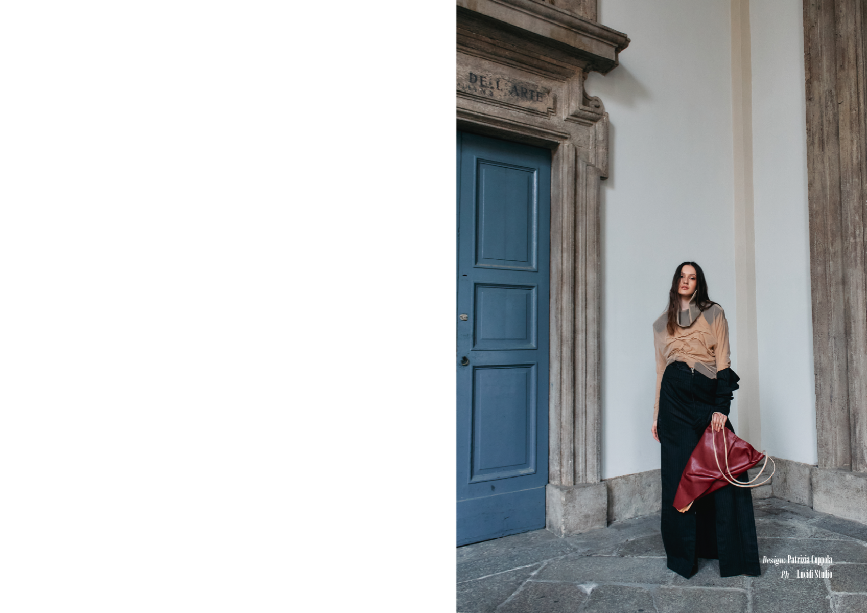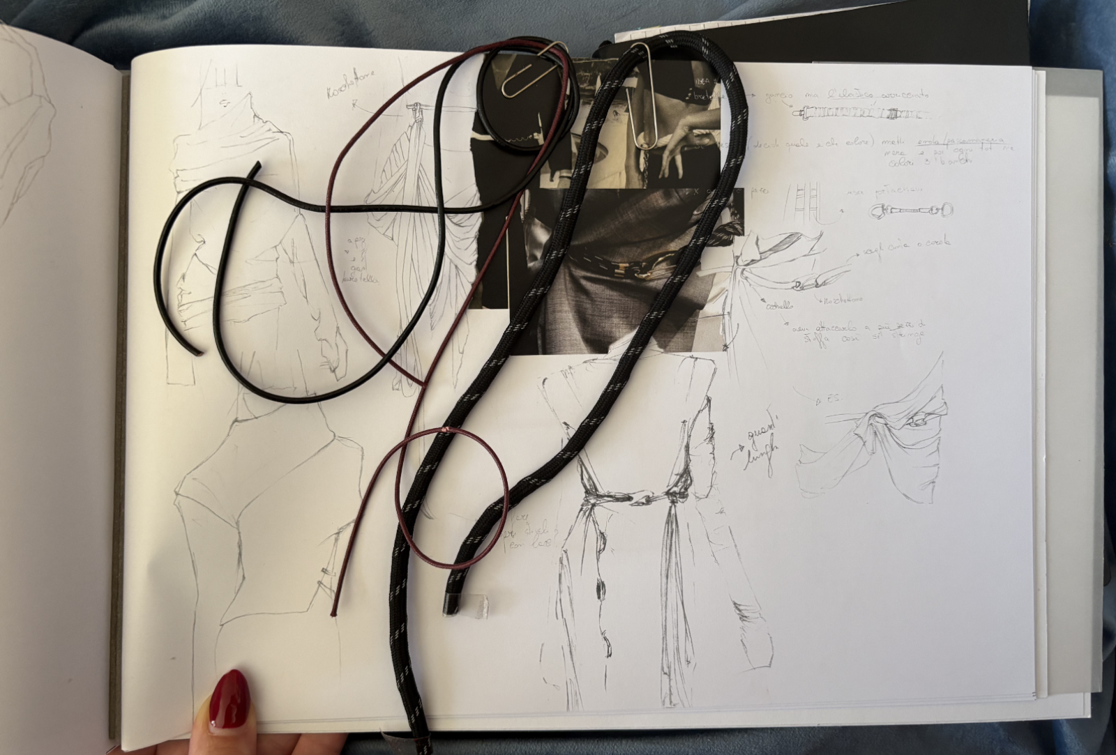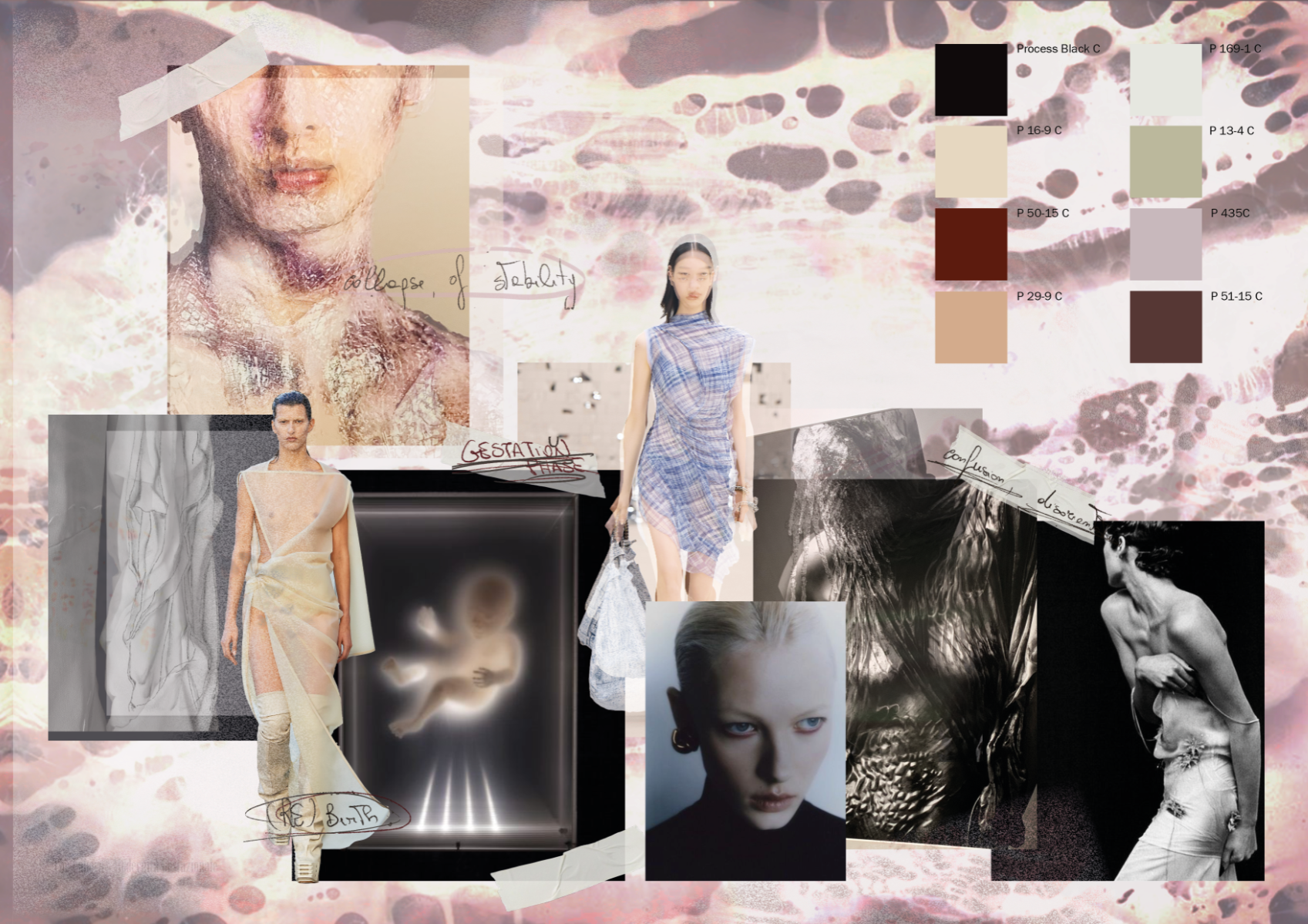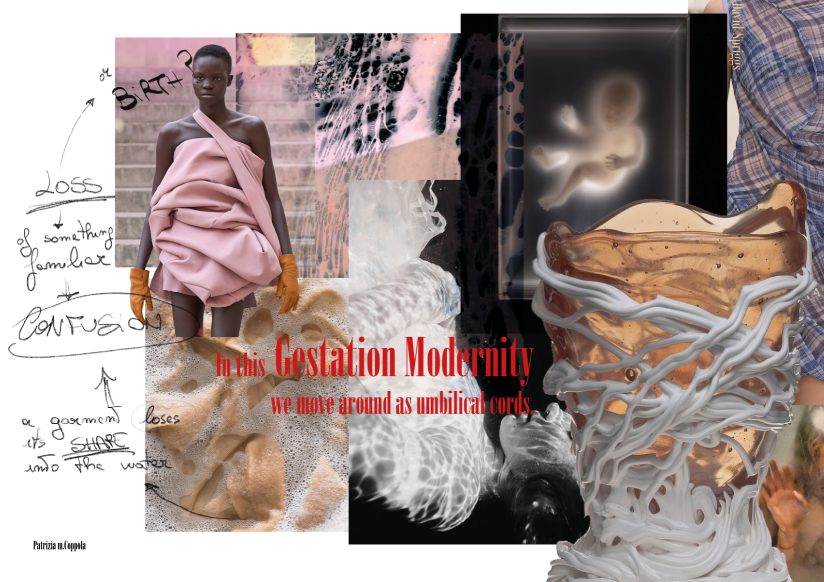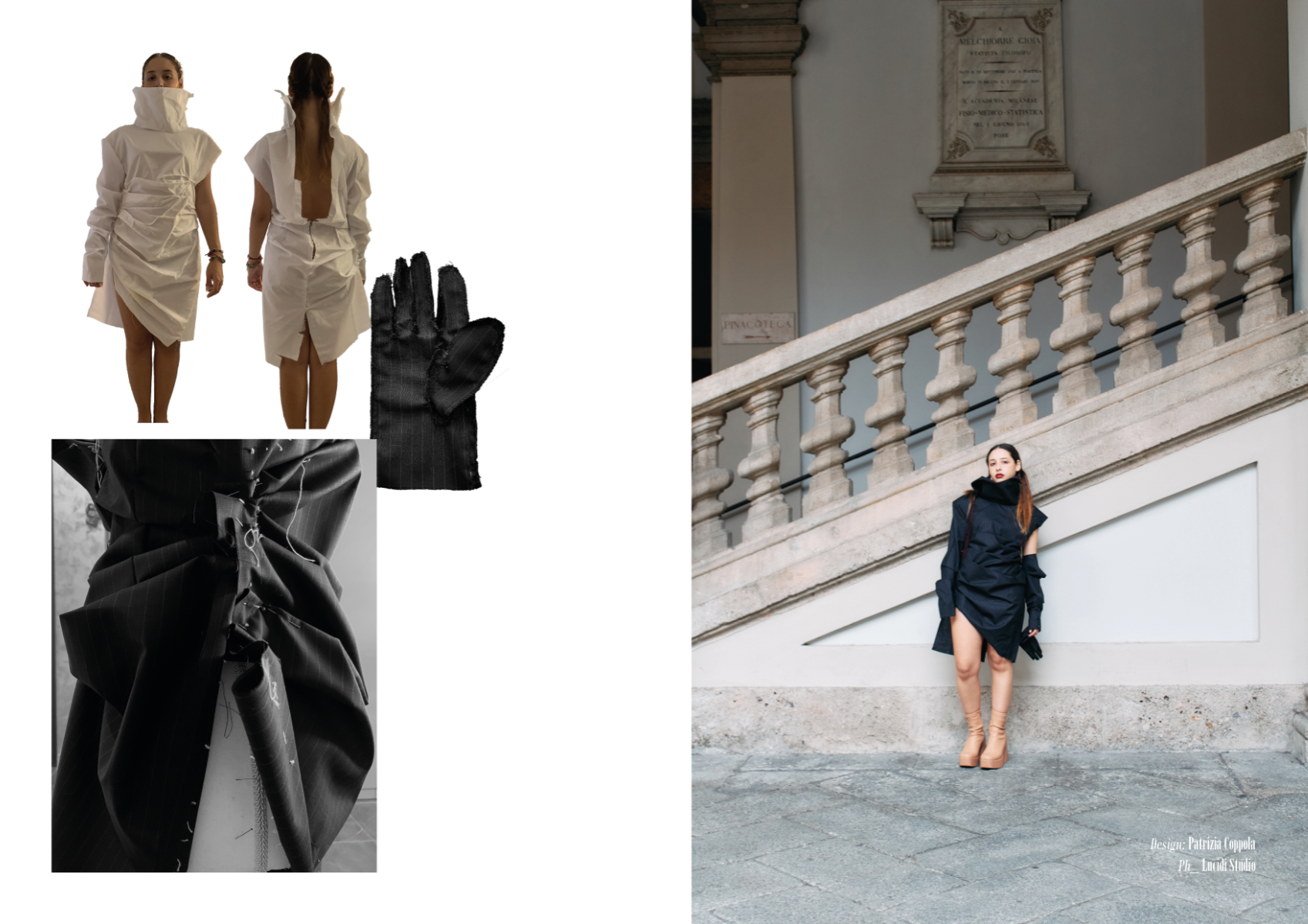 ‘The Unborn: Gestational Modernity’ is rooted in a reflection on contemporary society, inspired by Z. Bauman’s concept of Liquid Modernity. But, in a world marked by uncertainty and constant transformation, the fluid is perceived not as a loss of values but as a fertile environment: an amniotic fluid from which new forms, identities, and values can be born. As a result, the fabrics are manipulated to achieve a more fluid appearance, through draping or unraveling them. The collection embodies this transitional phase: a gestational modernity where everything changes and is going to be defined. So the garments are wearable in different ways, letting anyone to find their own style, through the use of zippers and cords. The garments includes Lineapelle deadstocks and the upcycling use of textile scraps. Visual inspirations range from pictures of exhibitions, contemporary art and vases to the moulting of the snake as a symbol of rebirth.