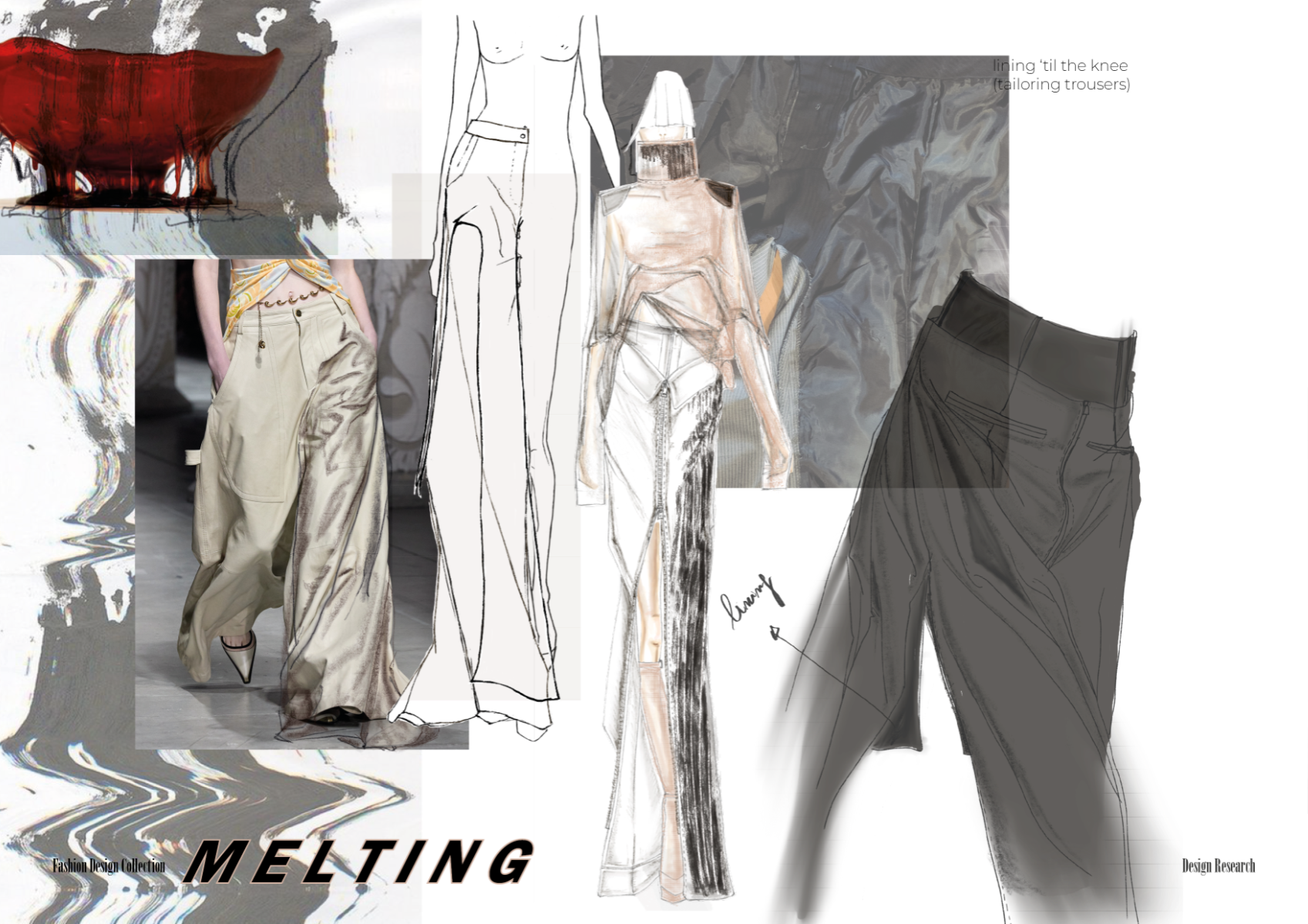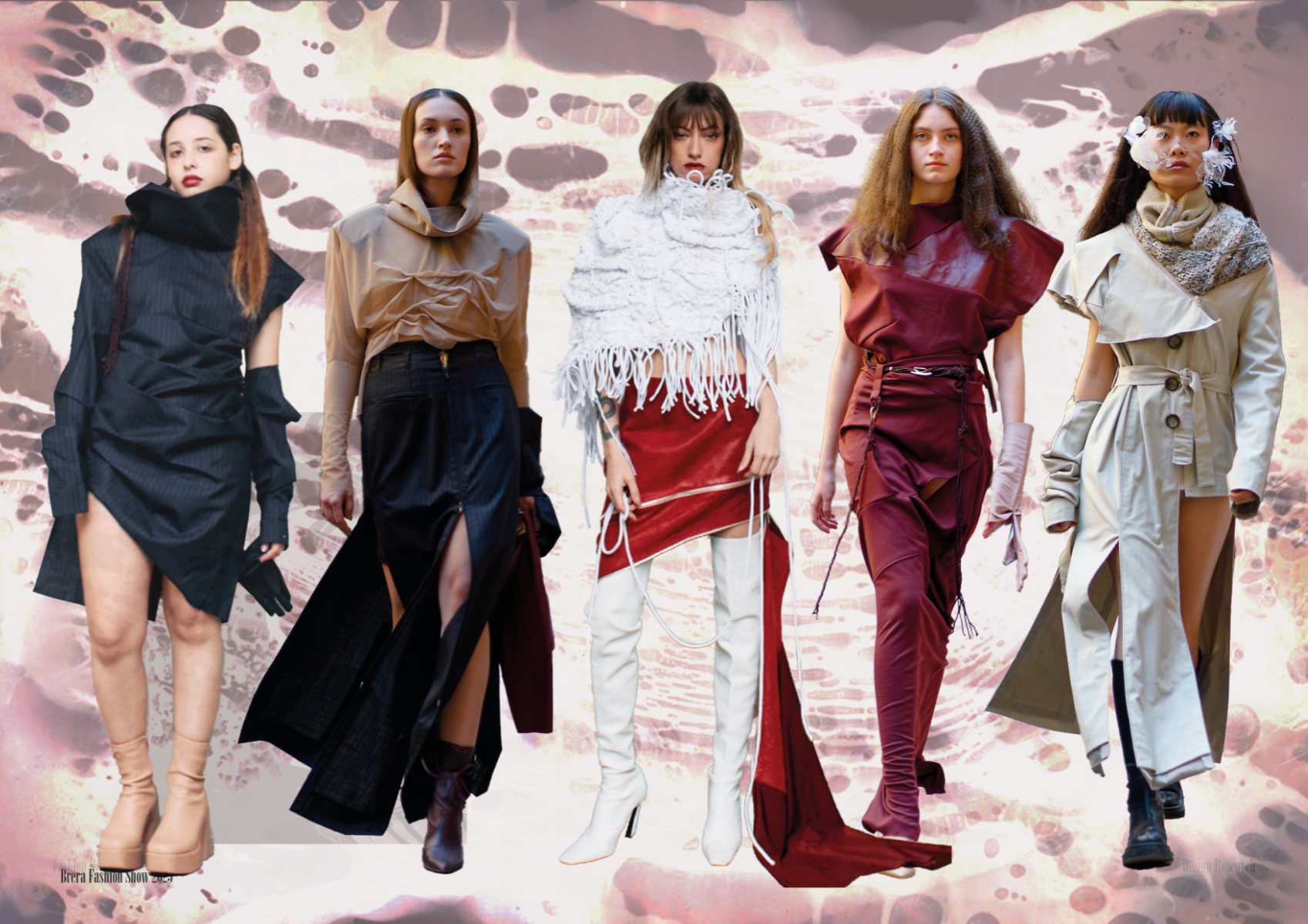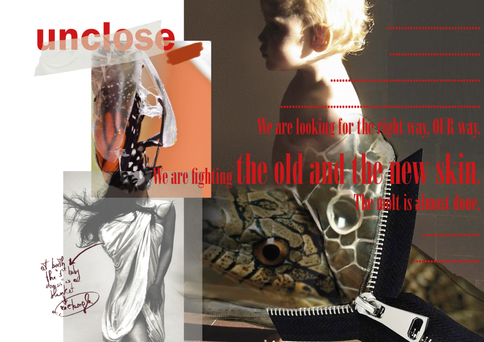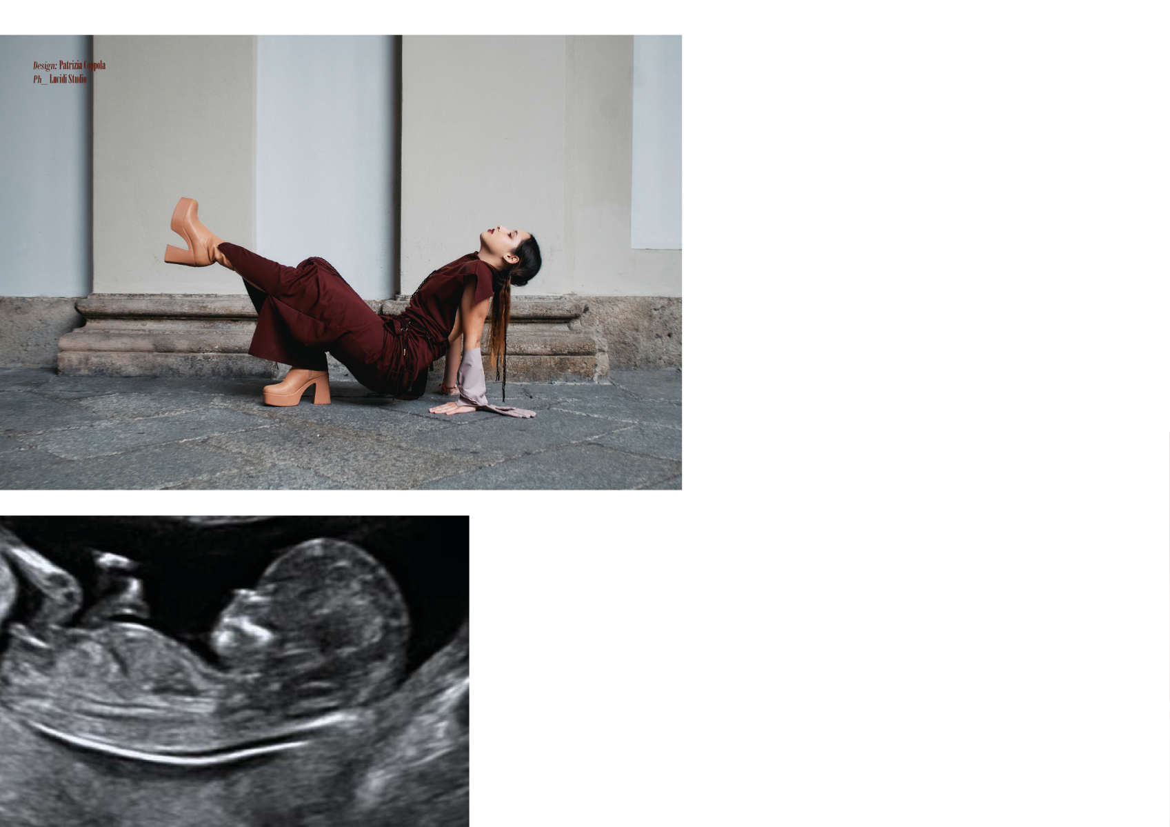 ‘The Unborn: Gestational Modernity’ is rooted in a reflection on contemporary society, inspired by Z. Bauman’s concept of Liquid Modernity. But, in a world marked by uncertainty and constant transformation, the fluid is perceived not as a loss of values but as a fertile environment: an amniotic fluid from which new forms, identities, and values can be born. As a result, the fabrics are manipulated to achieve a more fluid appearance, through draping or unraveling them. The collection embodies this transitional phase: a gestational modernity where everything changes and is going to be defined. So the garments are wearable in different ways, letting anyone to find their own style, through the use of zippers and cords. The garments includes Lineapelle deadstocks and the upcycling use of textile scraps. Visual inspirations range from pictures of exhibitions, contemporary art and vases to the moulting of the snake as a symbol of rebirth.