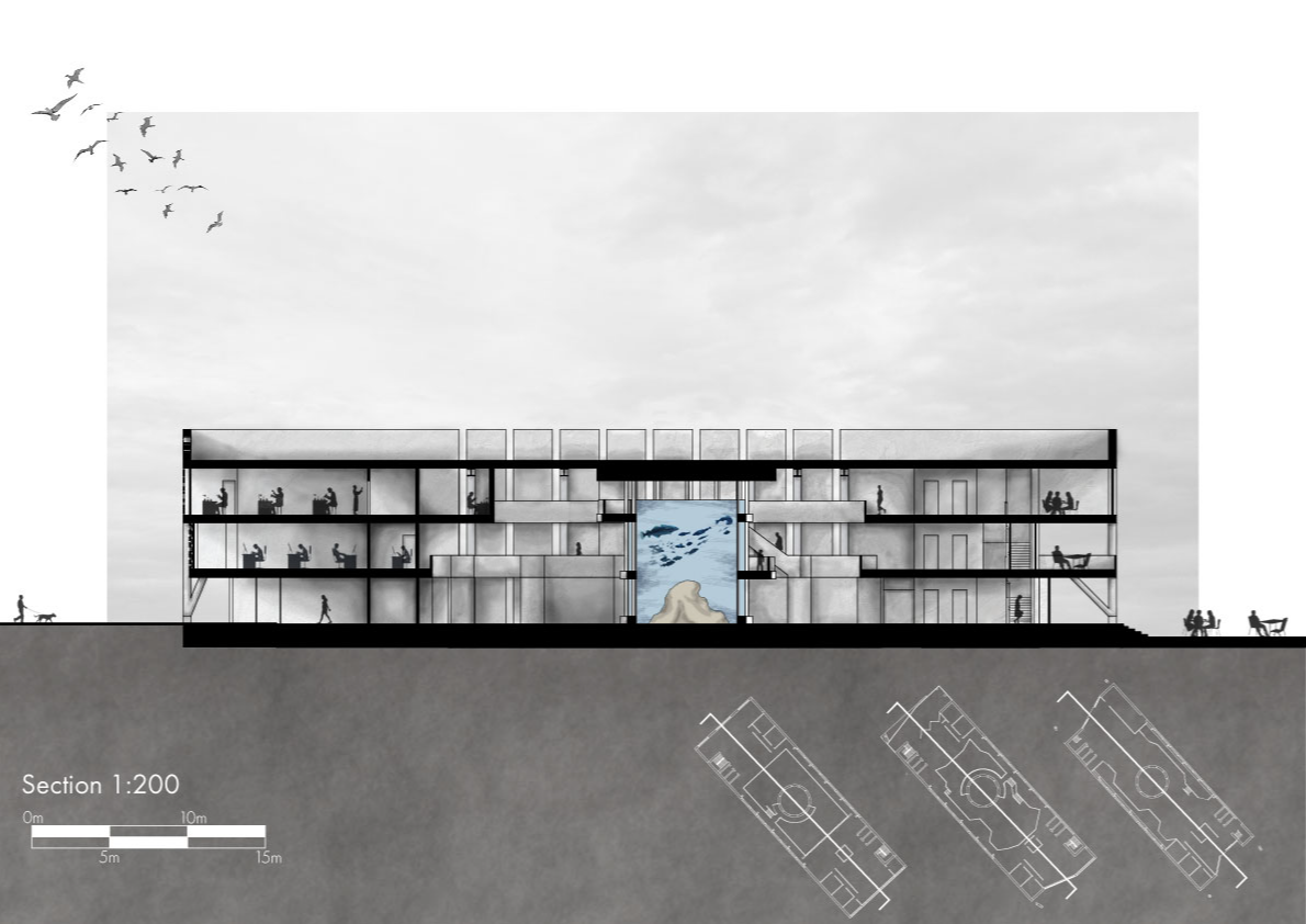How do we experience space? This sequential experience is important to our realisation, wonder, understanding and empathy with these spatial realisations. This proposal plays with this understanding through cutting away from the solid form to reveal the spaces within, along with this the form encapsulates the overwhelming gravity and the power of the climate crisis manifest in its form. The final solution becomes a social act designed to educate and inspire generations to come.