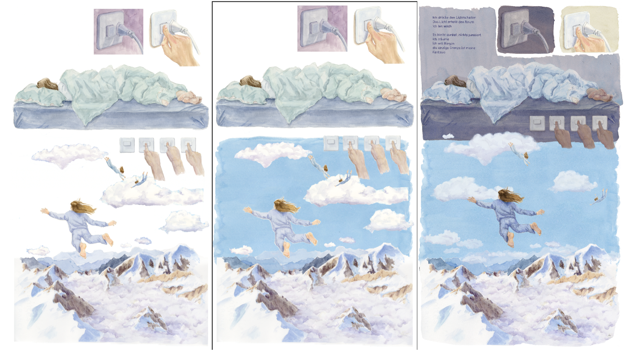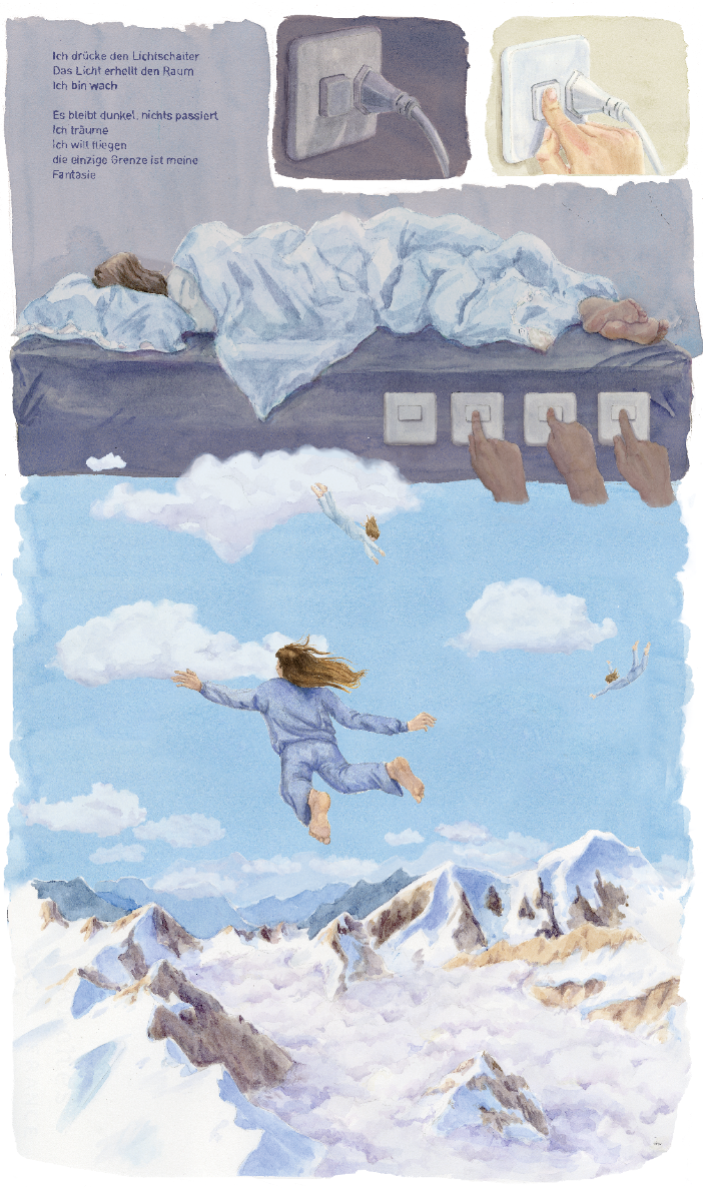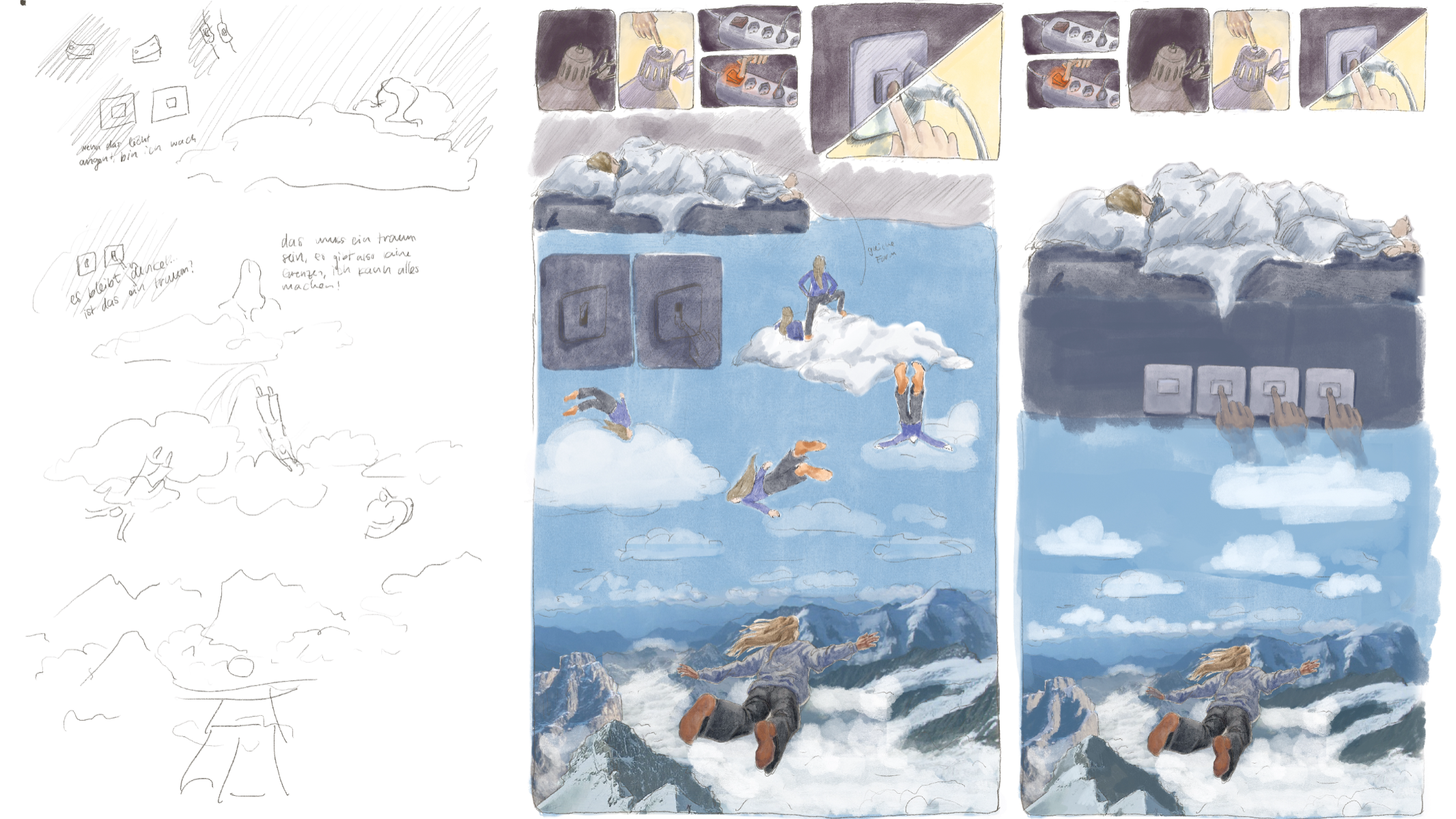In my bachelor's thesis, I visualised two lucid dreams. I illustrated the dreams using a combination of analogue watercolour painting and digital tools. In cooperation with Lucid Lab Bern, I was able to work closely with lucid dreamers. My goal was to bring lucid dreaming closer to people and explain the techniques used by the individual dreamer to enter a lucid dream. It was particularly important to me to convey the feeling of dreaming in atmospheric images.