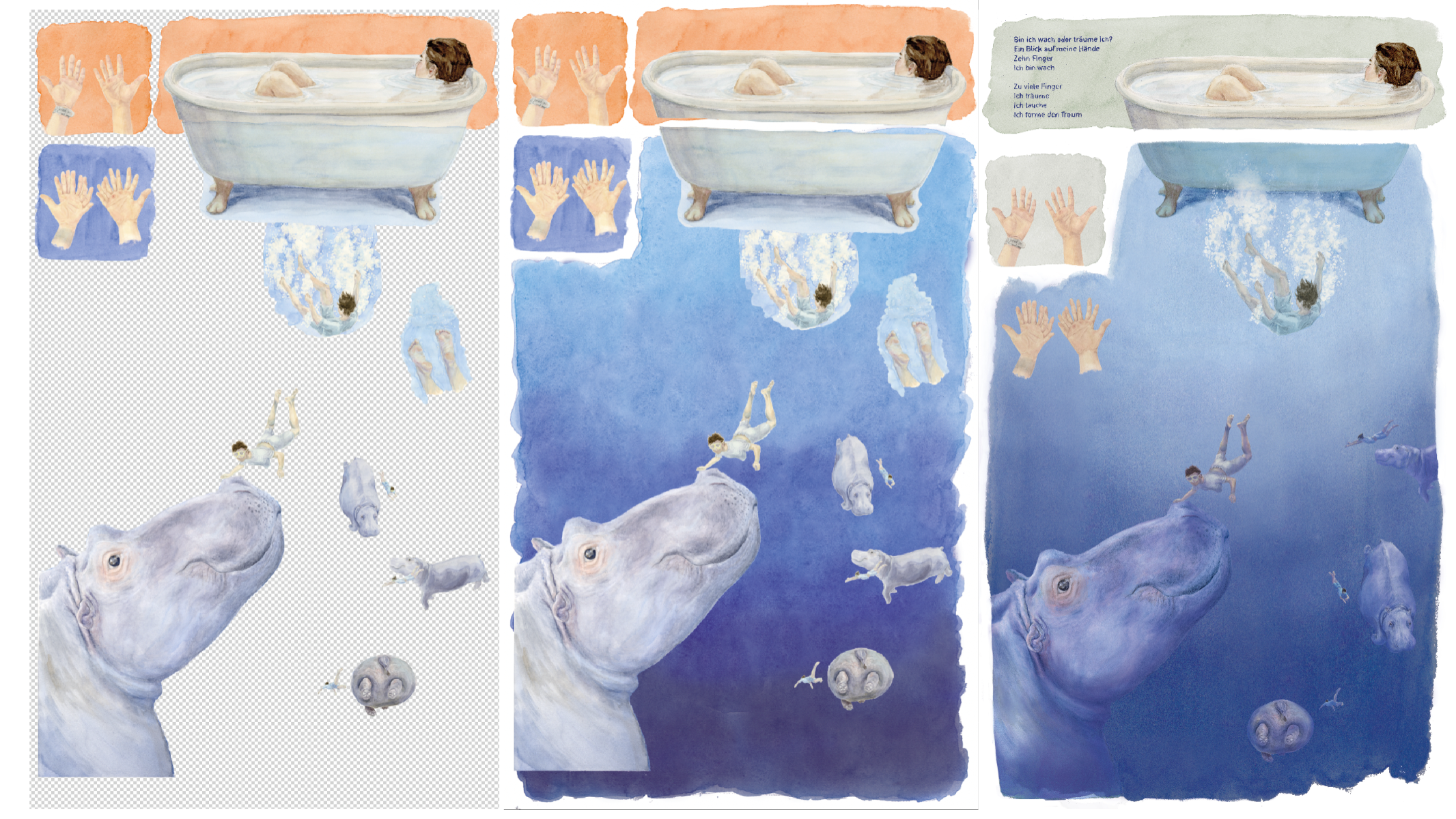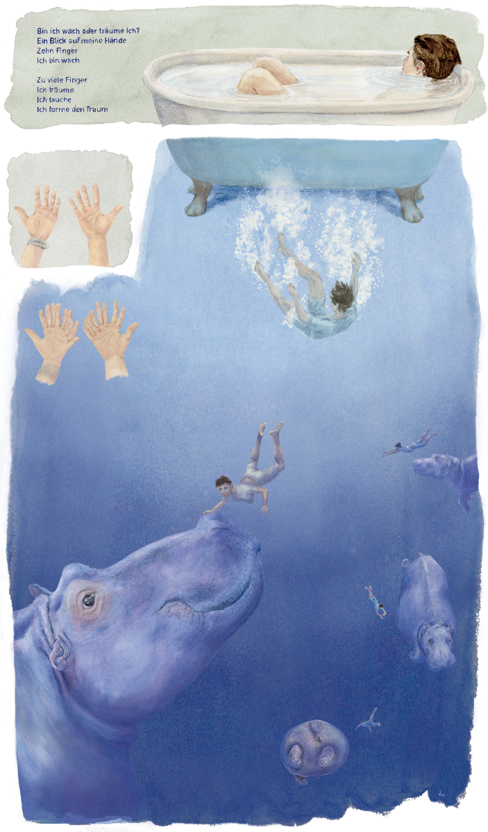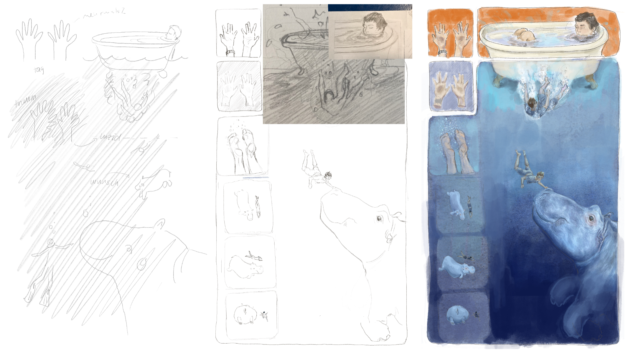 In my bachelor's thesis, I visualised two lucid dreams. I illustrated the dreams using a combination of analogue watercolour painting and digital tools. In cooperation with Lucid Lab Bern, I was able to work closely with lucid dreamers. My goal was to bring lucid dreaming closer to people and explain the techniques used by the individual dreamer to enter a lucid dream. It was particularly important to me to convey the feeling of dreaming in atmospheric images.