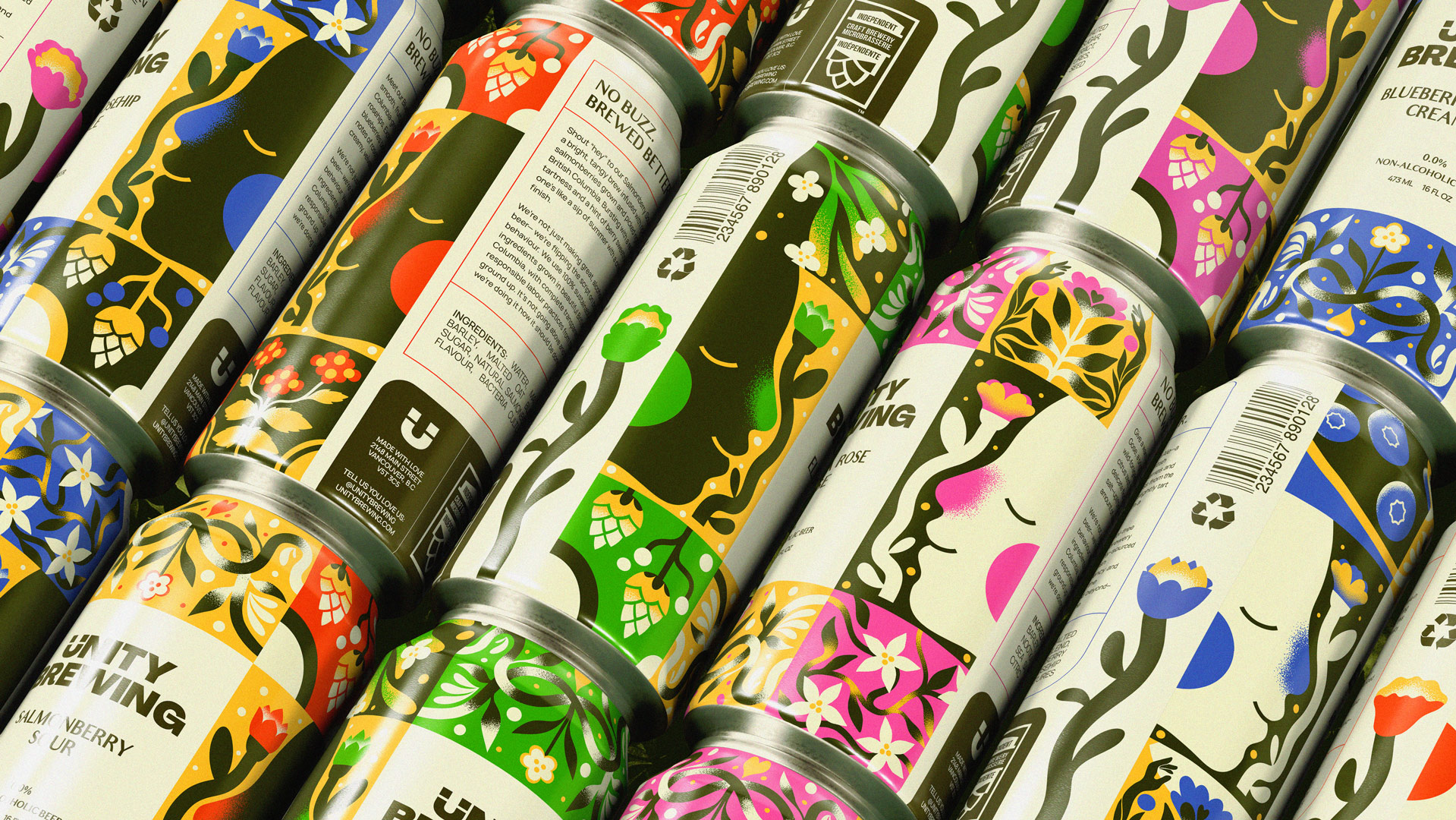 Unity Brewing challenges the greenwashed, corporate non-alcoholic aisle by offering genuinely crafted beer with 100% sustainably sourced British Columbia ingredients. Designed for the sober, sober-curious, and everyone in between, Unity prioritizes local suppliers, responsible labor, and respect for unceded Indigenous land. A flexible, hand-drawn illustration system celebrates connection, community, and craft, pairing BC-native botanicals with everyday moments. The brand’s playful, nature-inspired visuals reflect its values: eco-conscious, locally made, non-alcoholic beer that tastes like commitment, not compromise.