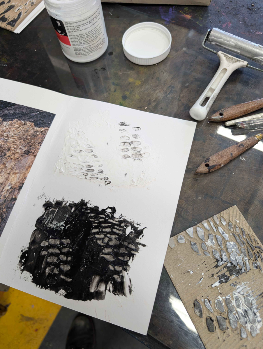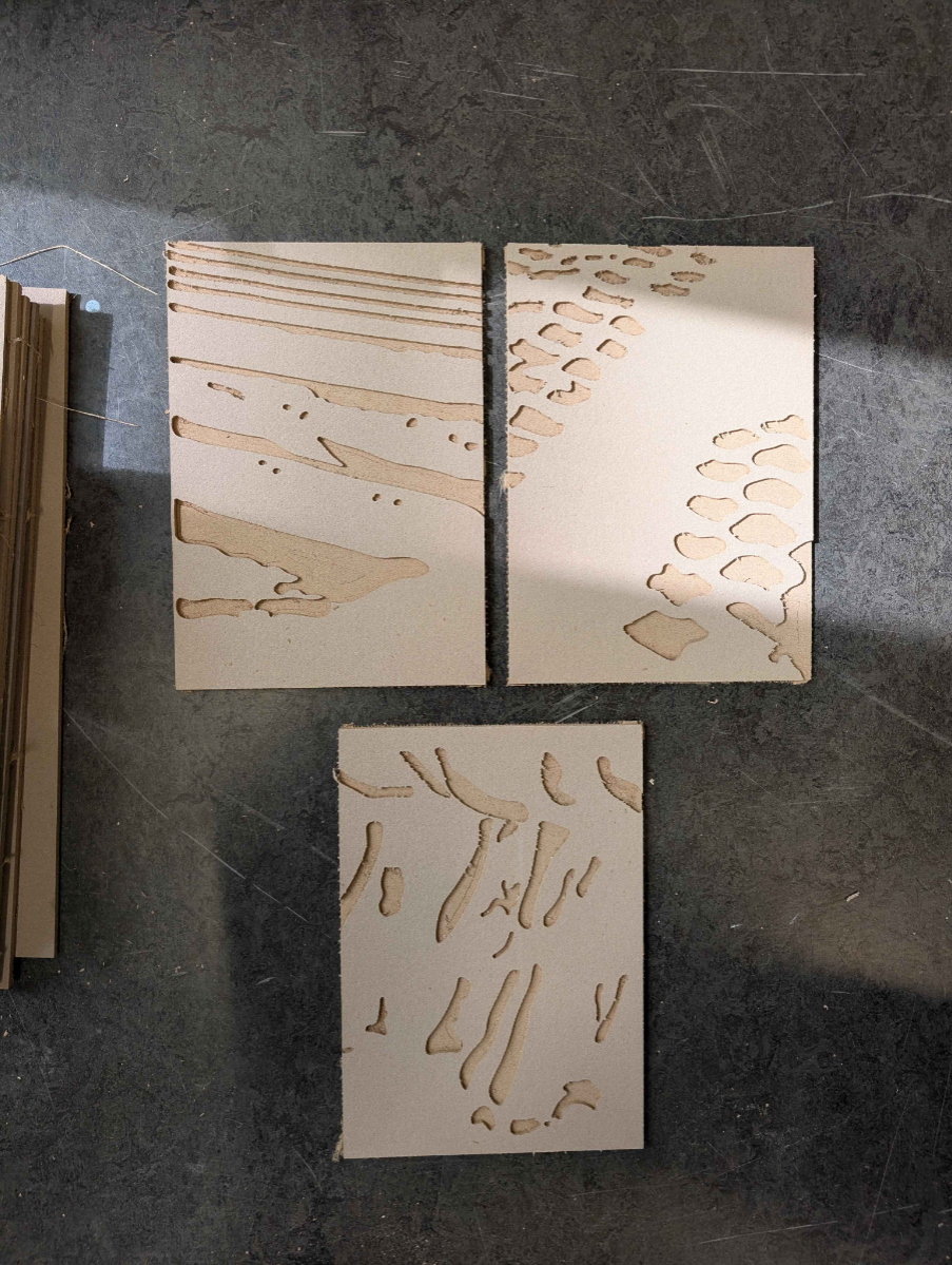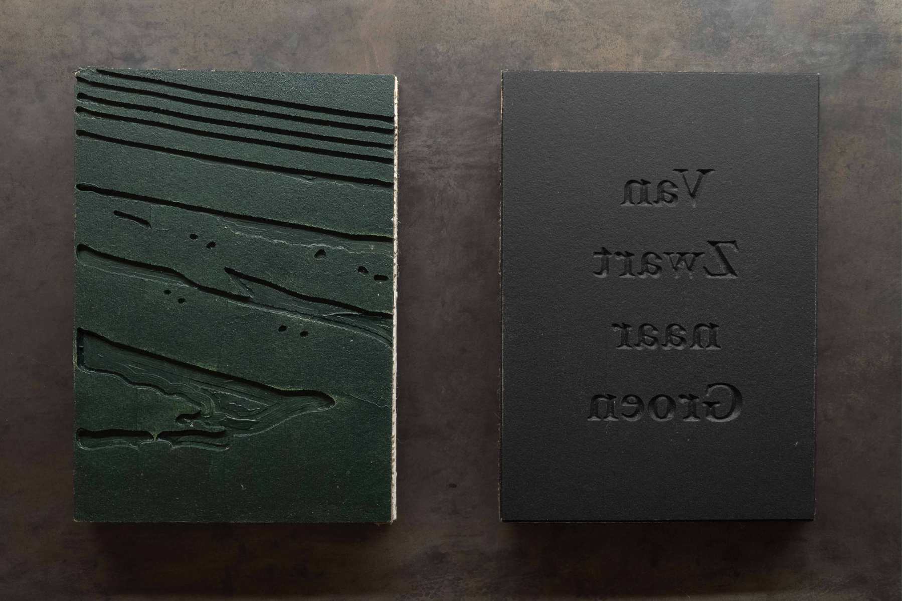 My graduation work consists of two pieces: a photo book and an interactive installation. The photo book “Van Zwart naar Groen” explores how Limburg’s (the Netherlands) landscape is shaped by human intervention. Once a region defined by coal mining, the governmental effort “Van Zwart naar Groen” shifted the focus towards agriculture. By analysing what people leave behind, we can learn how a society functions and values land. I use photography and lino prints to trace these changes and show how land continues to be exploited in pursuit of economic gain. The cover, engraved in linoleum, and the lino prints, made with modelling paste and acrylic paint, allow the reader to physically experience the traces left in the landscape. To strengthen the connection between the work, theme, and audience, I translated the book’s concept into an interactive wooden sculpture. I carved traces through multiple wooden pieces and assembled them into a marble run. The viewer can touch, feel, play, read, or look, and in this way sense natural resource use on their own terms. Together, both works invite the audience to reflect on land use and its impact on their daily life.