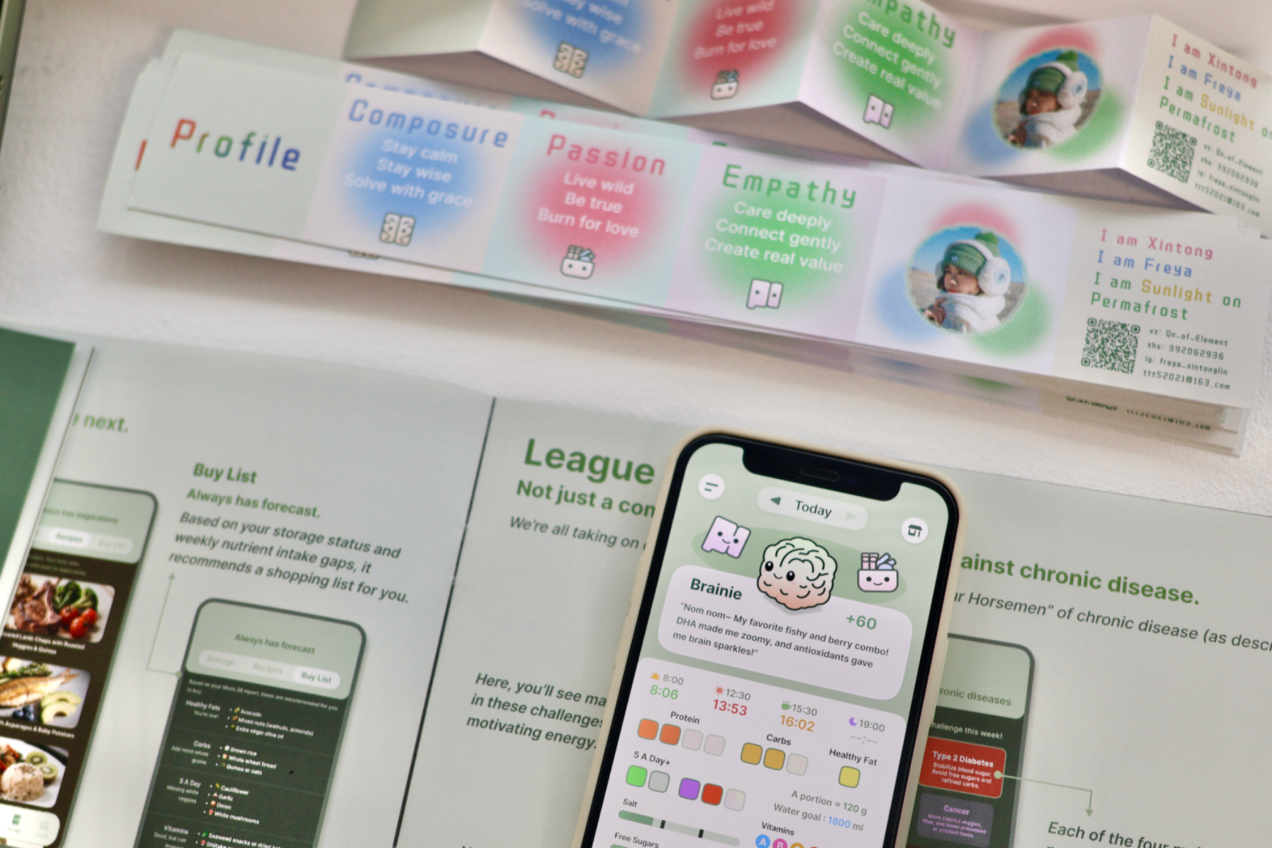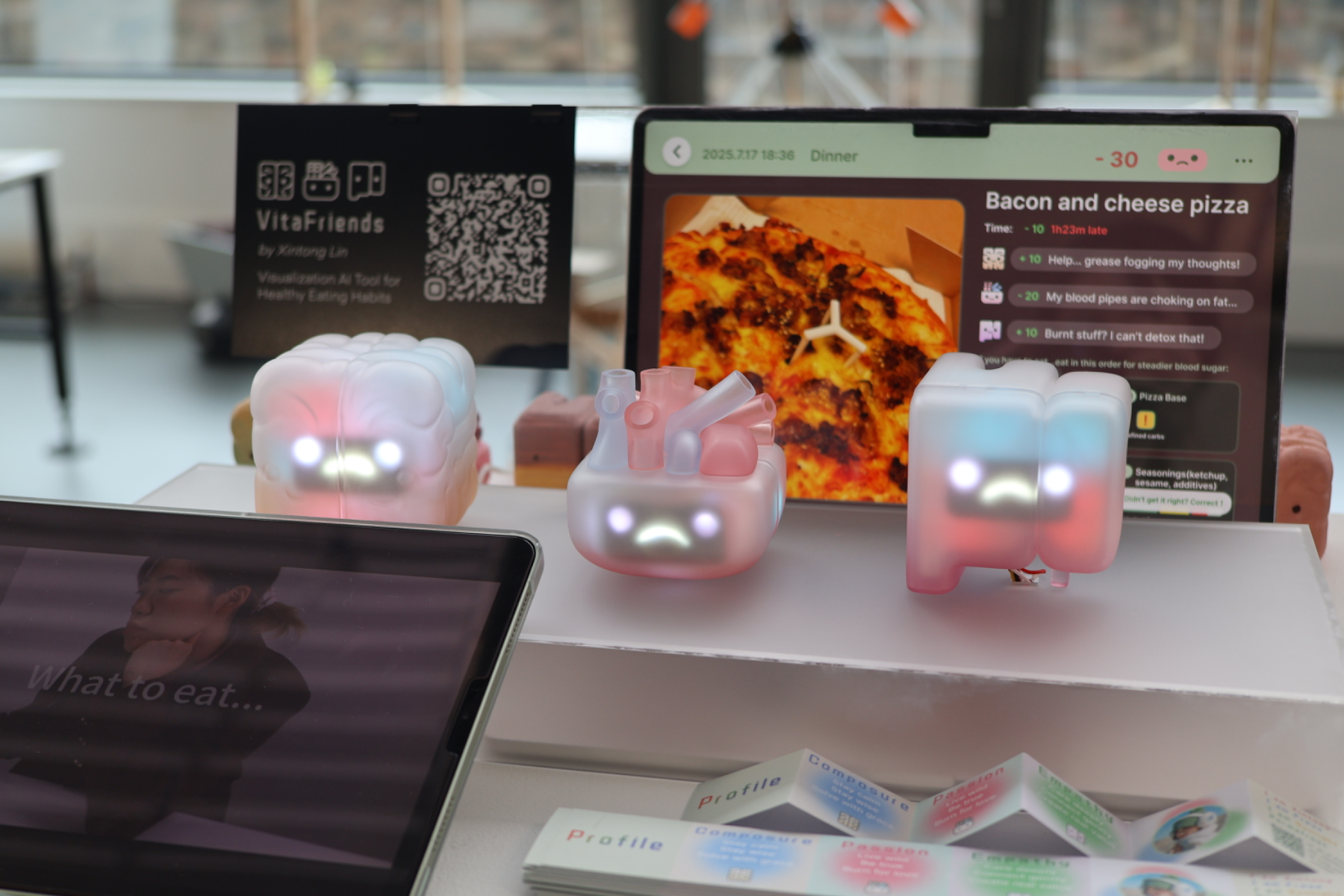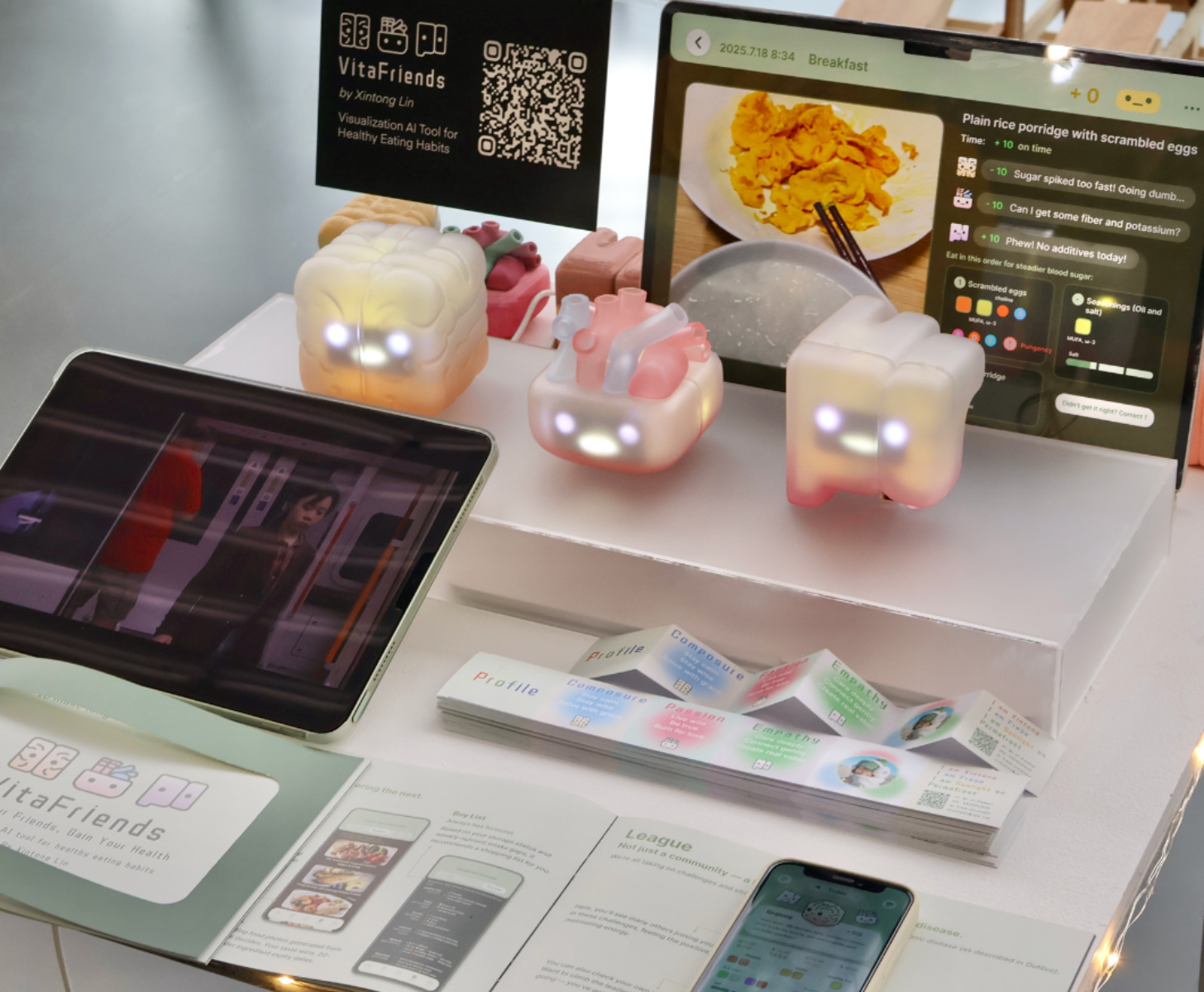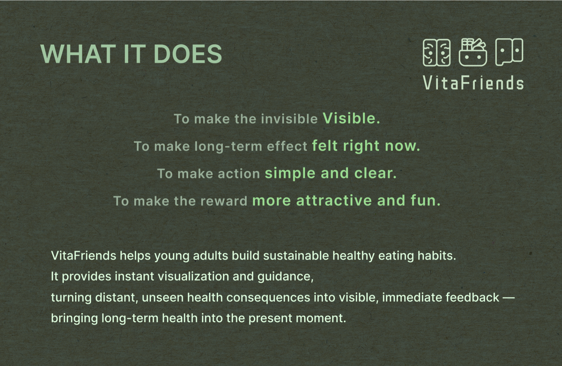 VitaFriends is an AI-powered companion that helps young adults build sustainable healthy eating habits for longevity. It pairs cute organ-shaped table companions — Brainie (brain), Heartie (heart), and Livie (liver), which change color and emotion via a smart app. Using AI image recognition, the app analyzes your meals, tracks nutrition, offers daily check-ins, suggests fridge-based recipes, generates grocery lists based on nutrition gaps, and provides preventive chronic disease challenge rankings. Based on nutrition and habit science, it provides instant visualization and guidance, turning distant, unseen health consequences into visible, immediate emotional feedback.