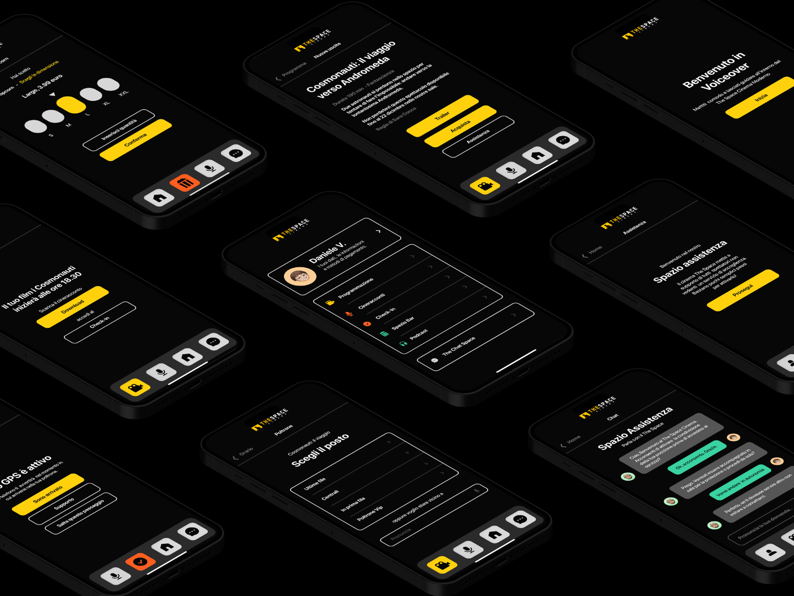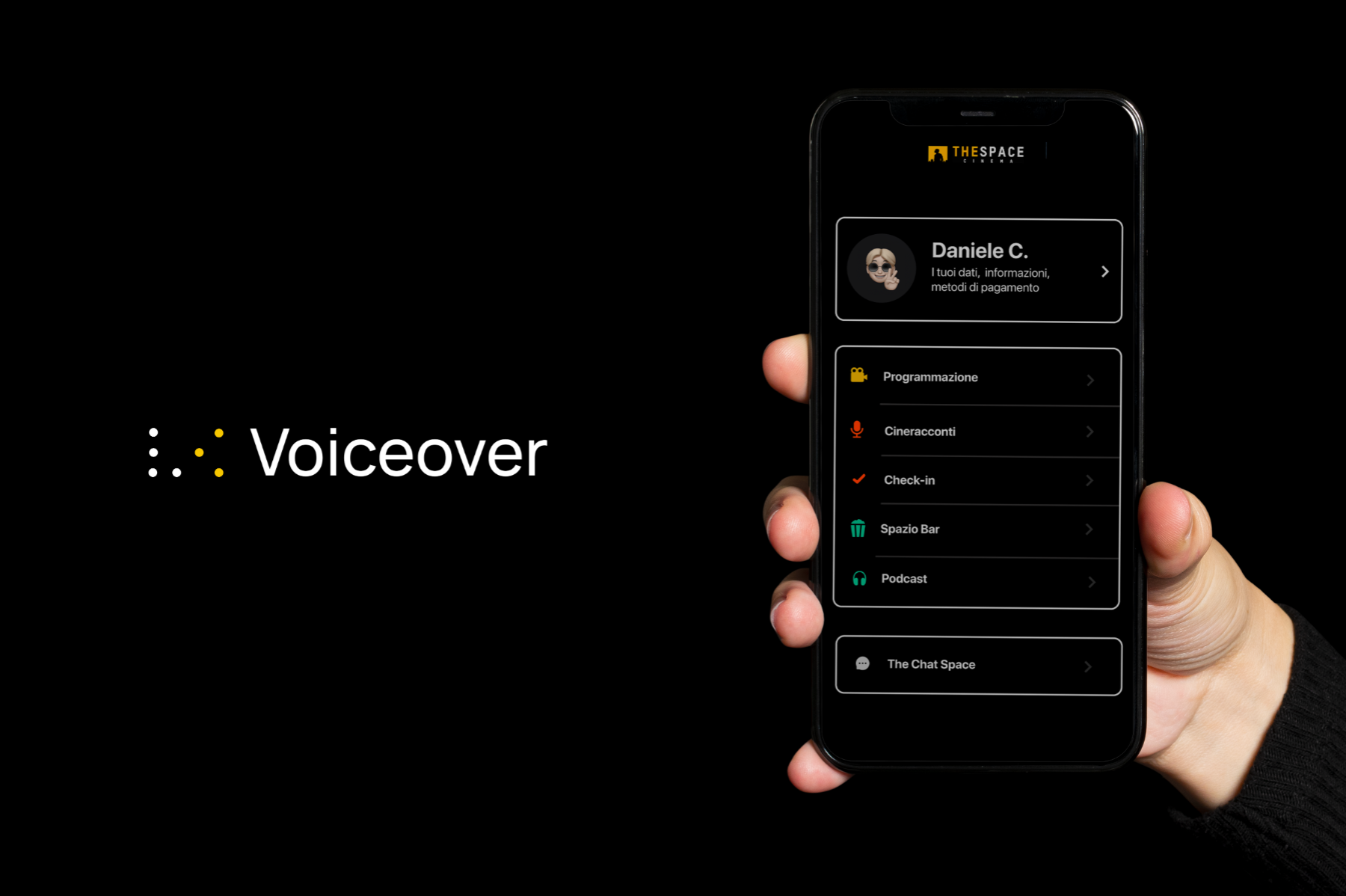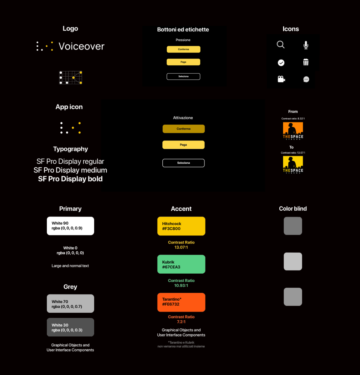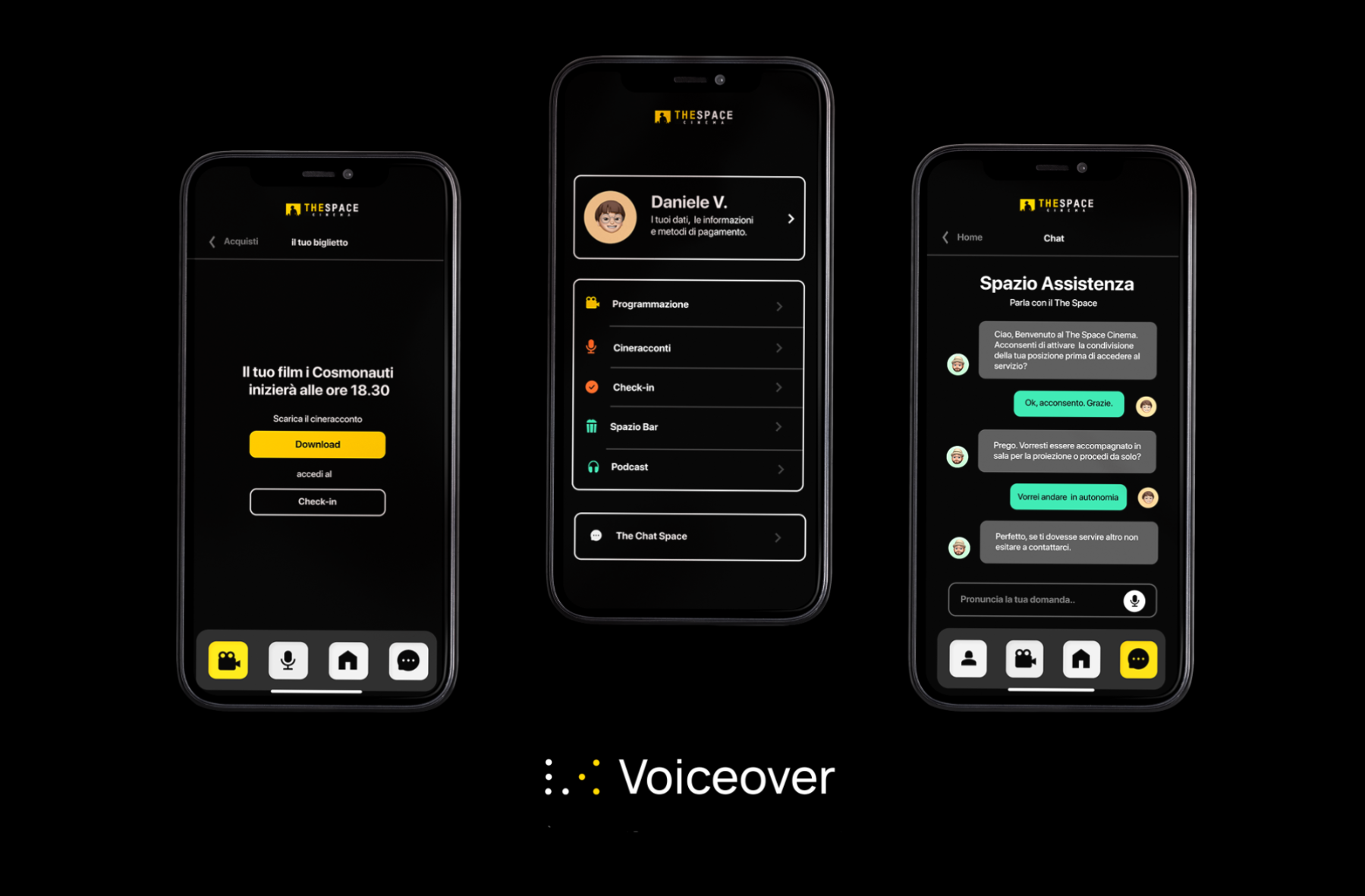Voiceover is the name of my thesis in digital art direction. The thesis is on the topic of accessibility for blind people: with this project carried out in collaboration with The Space Cinema, I wanted to make movie theaters accessible in their services, architecture and enjoyment of the film during the screening. The final output is an app that supports blind people by providing directions on how to access the cinema, provides support and assistance to the services and the film (with audio descriptions during the film). he main idea of my project is to increase the social inclusion of blind people in our society by eliminating the architectural barriers present in the movie theaters and in the entertainment industry. The creative process was born hand in hand with research: through the help of the Sant’Alessio Institute for the Blind people, I grounded this app that is based on the needs of blind people. So the creative process was shaped by the target audience, the needs of blind people and the require of movie theaters.