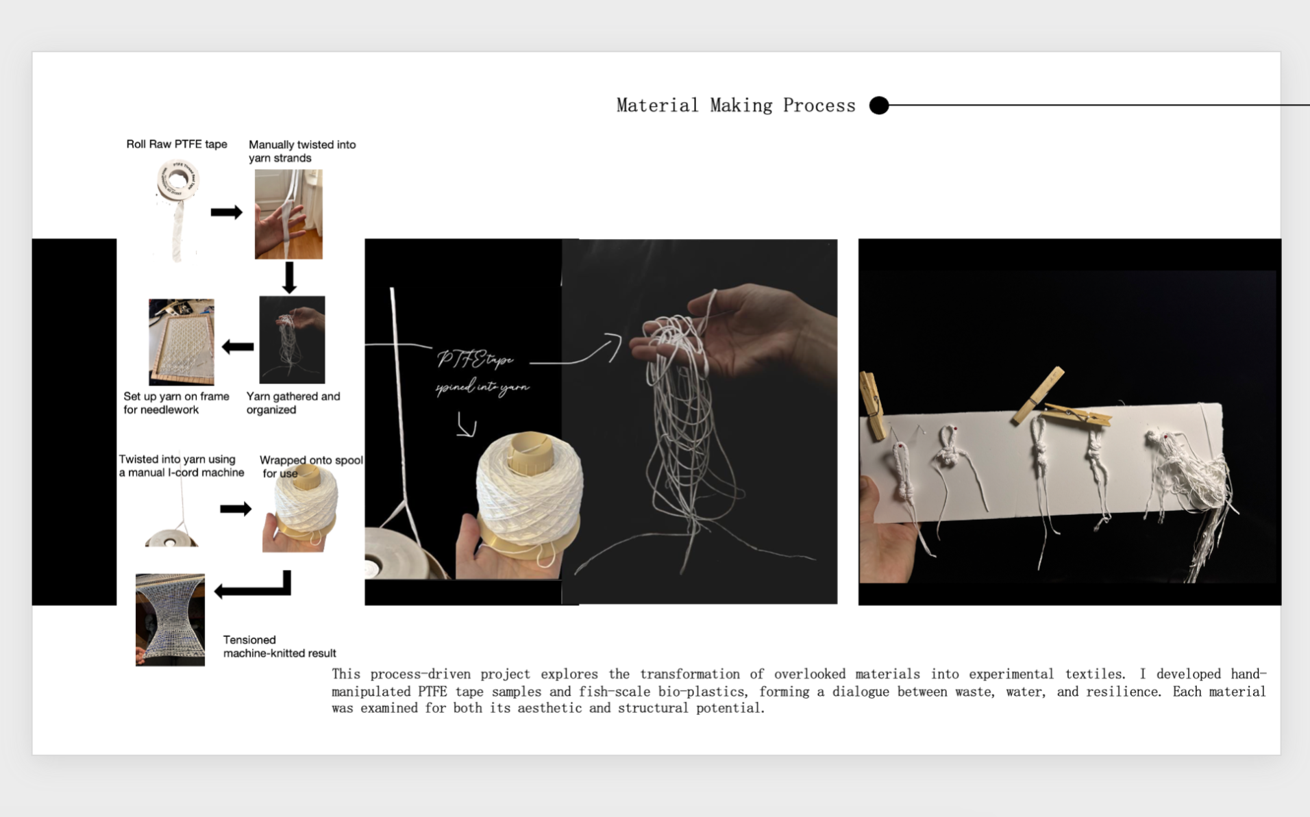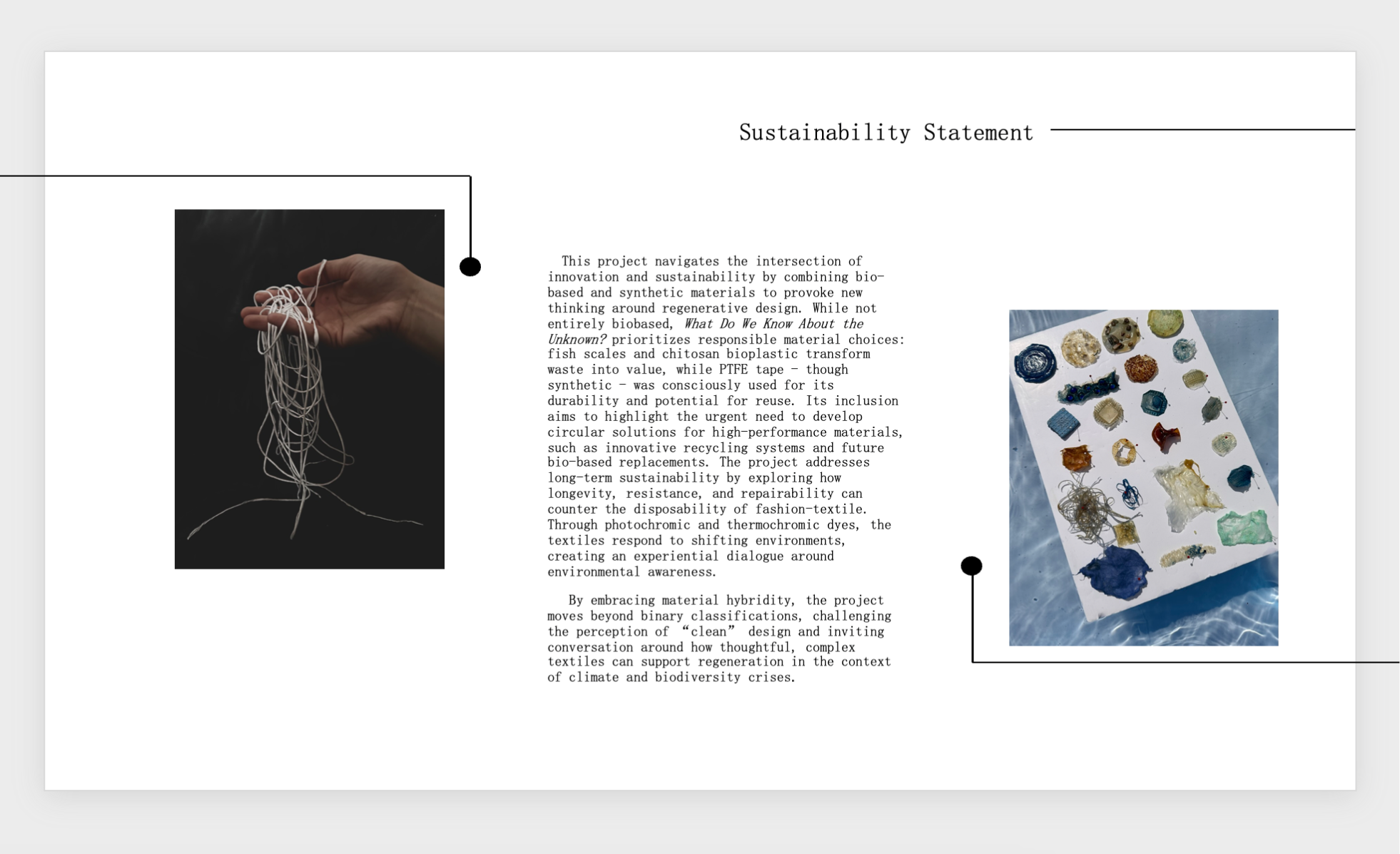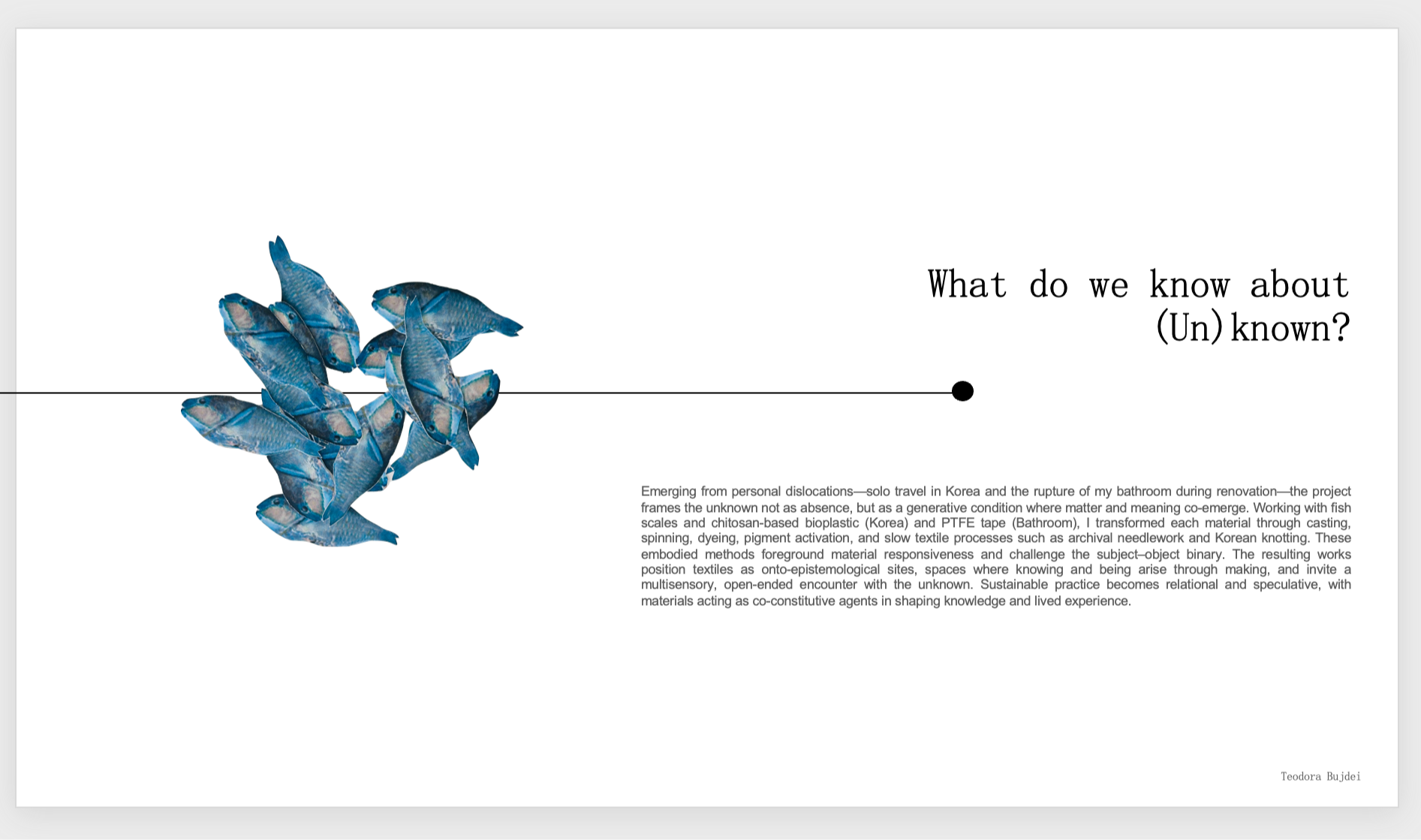 My Final Major Project, "What Do We Know About the (Un)known?", is a conceptual, sustainability-led textile exploration that investigates material agency through a posthumanist lens. Emerging from personal dislocations - solo travel in Korea and the rupture of my bathroom during renovation - the project frames the unknown not as absence, but as a generative condition where matter and meaning co-emerge. Working with fish scales and chitosan-based bioplastic (Korea) and PTFE tape (Bathroom), I transformed each material through casting, spinning, dyeing, pigment activation, and slow textile processes such as archival needlework and Korean knotting. These embodied methods foreground material responsiveness and challenge the subject–object binary. The resulting works position textiles as onto-epistemological sites - spaces where knowing and being arise through making - and invite a multisensory, open-ended encounter with the unknown. Sustainable practice becomes relational and speculative, with materials acting as co-constitutive agents in shaping knowledge and lived experience.