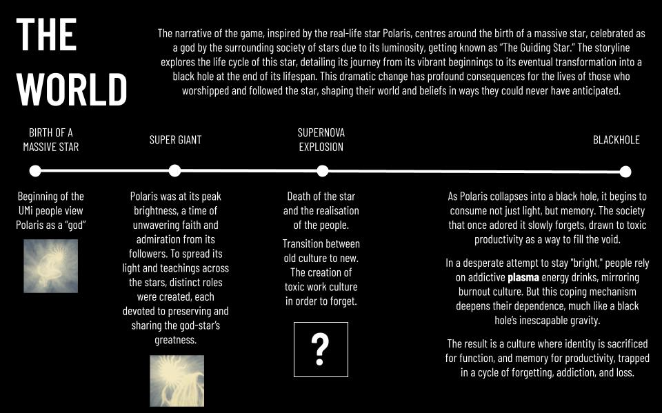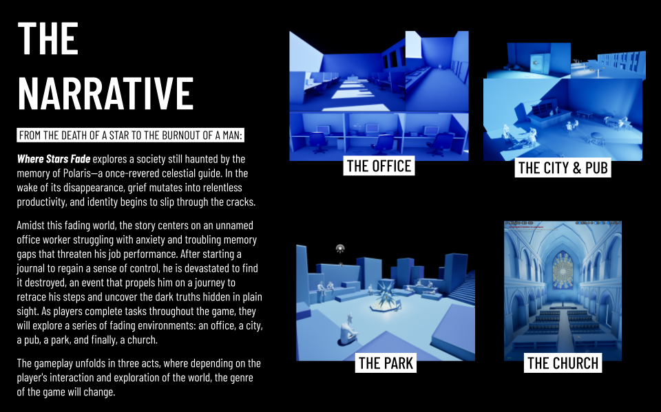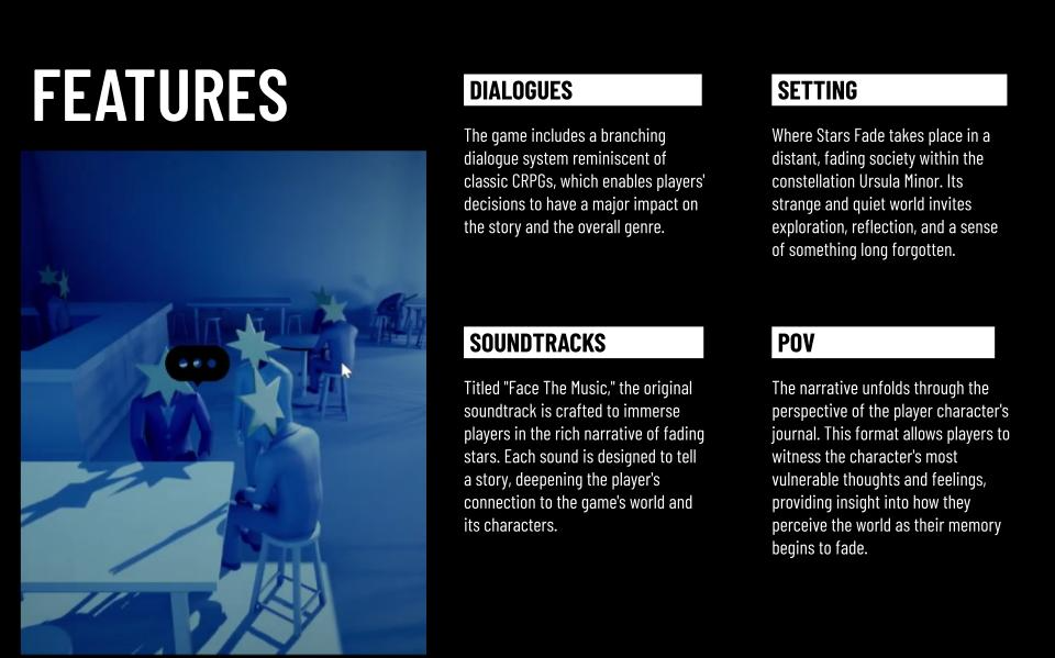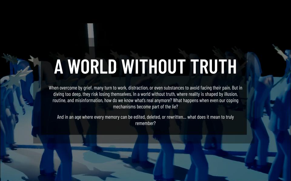 A narrative-driven psychological thriller that explores memory, music, and cosmic grief in a surreal world shaped by obsession and fading purpose. Set in a productivity-obsessed society, it raises the question of how we hold on to ourselves when truth and memories can be unreliable. Inspired by the “A World Without Truth” prompt, players take on the role of a solitary office worker, navigating a reality distorted by productivity while unravelling hidden meanings in their environment. With atmospheric storytelling and a unique memory reconstruction mechanic, the game challenges players to question reality and memory as a form of resistance.