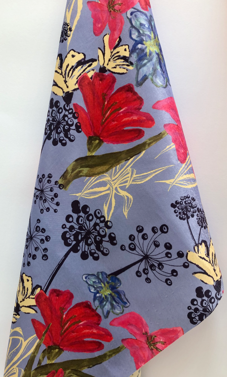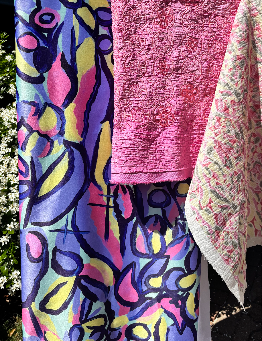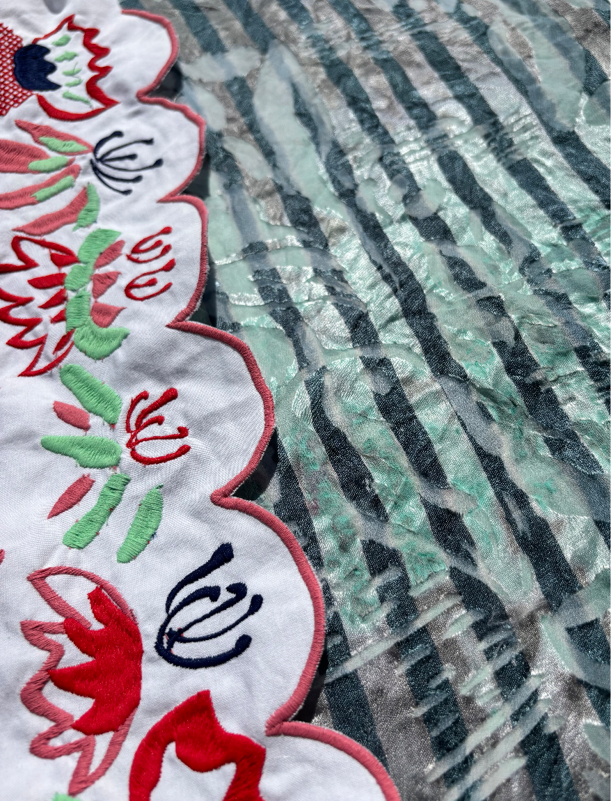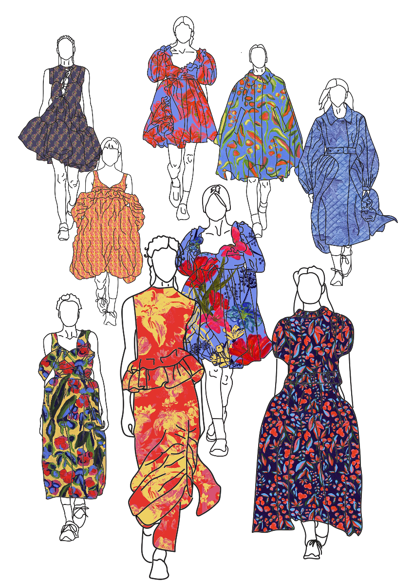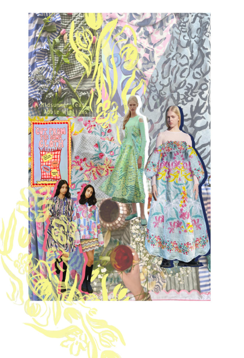 'A midsummer Feast' is inspired by Scandinavian midsummer celebrations and dining as a community with loved ones. This is portrayed through the imagery of tablecloths, flowers, vases and dining displays. The collection links heavily to my love for Fine Art, particularly Still Life. Having taken inspiration from Artists such as Van Gogh, Matisse, and Vanessa Bell, My own still life paintings were the sole source for all of my designs within this collection. At the heart of this collection is the sustainability concept, which is emphasised through my use of upcycled cloth. 100% of my samples are recycled fabrics including deadstock purchased at local scrap stores, donated tablecloths and linens or printed directly onto recycled polyester satin. This choice was to highlight and personally limit the amount of textile fabrics that end up in landfill. A playful print and embellishment collection designed to be produced bespokely for high quality and considered womenswear.