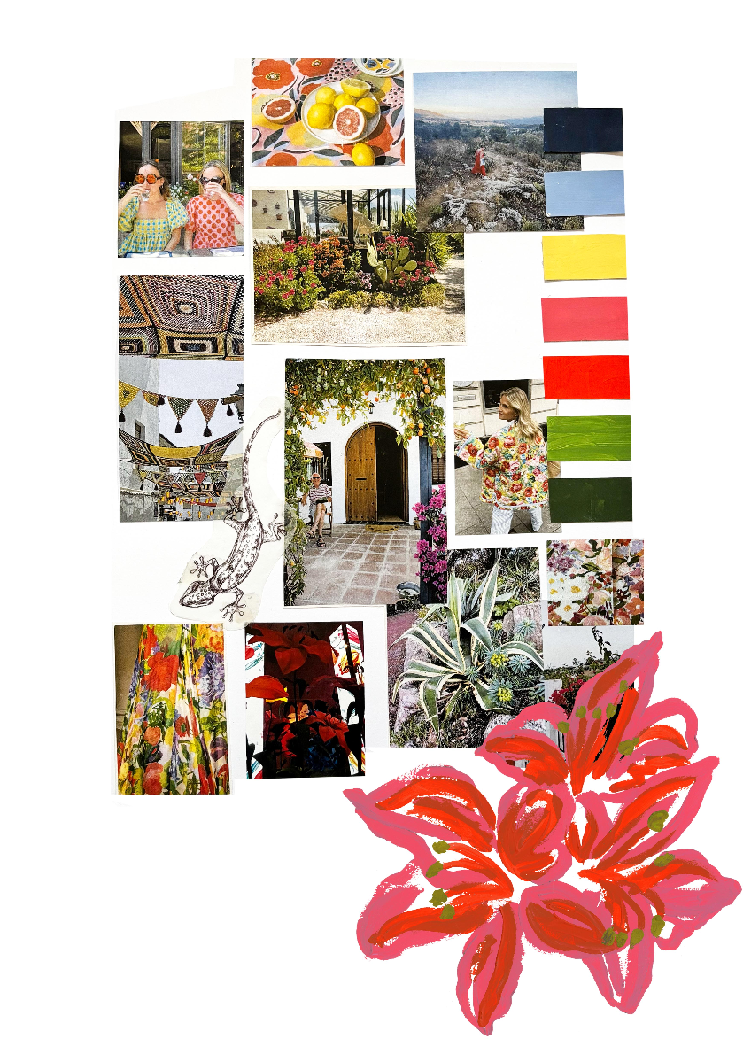 Based on my Grandparents house in spain 'Casa las Aguilas' was surrounded by nature, celebration, colour and community. I wanted to capture a sense of place within my Level 5 print and embellishment collection. Intended for fashion, Casa Las Aguilas exposes a fun and playful element to high end fashion, highlighted through my illustrative style and embellishments inspired by design innovation.