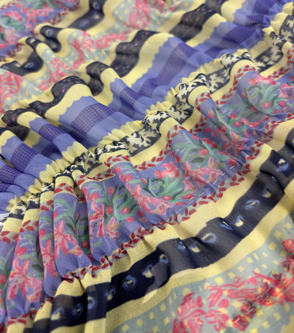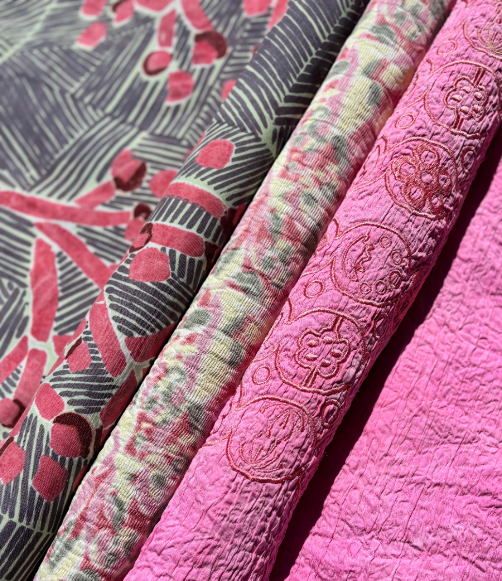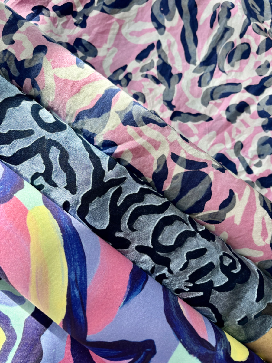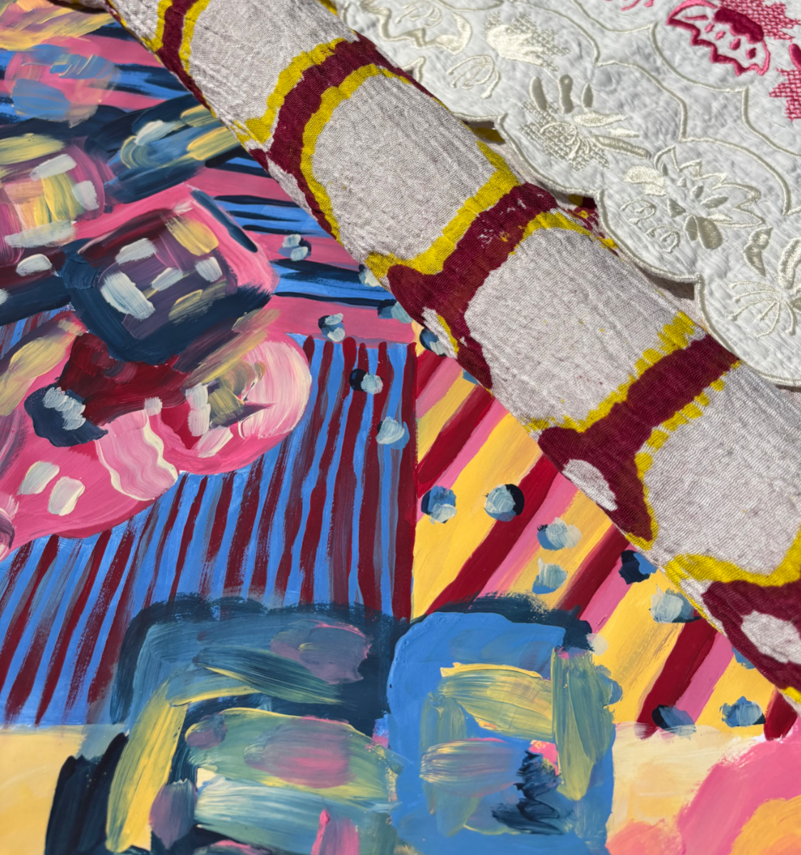 I am a Level 6 Textile Design student, speciallising in Print and embellishment. My painterly design style is highlighted throughout my prints which explore bold, bright and playful colour compositions. I enjoy pushing the boundaries of hand printing processes and experimenting to create innovative outcomes. I also work within embroidery and embellishment such as quilting and embroidered trims that accompany my prints within each collection.
