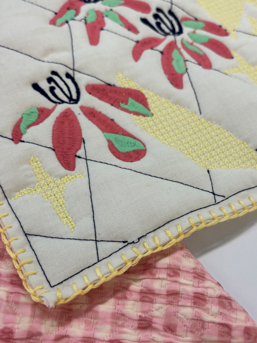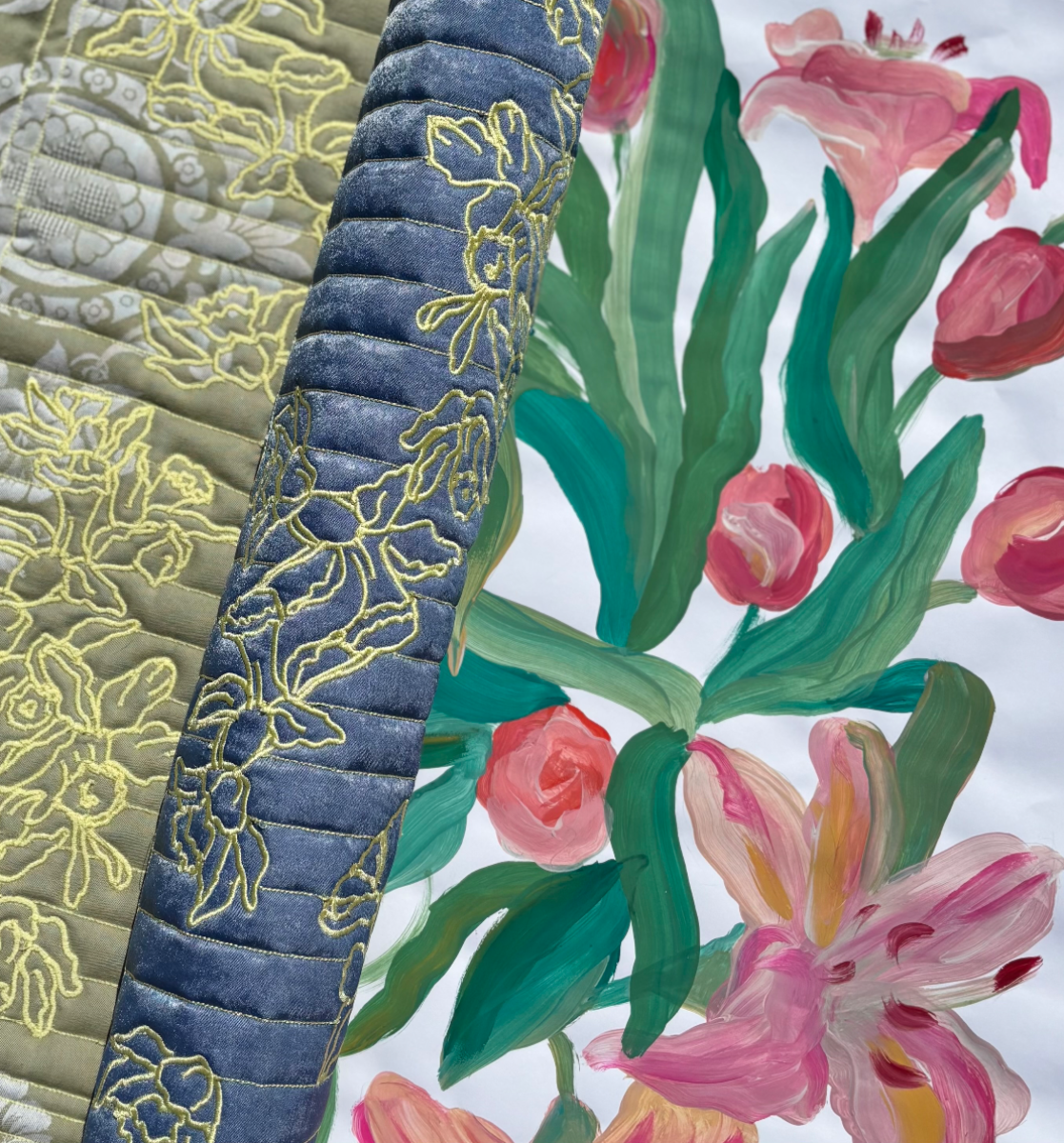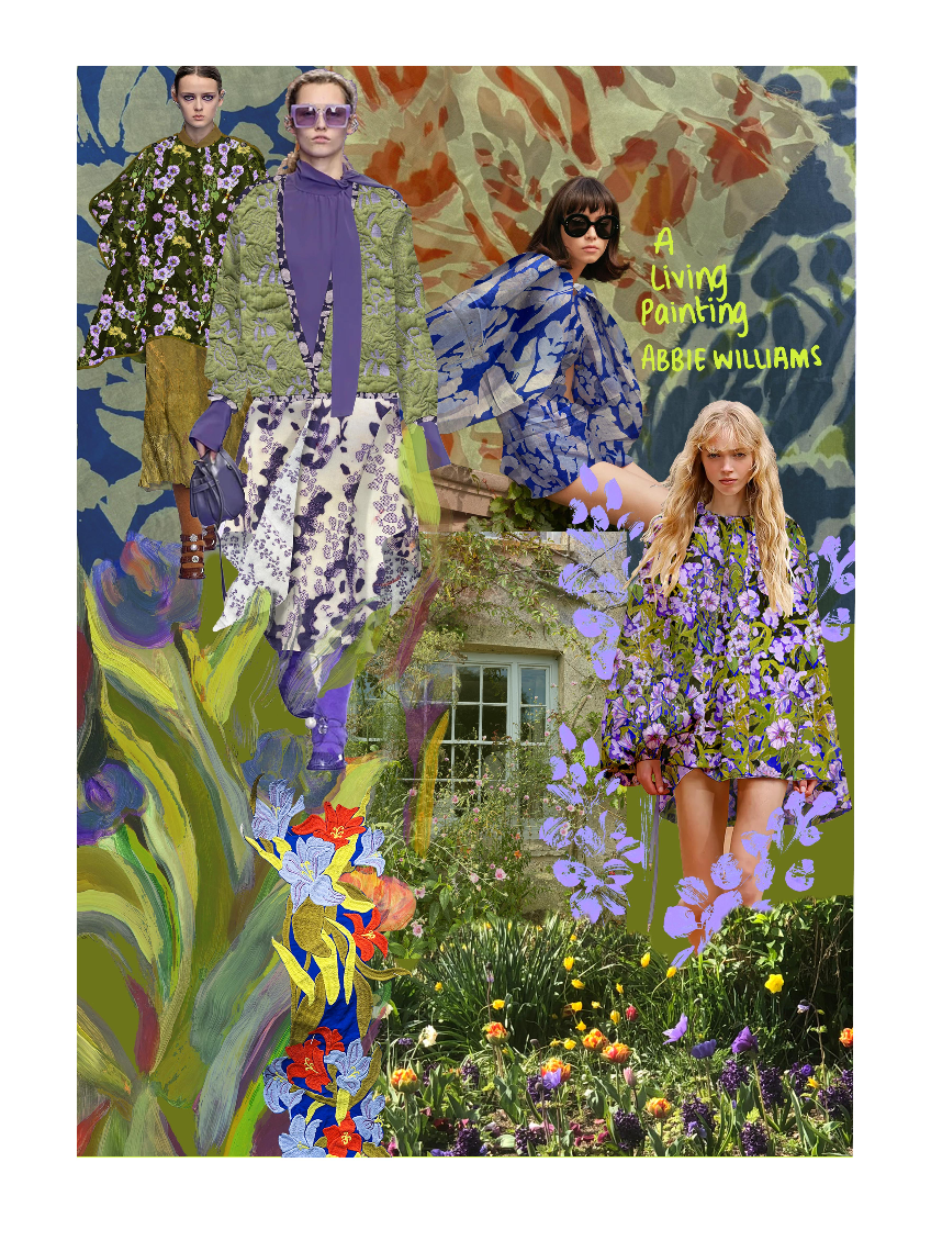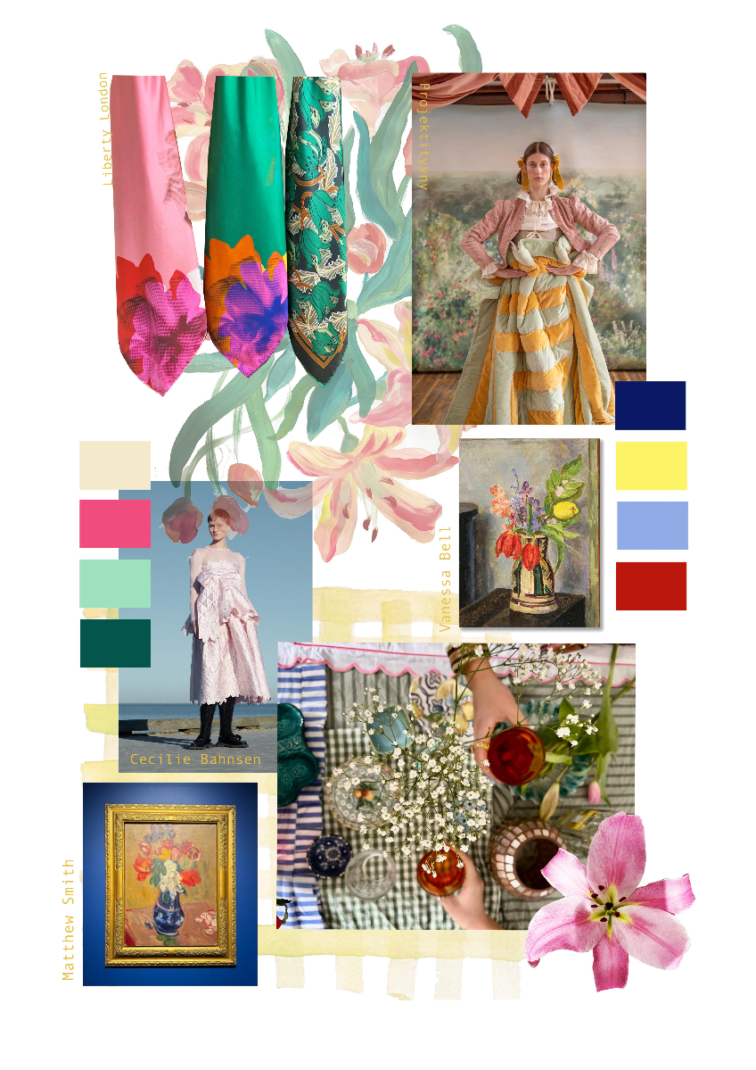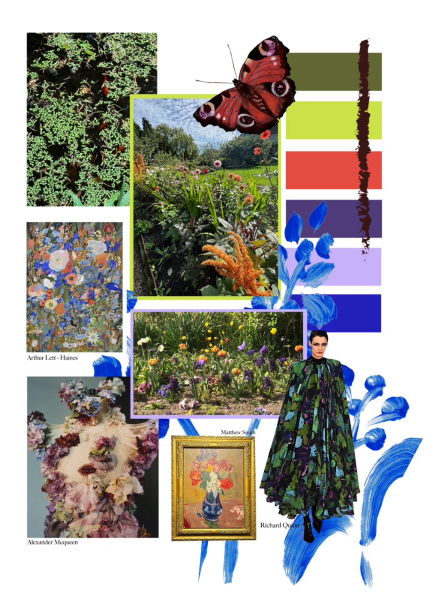 This Level 6 print and embellishment project; ‘A Living painting’, was specifically inspired by Charleston House in Lewis, home and creative hub for the Bloomsbury group. I was particularly inspired by Vanessa Bell, amongst other still life artists such as Matthew Smith, Cedric Morris and Arthur Lett-Haines. The bright floral gardens, alongside the maximilist house itself, motivated many paintings belonging to the Bloomsbury group themselves, leading to my own artistic journey encouraged by the estate. As a designer who has always been passionate about fine art, I enjoyed the process of using my artwork to fuel inspiration throughout the duration of this project.