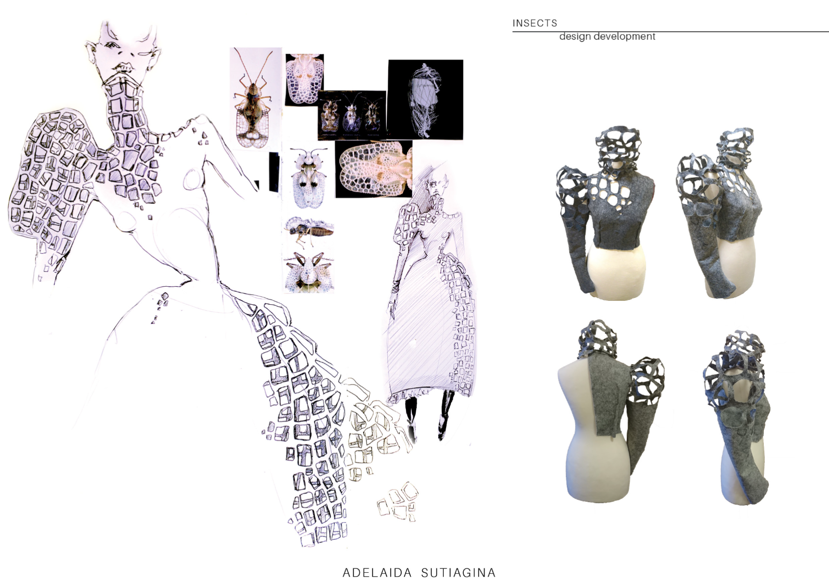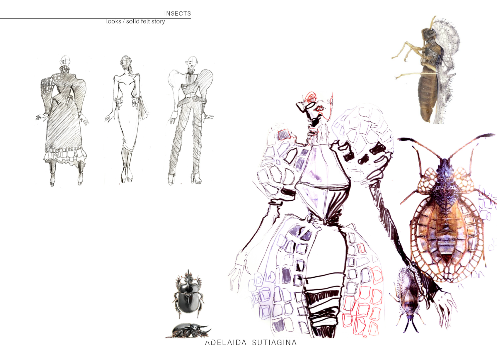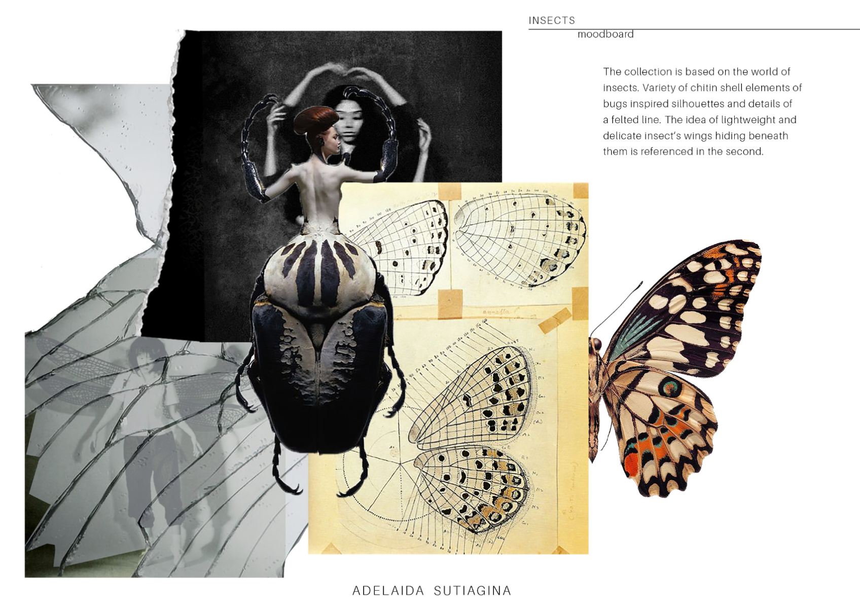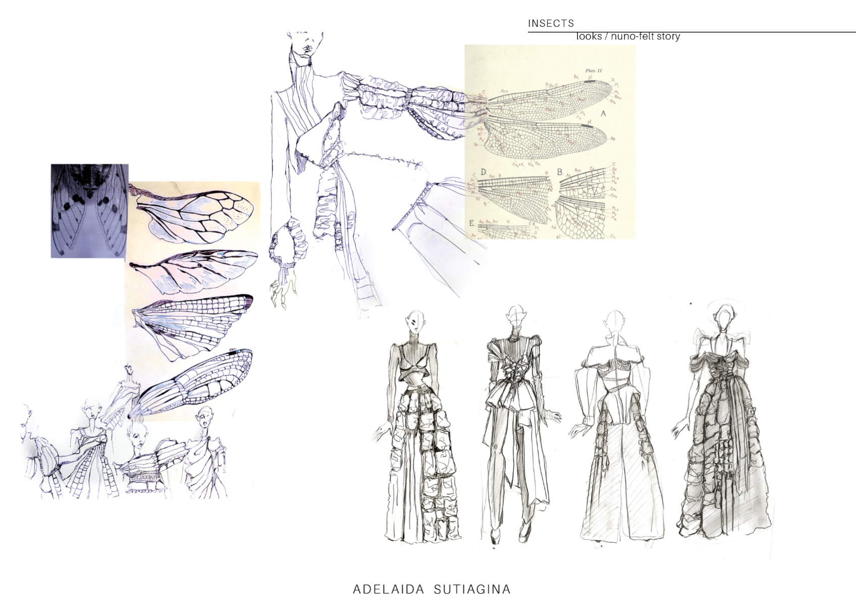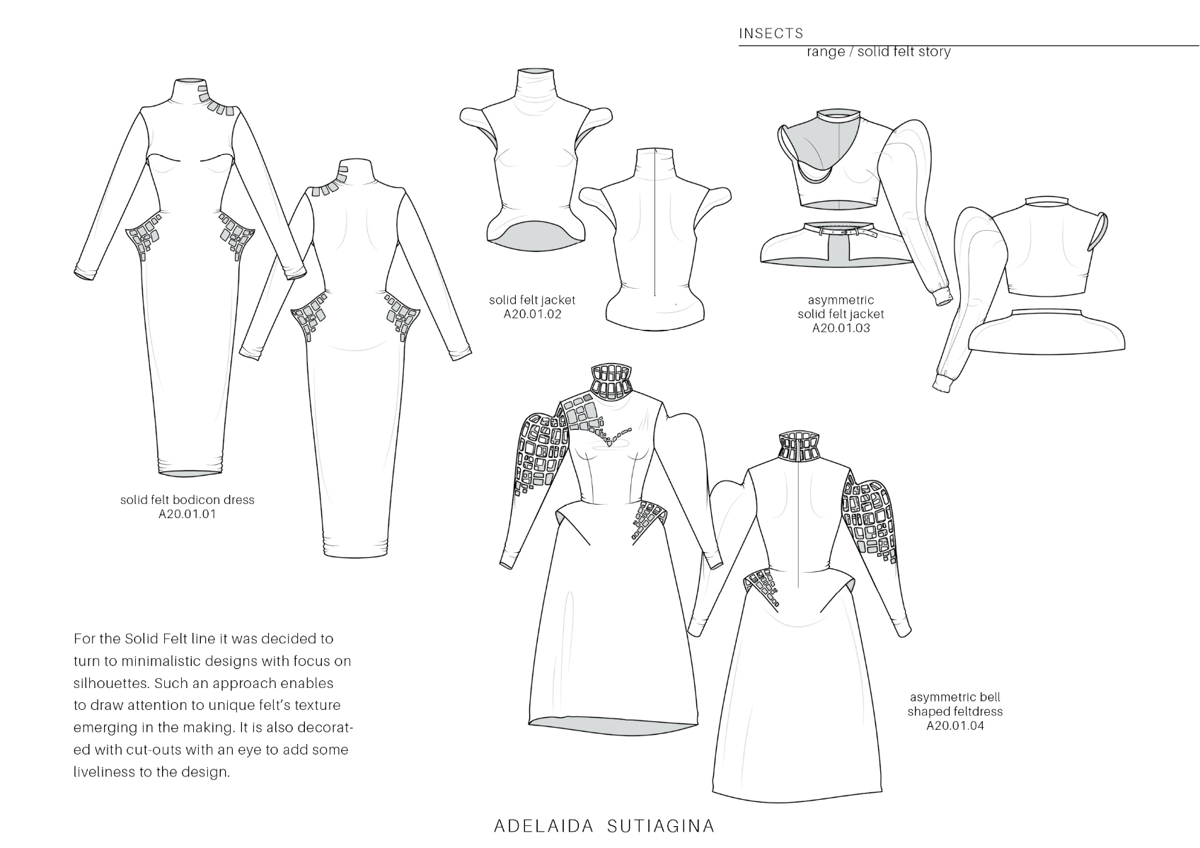 This project is based on the world of insects. Variety of chitin shell elements of bugs inspired silhouettes and details of the first felted line. The idea of lightweight and delicate insect’s wings hiding beneath them is referenced in the second. It manifests itself in the choice of fabric (translucent silk chiffon) and pattern of gathered parts of garments. The combination of the two represents a fragile balance, beauty between seemingly diametric poles underlying nature.