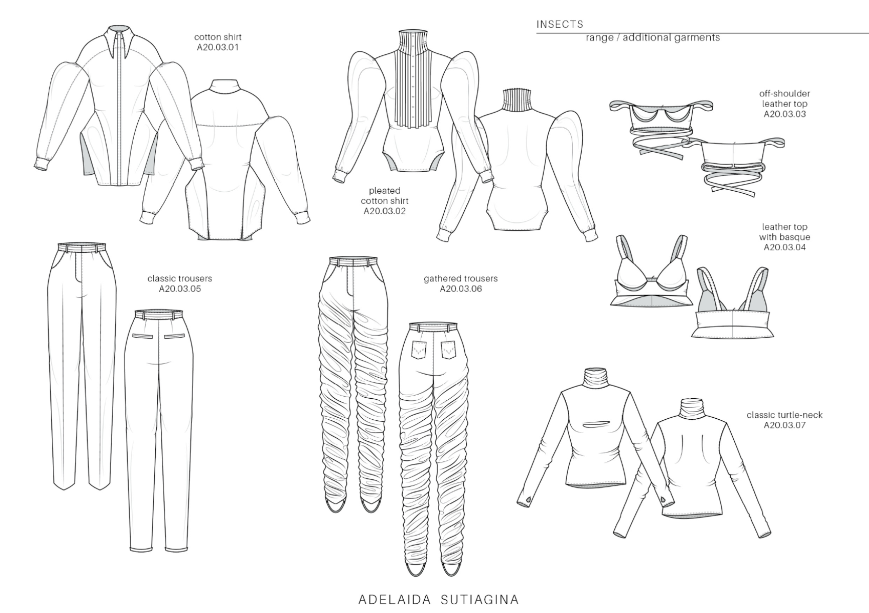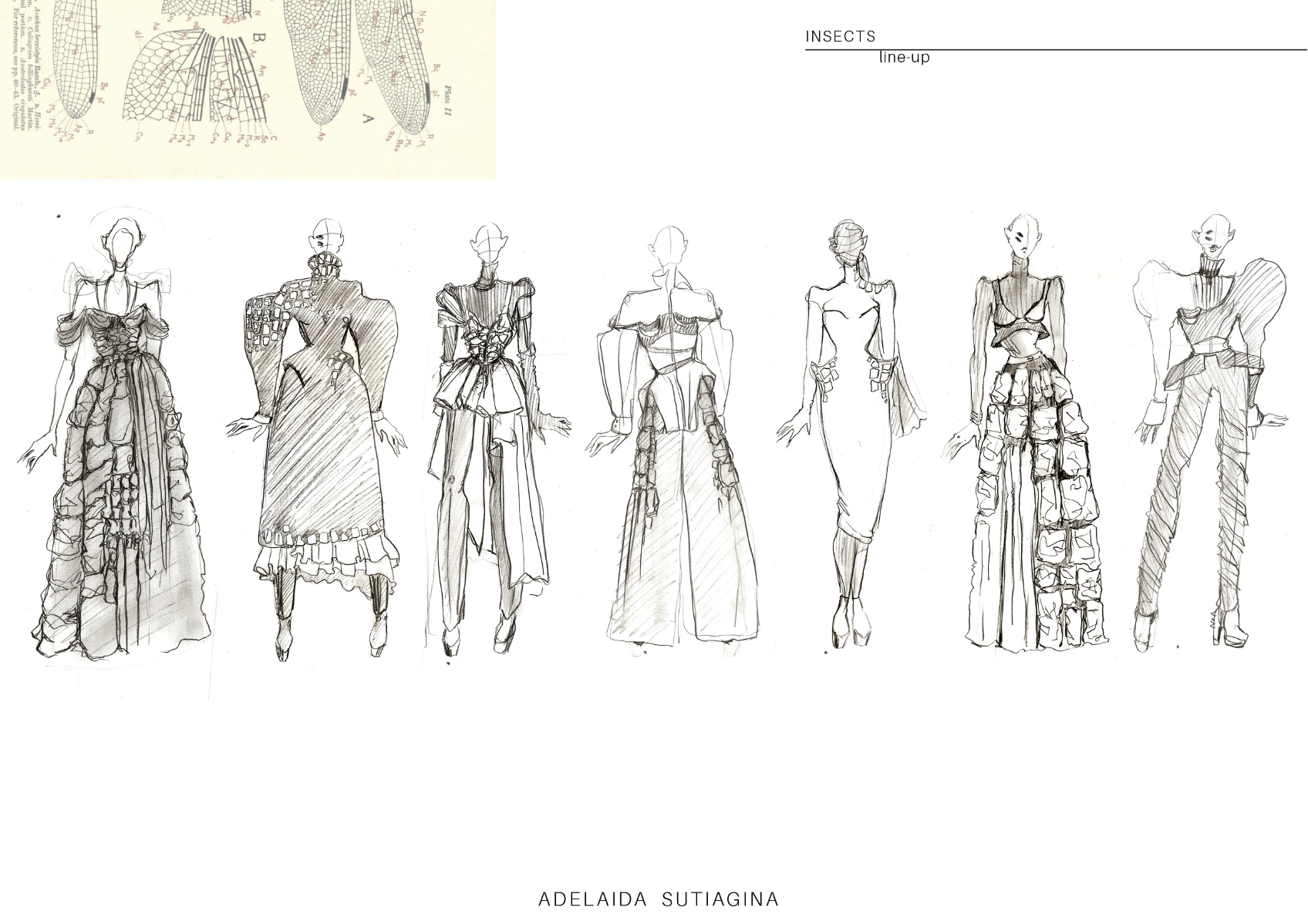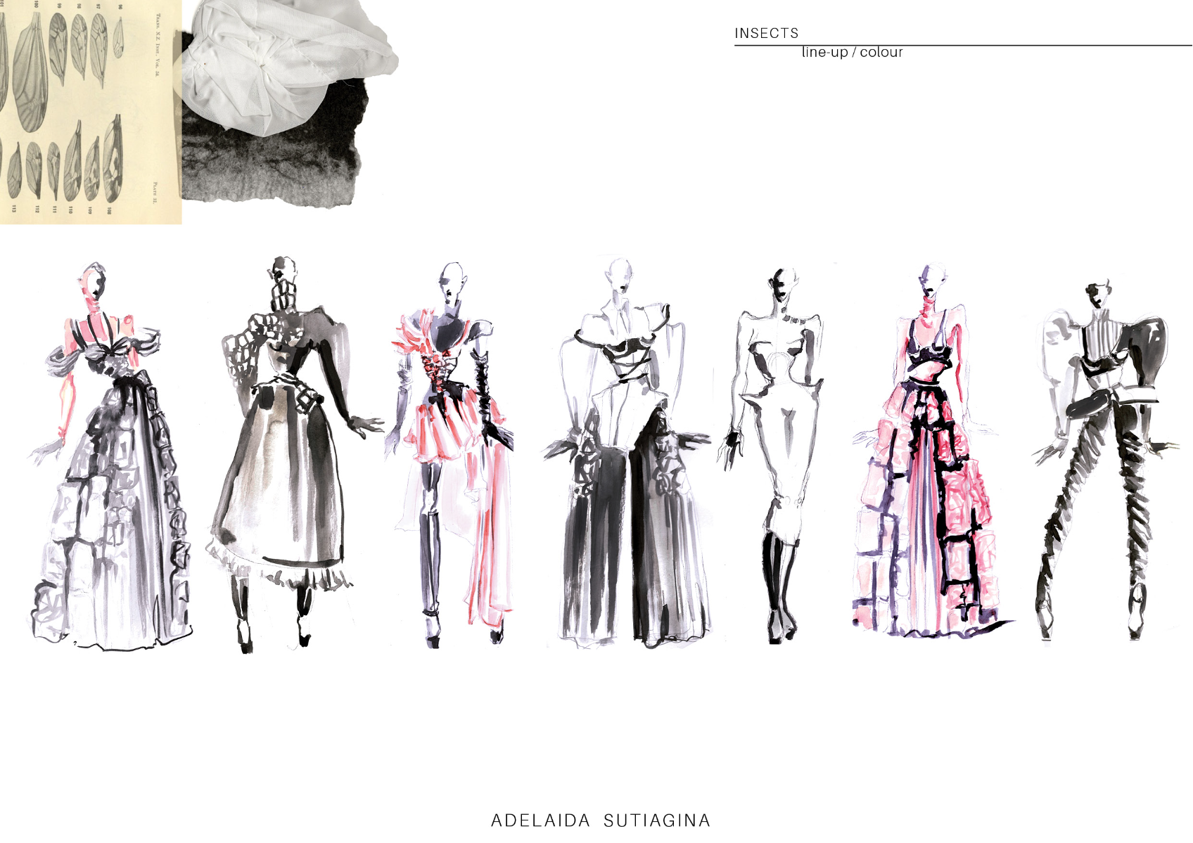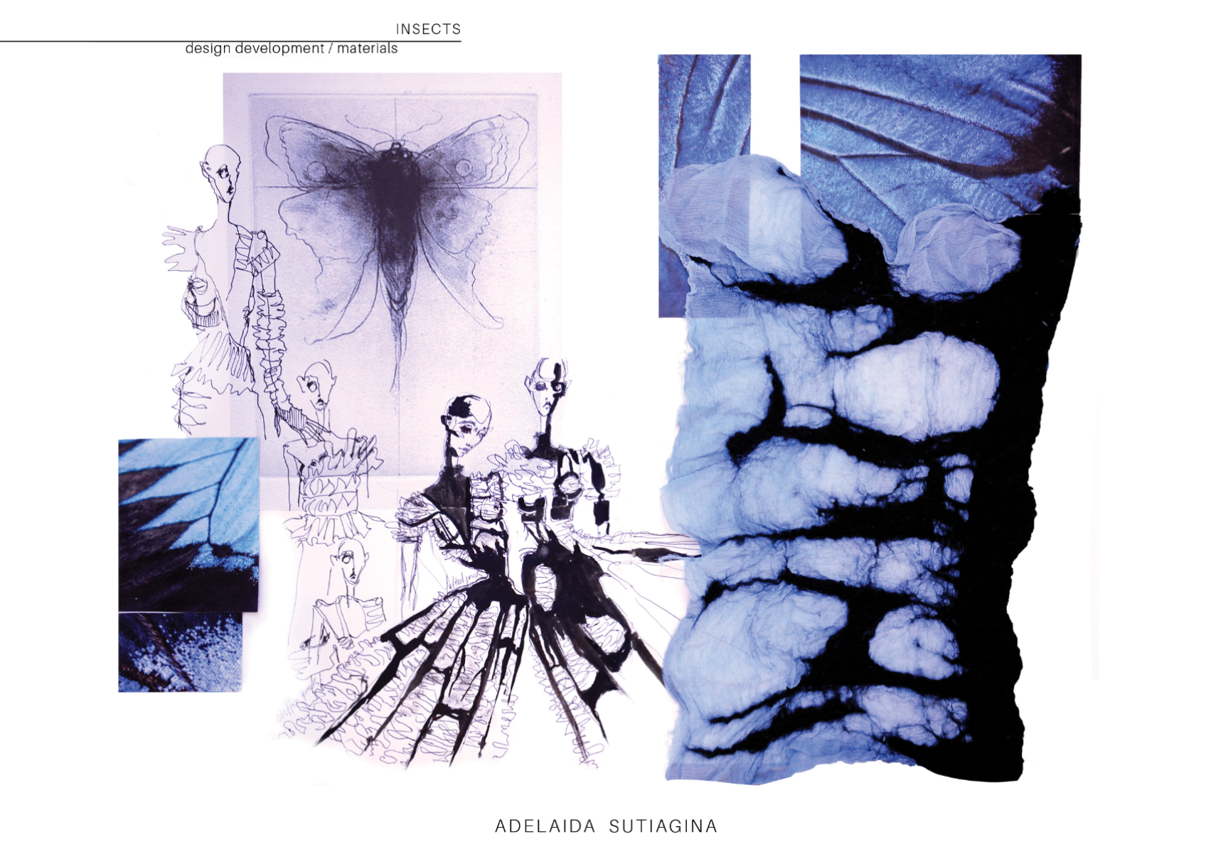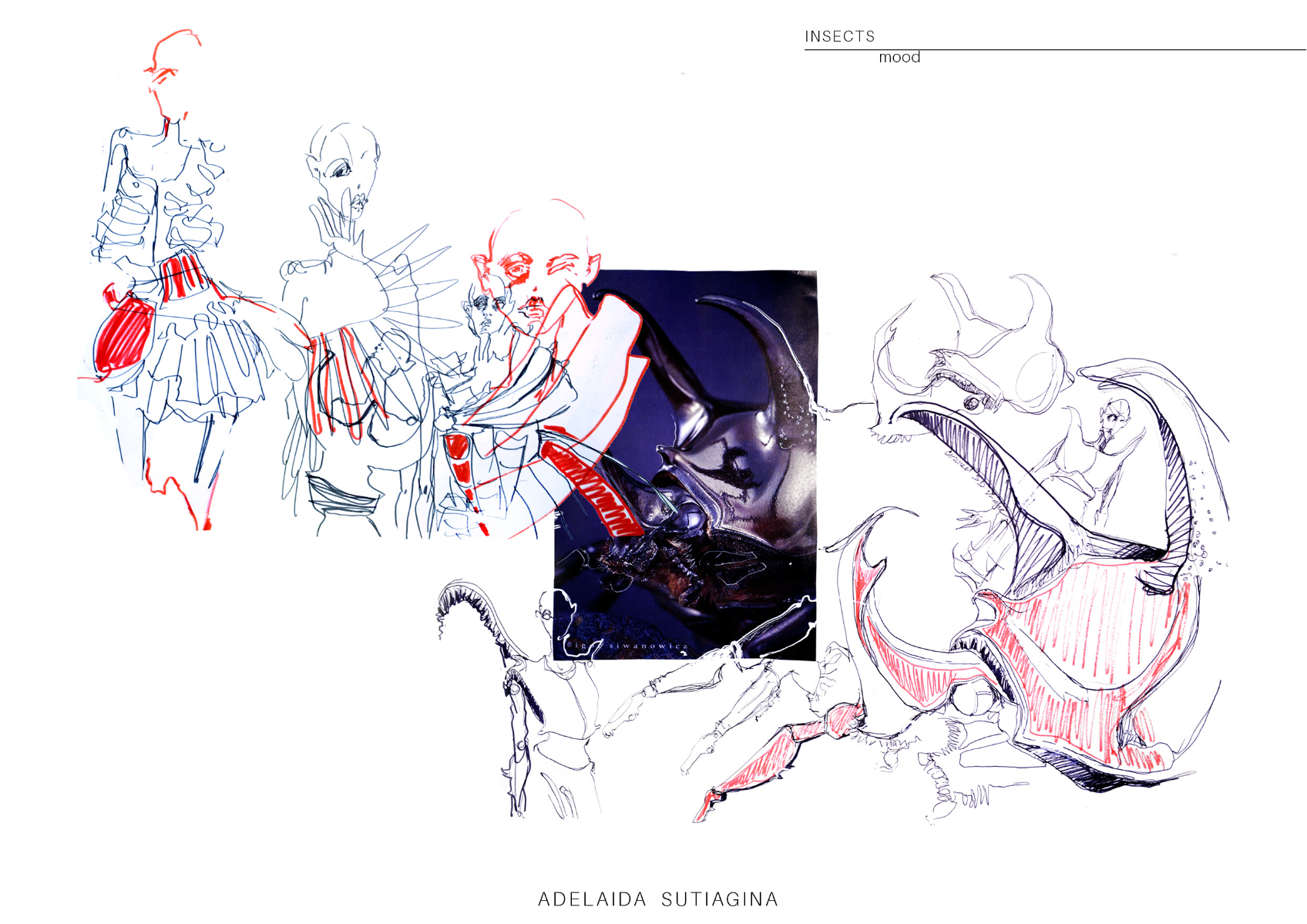 This project is based on the world of insects. Variety of chitin shell elements of bugs inspired silhouettes and details of the first felted line. The idea of lightweight and delicate insect’s wings hiding beneath them is referenced in the second. It manifests itself in the choice of fabric (translucent silk chiffon) and pattern of gathered parts of garments. The combination of the two represents a fragile balance, beauty between seemingly diametric poles underlying nature.