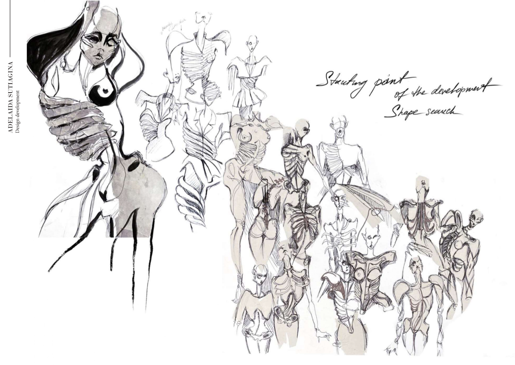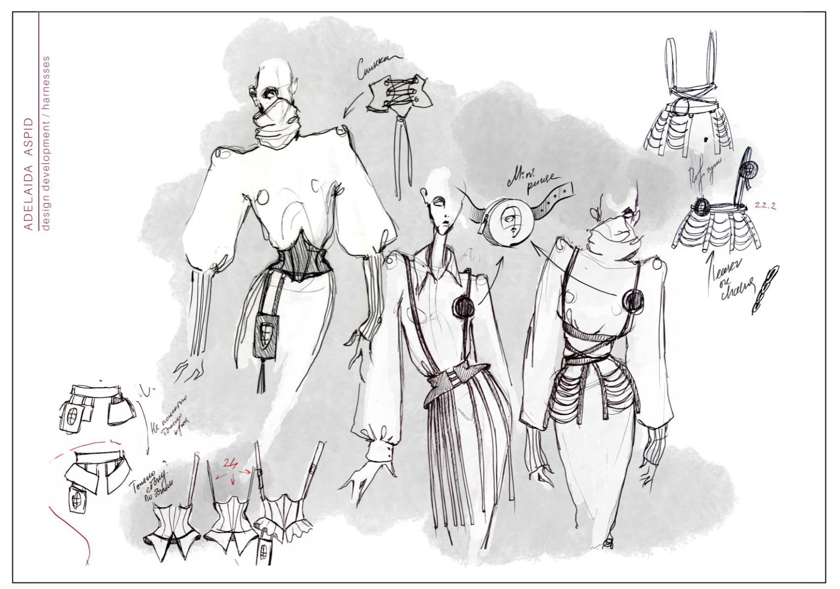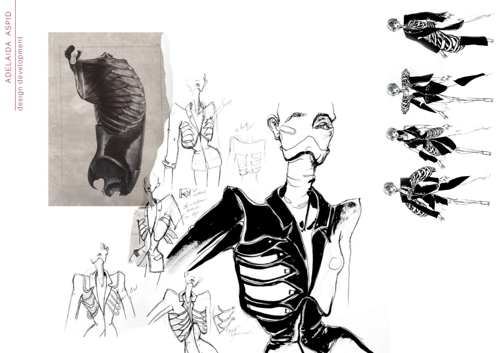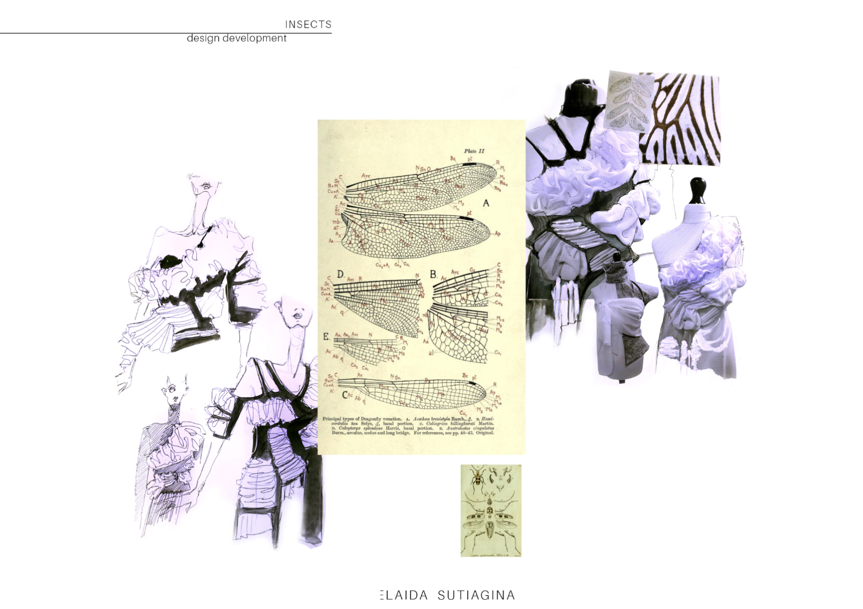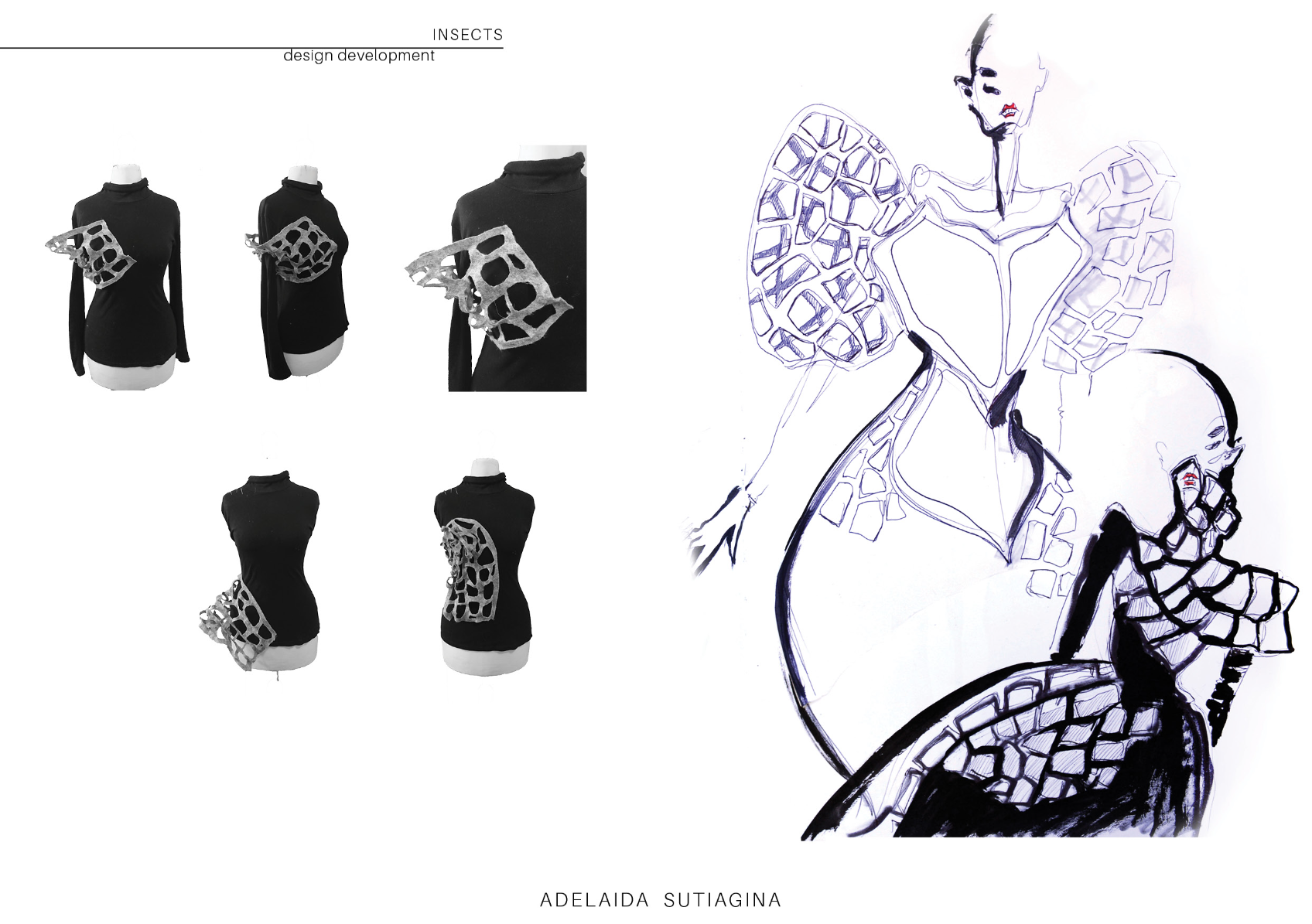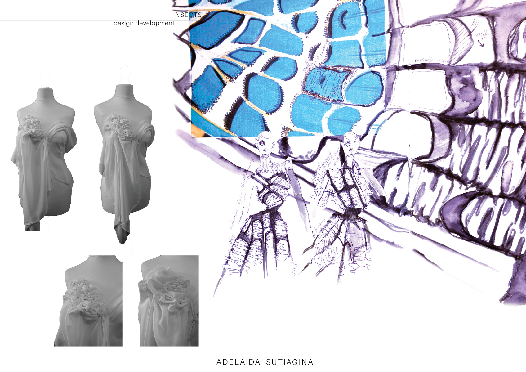 This project is based on the world of insects. Variety of chitin shell elements of bugs inspired silhouettes and details of the first felted line. The idea of lightweight and delicate insect’s wings hiding beneath them is referenced in the second. It manifests itself in the choice of fabric (translucent silk chiffon) and pattern of gathered parts of garments. The combination of the two represents a fragile balance, beauty between seemingly diametric poles underlying nature.