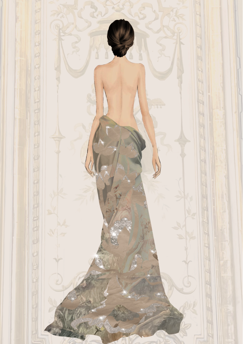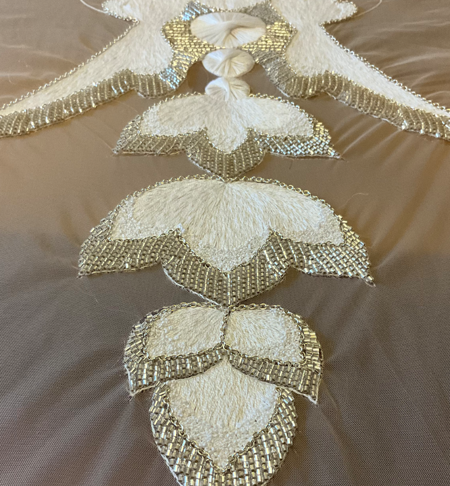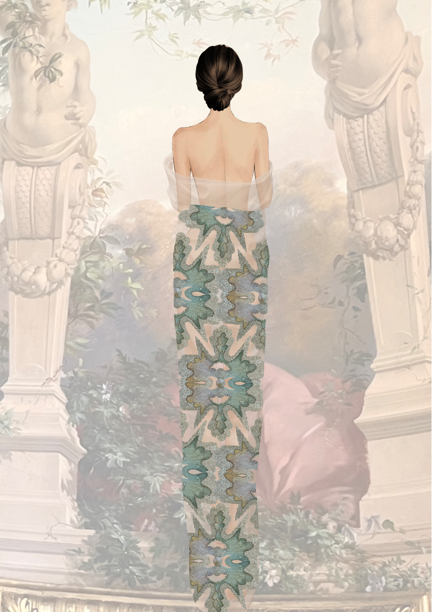 The relationship between the wearer, the garment and the embroidery is a key value to hand embroiderer, Alana Holmes’ practice. Celestial Embrace is an embellished wrap that offers the wearer the opportunity to become an integral part of the creative journey, embodying an experience of elegance, grace and empowerment. Ethereal beauty, baroque opulence and the grandeur of religious and royal settings are the creative inspiration used in the design of Celestial Embrace. These inspirations have led Alana to select intricate hand embroidery techniques such as long and short stitches, French knots and the embellishment of tamboured hexagon beads, pearls, diamantes and delicate lace to create a textural appearance. The use of watercolour painted on to the stitched surface adds a sense of fluidity and vibrancy to the work. Alana has meticulously chosen these techniques and materials. The long and short stitches reflect the texture of the decorative architectural wood, the beads and embellishments create a regal aura, paired together they uniquely reflect an ethereal quality. Carefully selected materials ensure a rich yet lightweight feel, and sheer fabrics allow the wearer’s skin to come directly into contact with the embroidery for a sensuous and intimate embrace. Drawing inspiration from architecture and works of art for both the structural and decorative elements; Alana incorporates these features in a way that feels dynamic and fluid. Following her values she has created an evening wear piece that is not simply a garment but a work of art! Through her work, Alana Holmes produces bespoke women’s evening wear that resonates deeply with the wearer, evoking the same emotions and sense of grandeur that she experiences herself in the powerful, beautiful settings she draws inspiration from. Each piece is not only a reflection of Alana’s vision but a medium through which the wearer can capture and indulge in their own personal narrative.