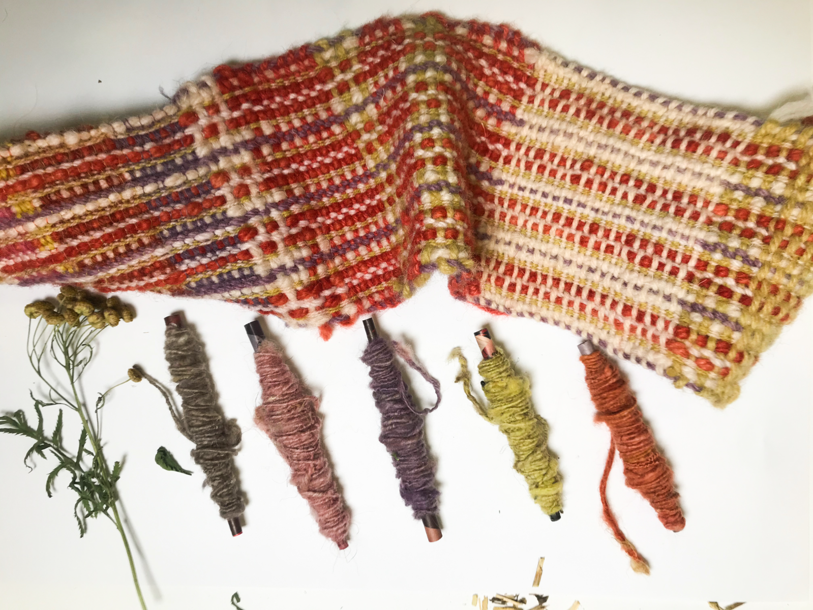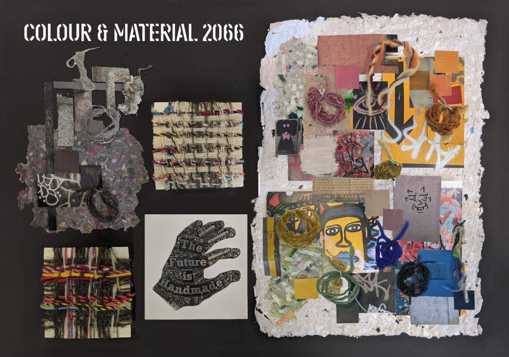 My concept for this project was inspired by urban waste and graffiti and what the world will be like in 2066, I concluded that the world will be in a state of disrepair and all of our textiles will have to be hand-spun using locally sourced materials, such as wool and recycled textiles, as well as coloured with waste products. I extracted colour from food waste and used existing colour on discarded textiles. I experimented dyeing with onion skins, berries, beetroot, cabbage, black beans and rosemary to get a range of colour. I was very aware of using as little water and heat as possible. I tested carding and spinning yarn from scrap yarn bins to bring bursts of colour throughout the weave. I also used the natural colour of Welsh Mountain Balwen fleece, alpaca and Texel fleece I had obtained.