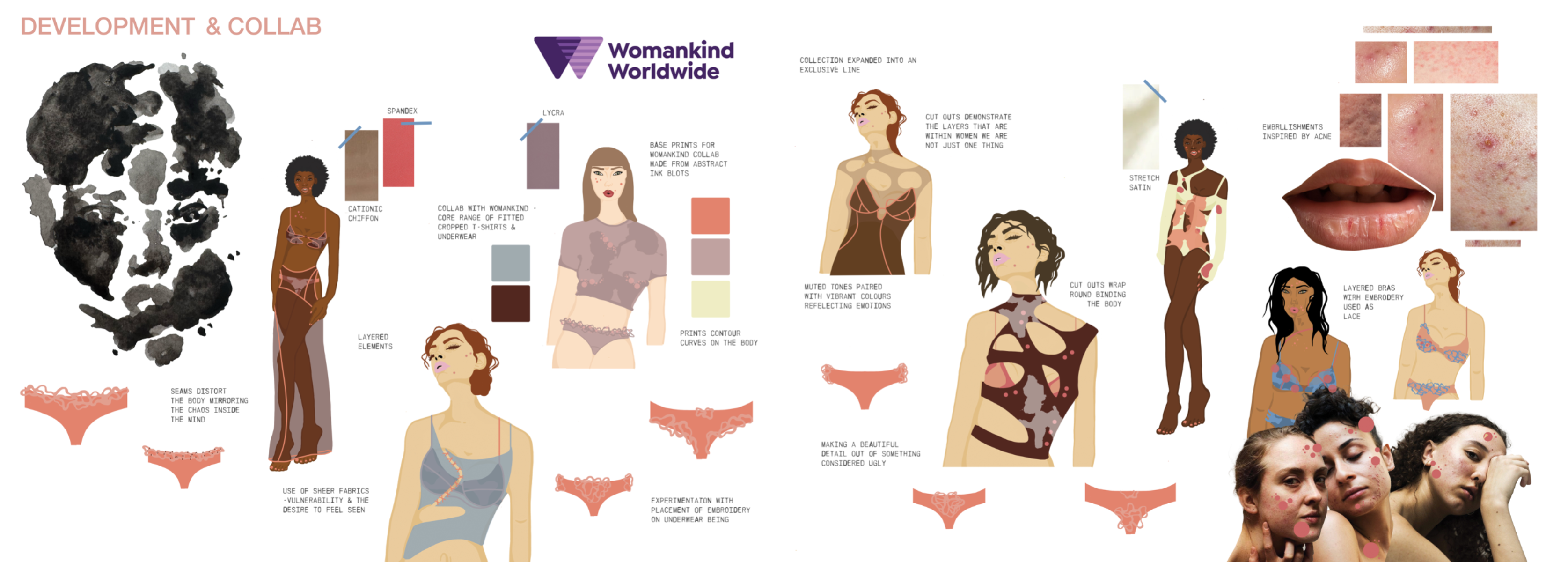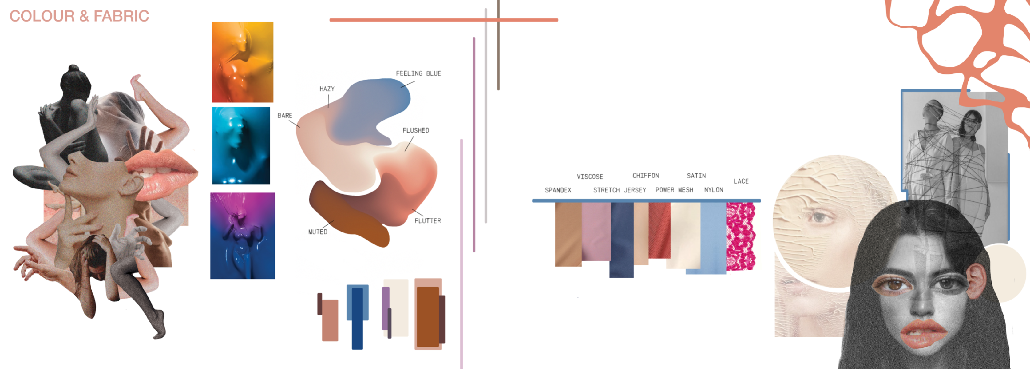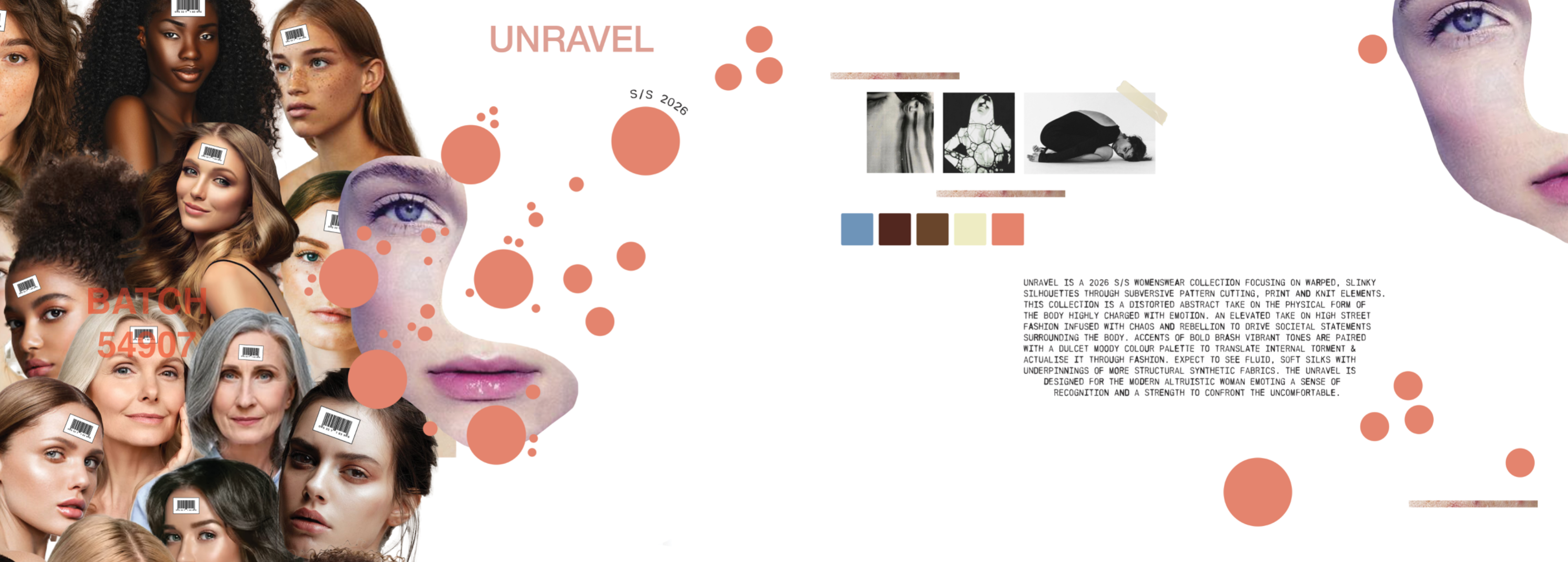A celebration of the female body through a humanistic lens. Highlighting textures, marks and colours within skin while focusing on silhouette and form, using creative pattern cutting, abstract print, and fabric manipulation. Embracing imperfections, showcasing their inherent beauty as an ode to the experience of femininity.