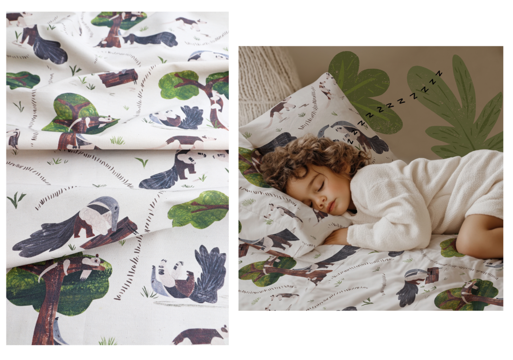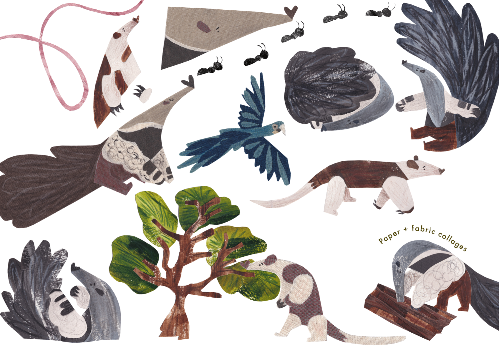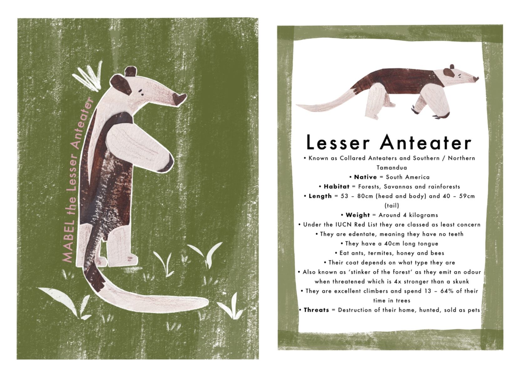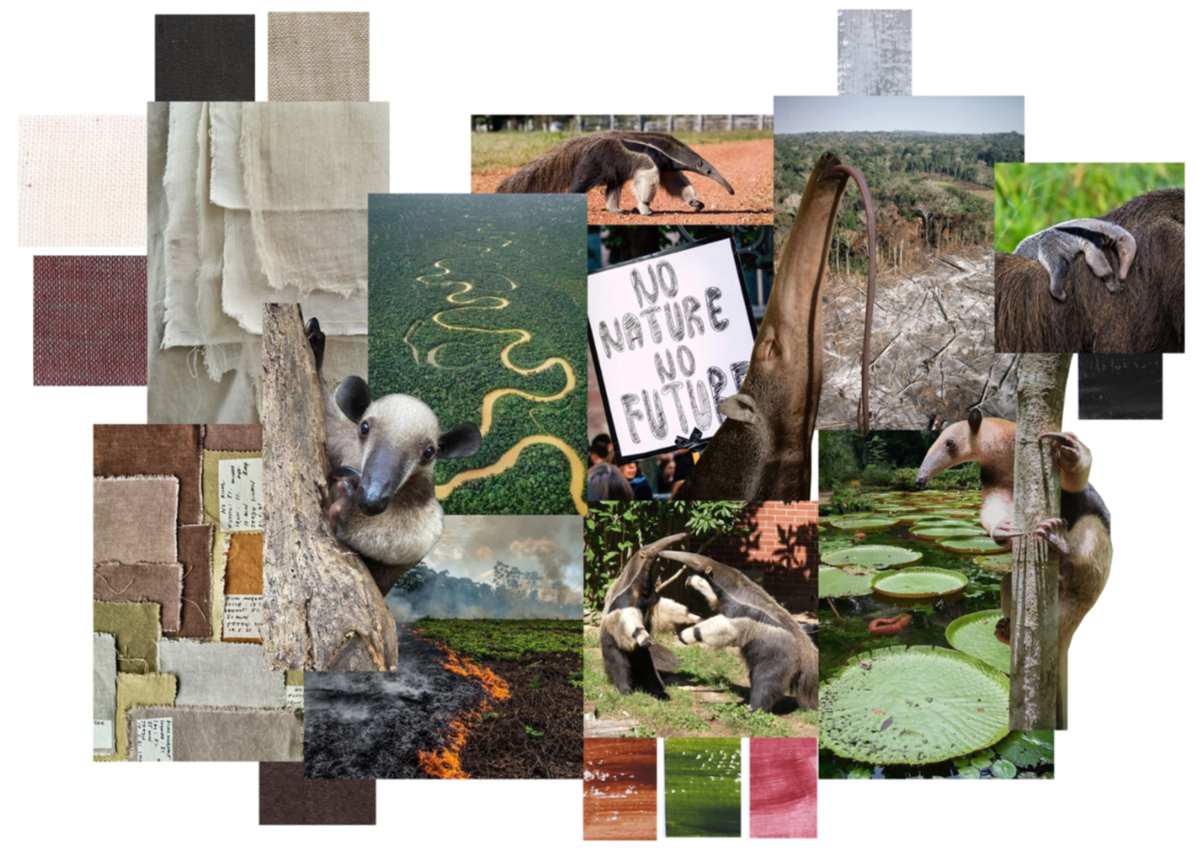 As a designer Amy has empathy for biodiversity and is inspired by the creatures that live among us. ‘Anteatering Around’ is a collection of illustrative, multi contextual pieces. They explore the personality and lives of Giant and Lesser Anteaters along with their habitats and threats. They encourage conversation, create interest and encourage education surrounding the declining species and habitat. This collection is in response to the intensification of our climate crisis and consumer demands of clean, sustainable products. People are also losing their connection with nature and the importance surrounding it. The collection has been carefully considered to encourage these aspects, using clean as possible methods, 100% clean materials, no dyes and include educational aspects. Through these means it meets both goal 13 (climate action) and 14 (life on land) of the United Nations Sustainable Development Goals. Amy is a multi-disciplinary designer with a unique illustrative style that evolves around storytelling. She has used a variety of hand techniques. Fabric and paper collage has been combined to create detailed, characterful motifs. Hand embroidery has been added for texture and screen printing has been applied to translate her sketchy digital mark making. 100% naturally dyed and undyed fabric and yarn has also been used, demonstrating to consumers what colours nature can produce. The materials and colours are also gender-neutral, which are not trend specific meaning the designs can be enjoyed year-round by everyone. ‘Anteatering Around’ is a multi-contextual collection, designed for both adults and kids allowing for close bonding and conversations. This specific collection contains artwork, fabric, toys and a reference book which are all for the home. Ultimately this project will be part of a bigger Amazon Rainforest collection where each animal, insect and bird is celebrated in the same manner.