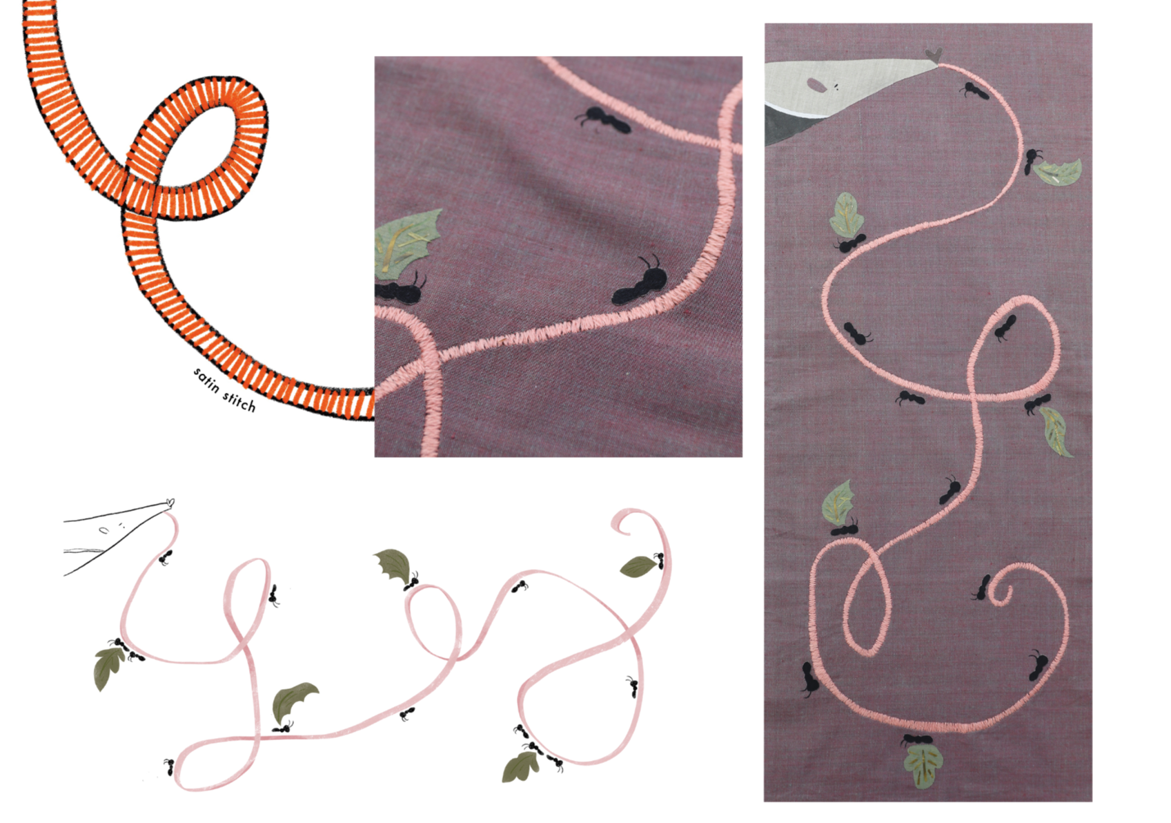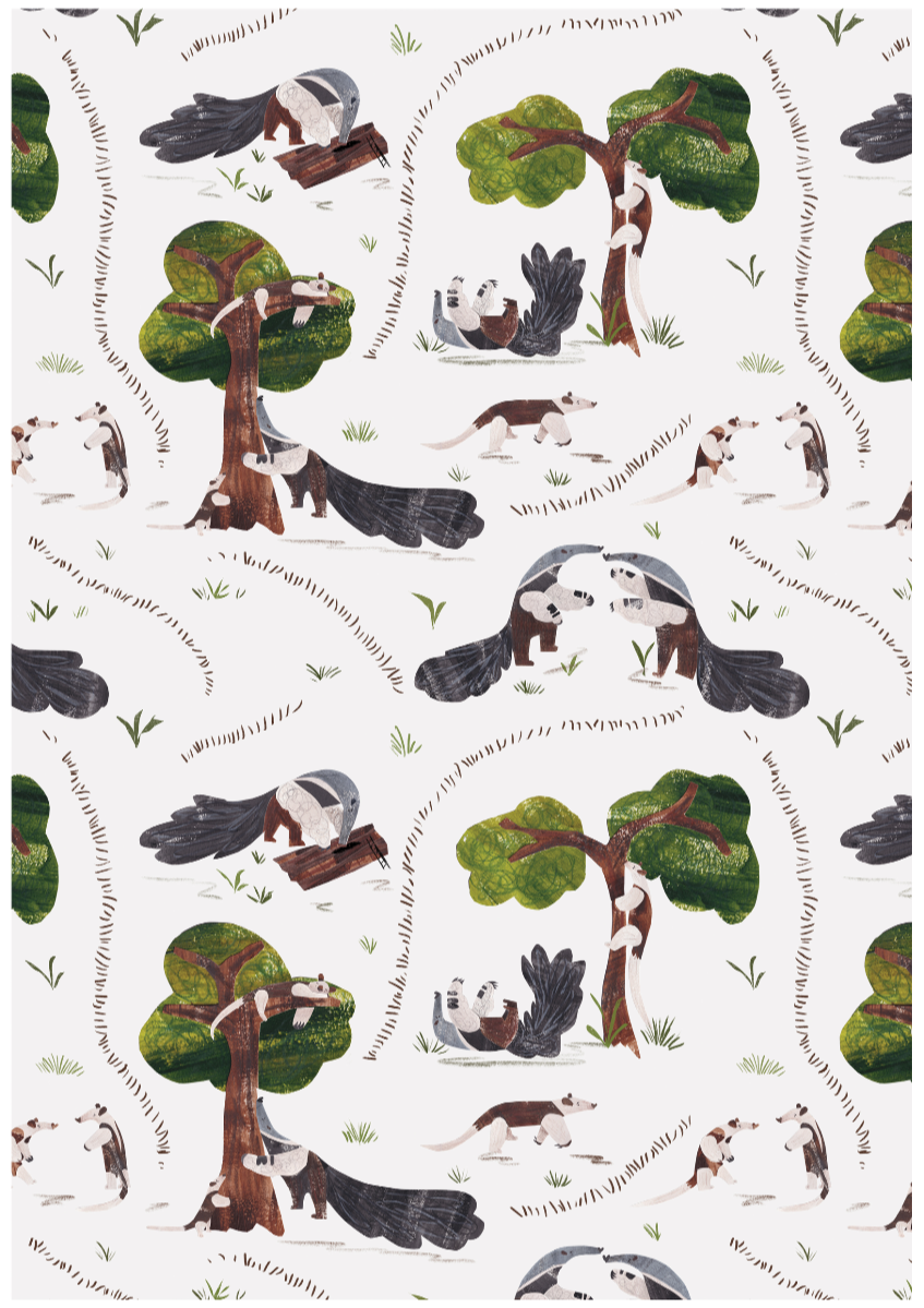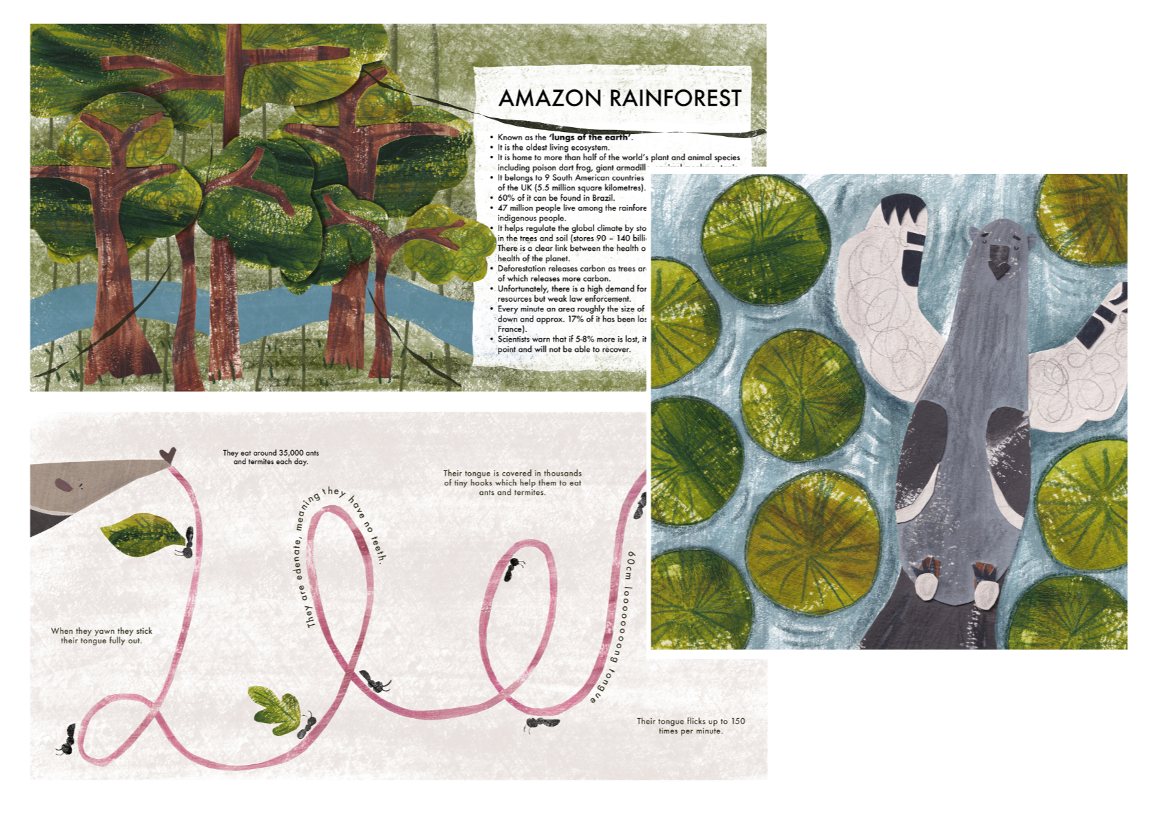 As a designer Amy has empathy for biodiversity and is inspired by the creatures that live among us. ‘Anteatering Around’ is a collection of illustrative, multi contextual pieces. They explore the personality and lives of Giant and Lesser Anteaters along with their habitats and threats. They encourage conversation, create interest and encourage education surrounding the declining species and habitat. This collection is in response to the intensification of our climate crisis and consumer demands of clean, sustainable products. People are also losing their connection with nature and the importance surrounding it. The collection has been carefully considered to encourage these aspects, using clean as possible methods, 100% clean materials, no dyes and include educational aspects. Through these means it meets both goal 13 (climate action) and 14 (life on land) of the United Nations Sustainable Development Goals. Amy is a multi-disciplinary designer with a unique illustrative style that evolves around storytelling. She has used a variety of hand techniques. Fabric and paper collage has been combined to create detailed, characterful motifs. Hand embroidery has been added for texture and screen printing has been applied to translate her sketchy digital mark making. 100% naturally dyed and undyed fabric and yarn has also been used, demonstrating to consumers what colours nature can produce. The materials and colours are also gender-neutral, which are not trend specific meaning the designs can be enjoyed year-round by everyone. ‘Anteatering Around’ is a multi-contextual collection, designed for both adults and kids allowing for close bonding and conversations. This specific collection contains artwork, fabric, toys and a reference book which are all for the home. Ultimately this project will be part of a bigger Amazon Rainforest collection where each animal, insect and bird is celebrated in the same manner.