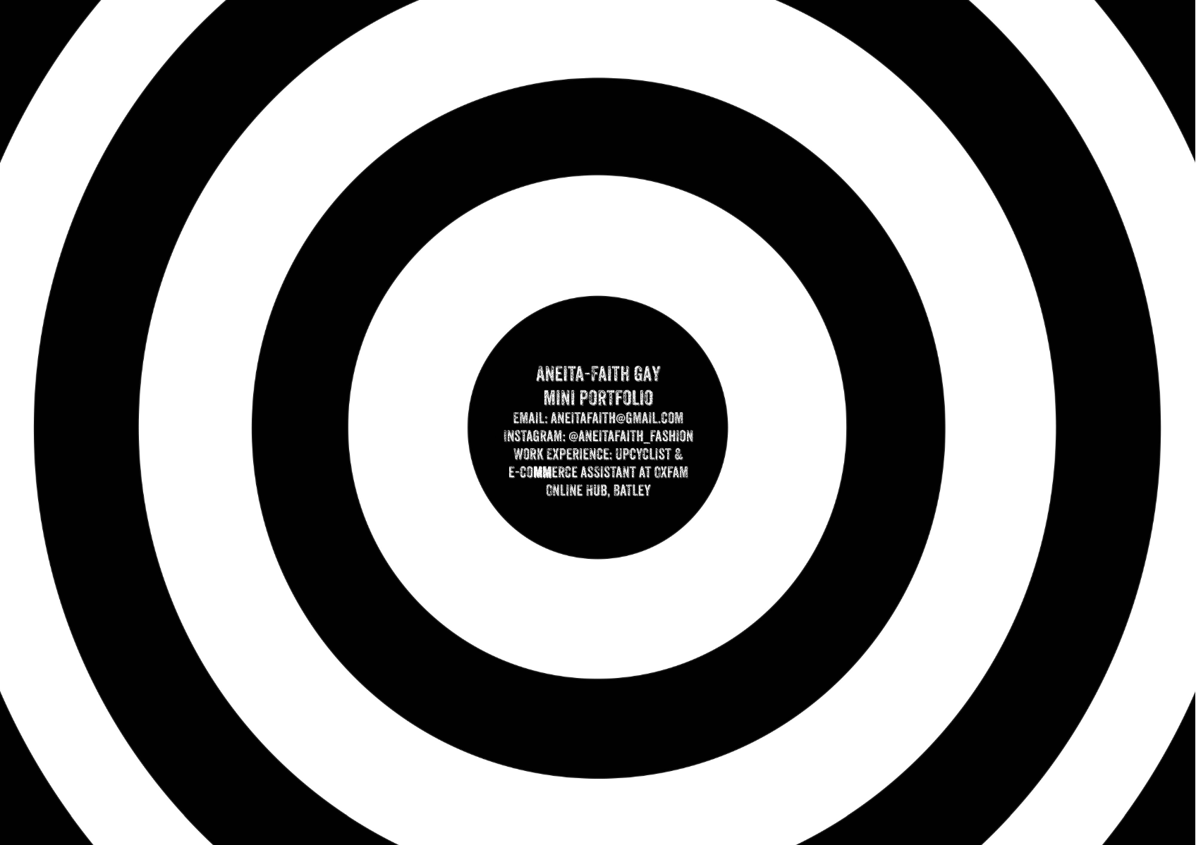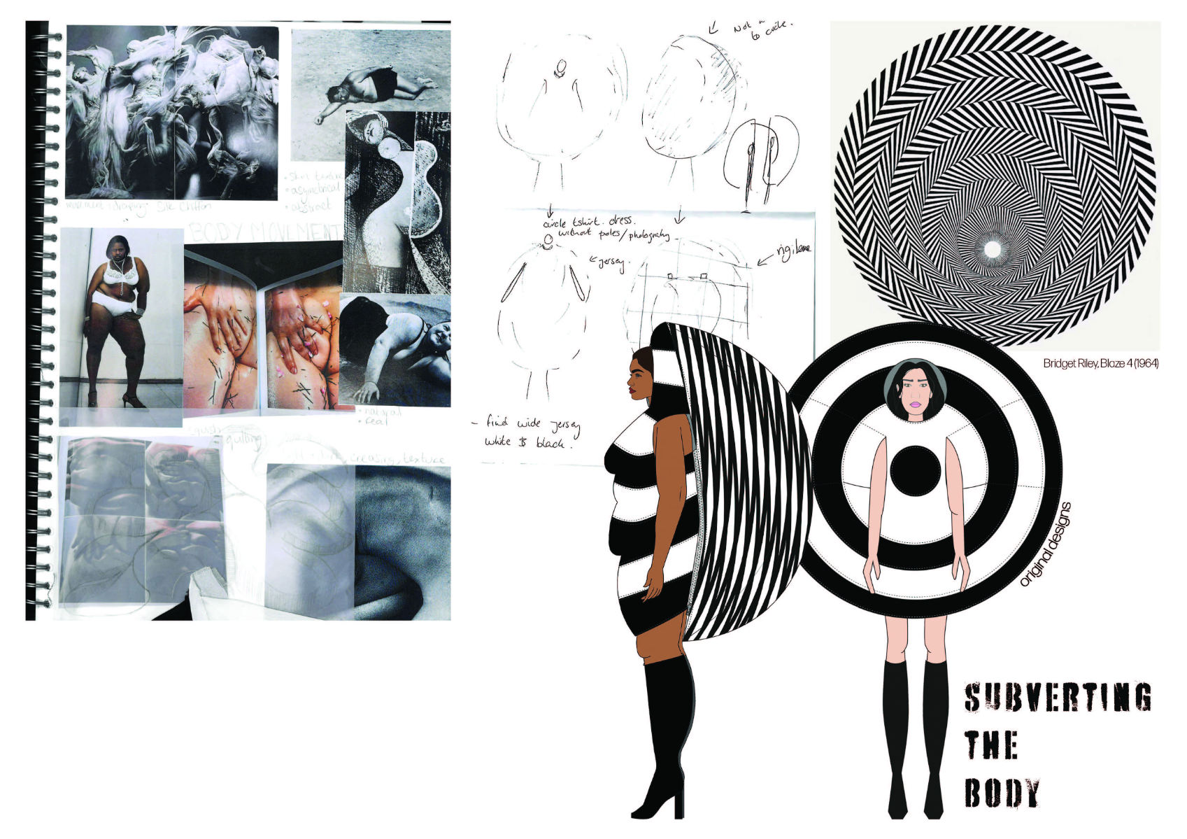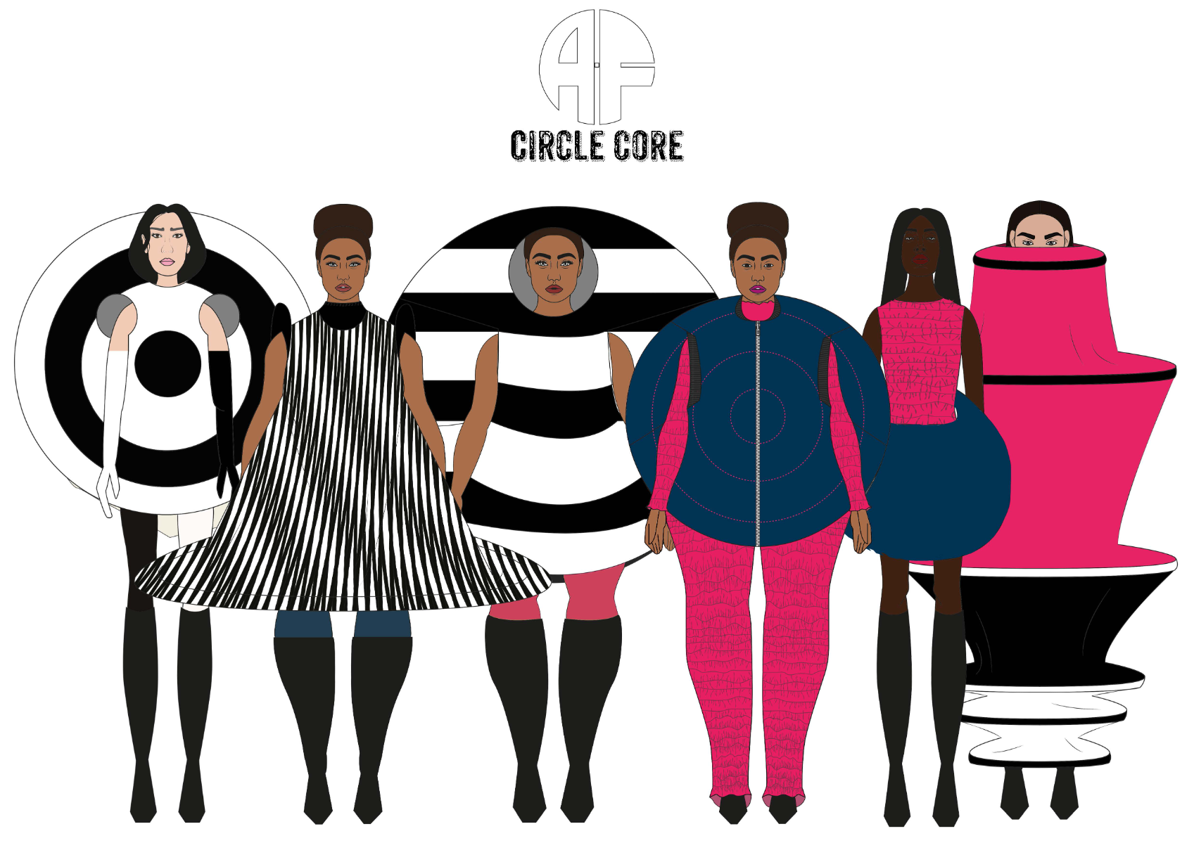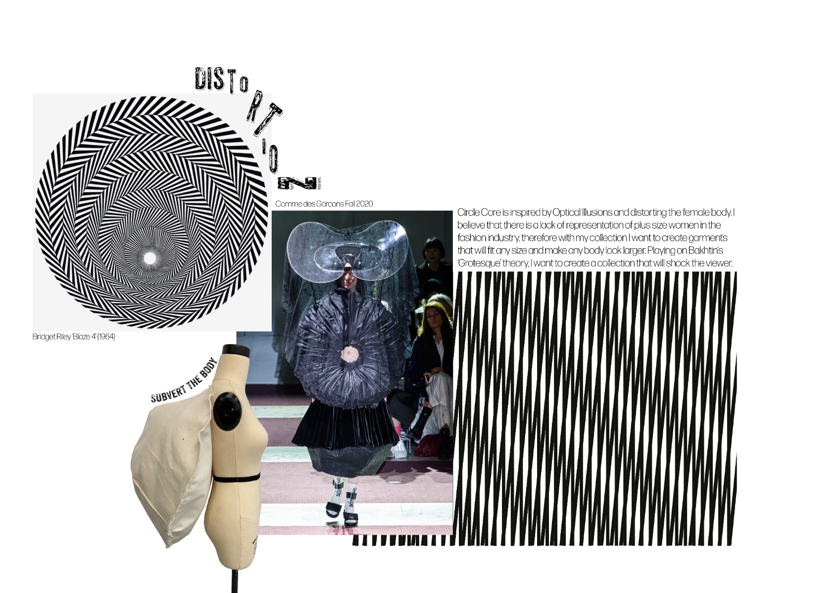 Circlecore is a collection inspired by Optical Art, especially Bridget Riley. The aim of this collection, is to distort society's perception of the female body and subvert the female body. Also inspired by Bakhtin's "grotesque theory" I created a collection that was oversized and fits every body, whilst creating a silhouette that isn't mostly desired by society. Looking at my collection, everyone will have a different notion of what I am expressing similar to how people view Optical Art. Circlecore also asks the question, Is There a Perfect Body?