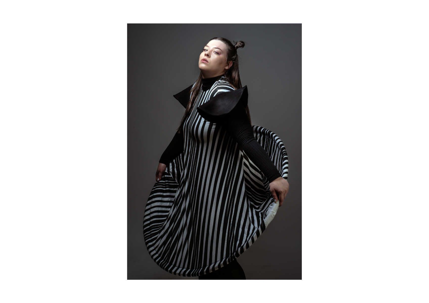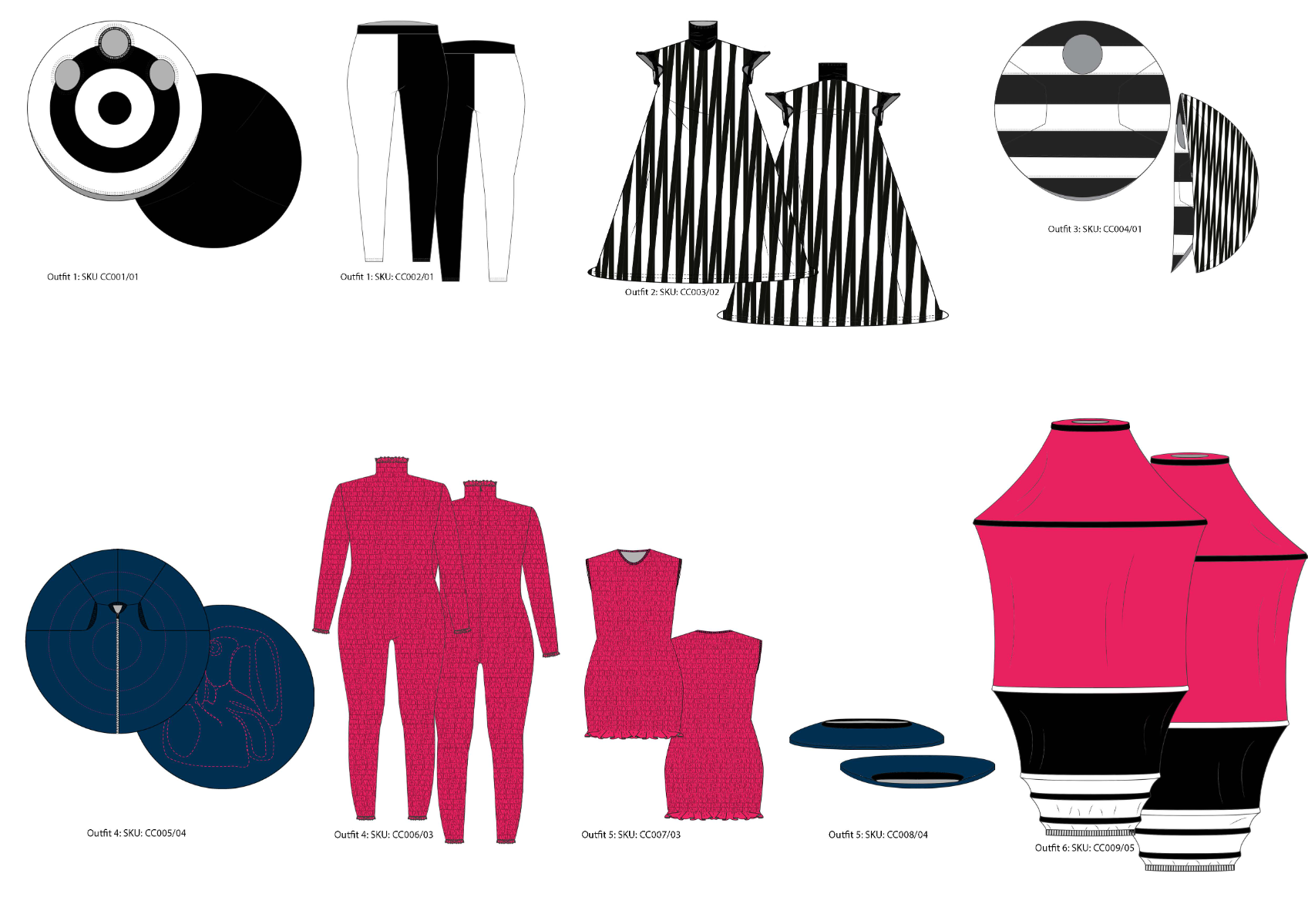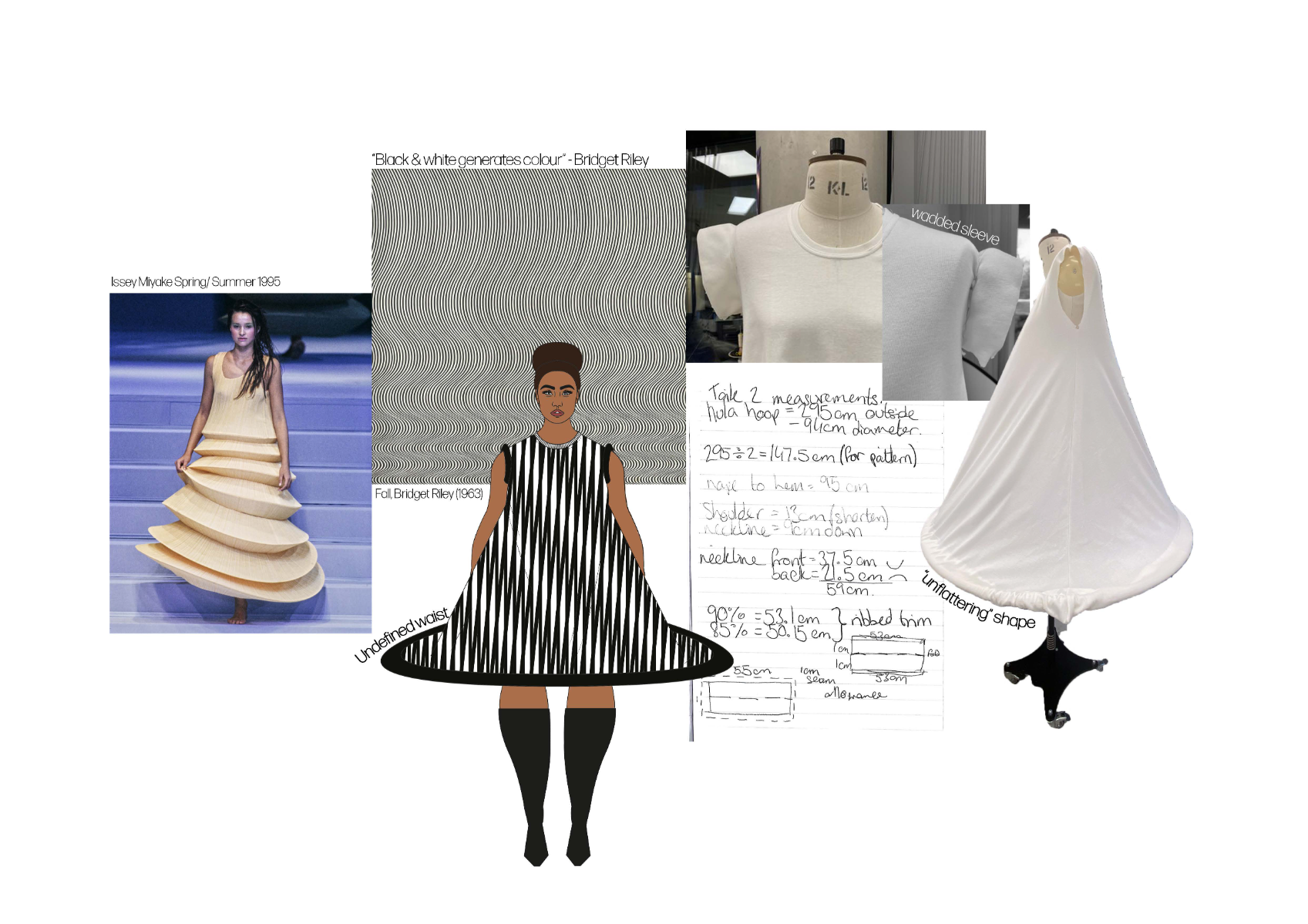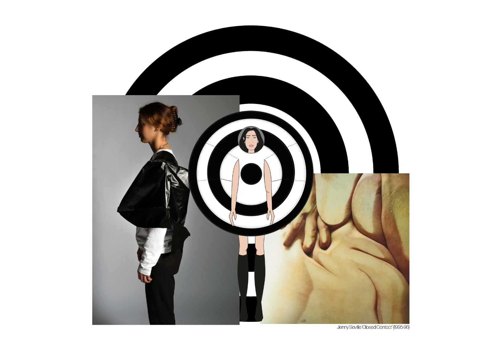 Circlecore is a collection inspired by Optical Art, especially Bridget Riley. The aim of this collection, is to distort society's perception of the female body and subvert the female body. Also inspired by Bakhtin's "grotesque theory" I created a collection that was oversized and fits every body, whilst creating a silhouette that isn't mostly desired by society. Looking at my collection, everyone will have a different notion of what I am expressing similar to how people view Optical Art. Circlecore also asks the question, Is There a Perfect Body?