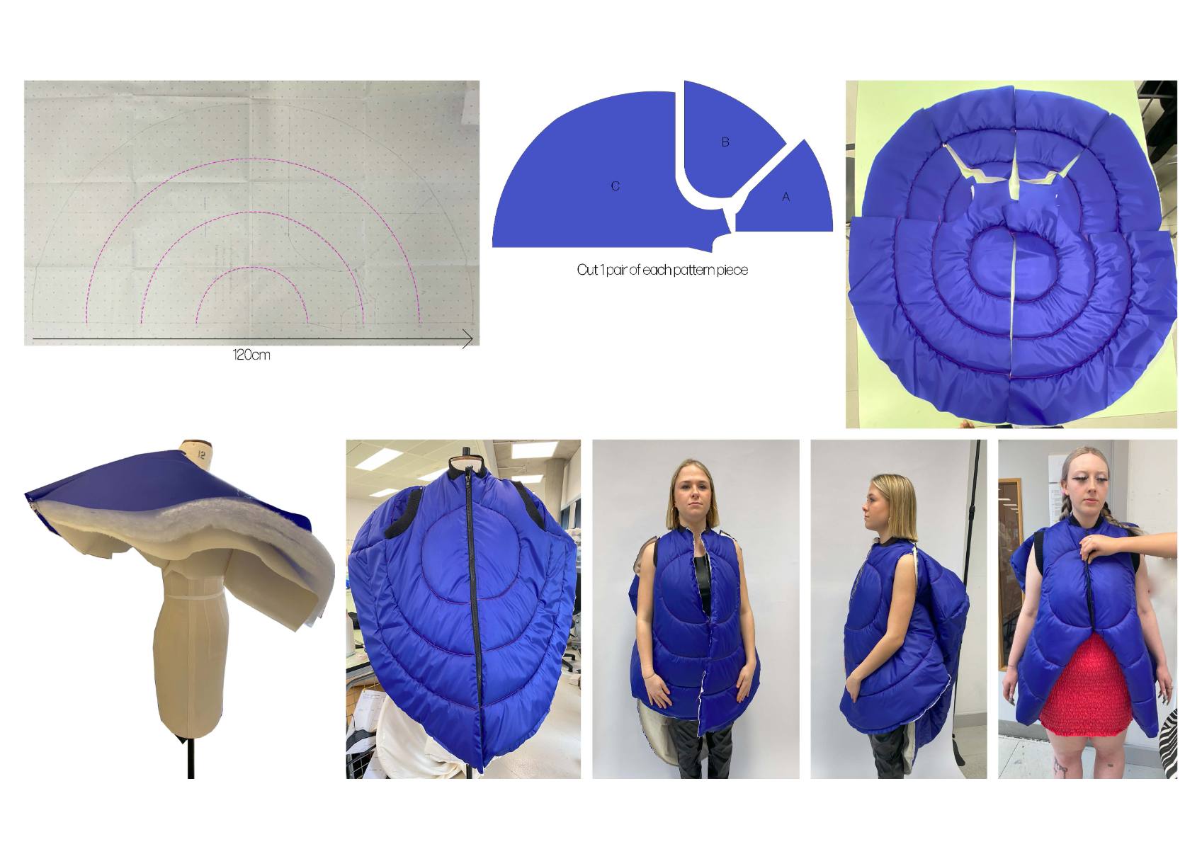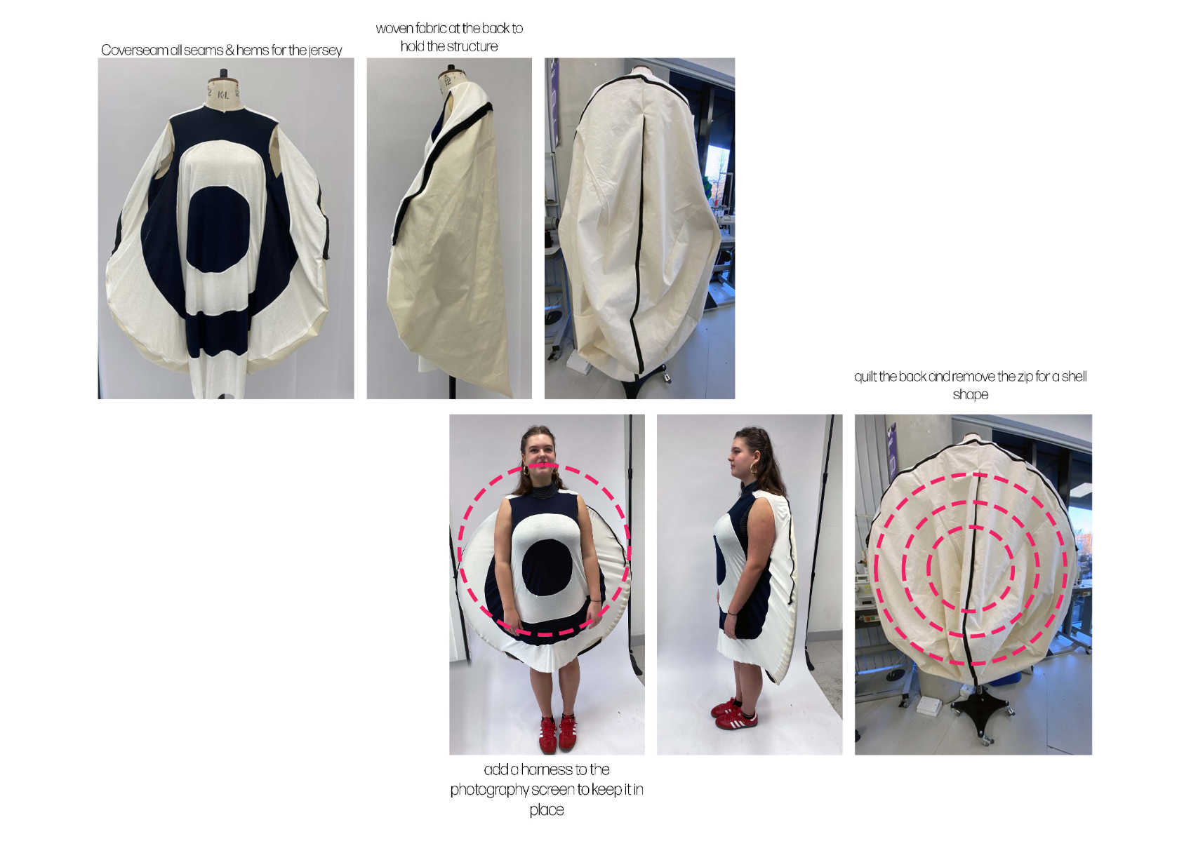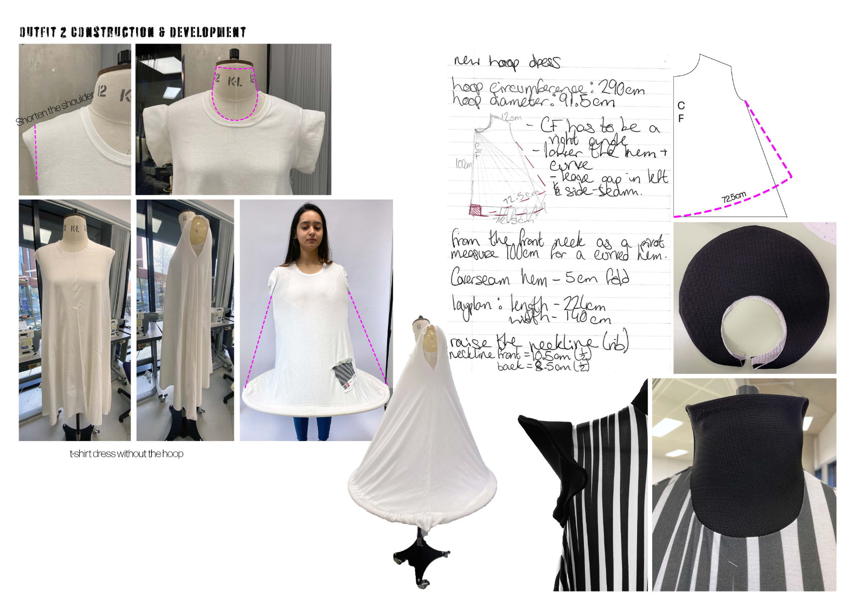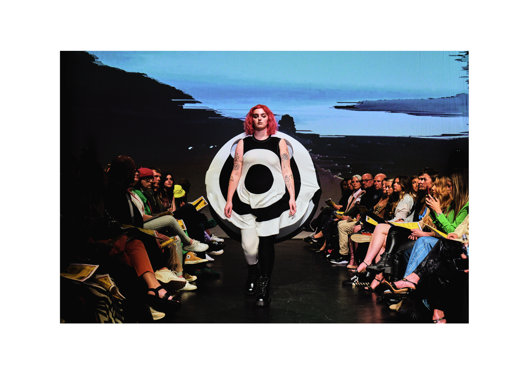 Circlecore is a collection inspired by Optical Art, especially Bridget Riley. The aim of this collection, is to distort society's perception of the female body and subvert the female body. Also inspired by Bakhtin's "grotesque theory" I created a collection that was oversized and fits every body, whilst creating a silhouette that isn't mostly desired by society. Looking at my collection, everyone will have a different notion of what I am expressing similar to how people view Optical Art. Circlecore also asks the question, Is There a Perfect Body?