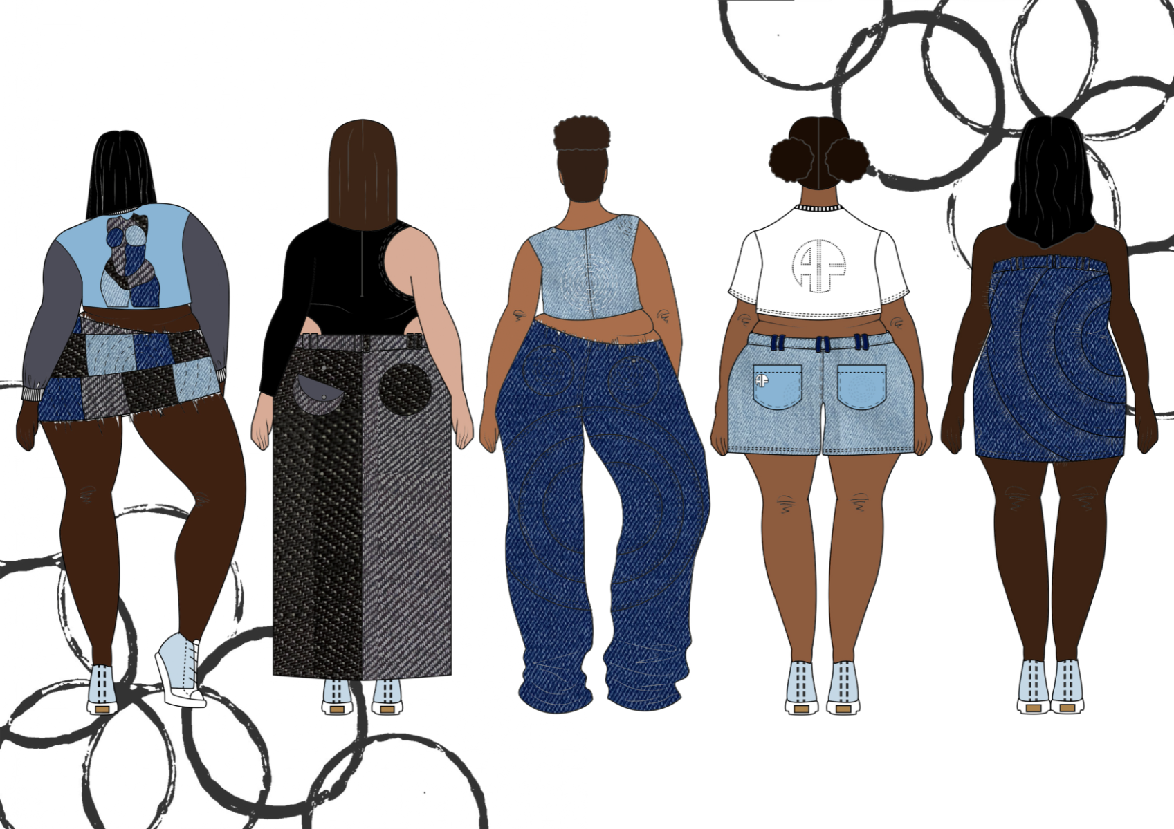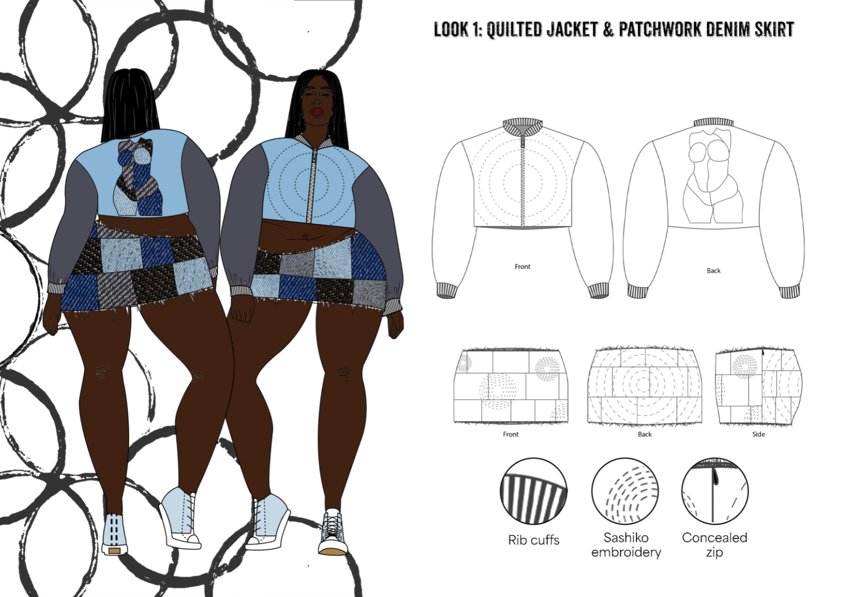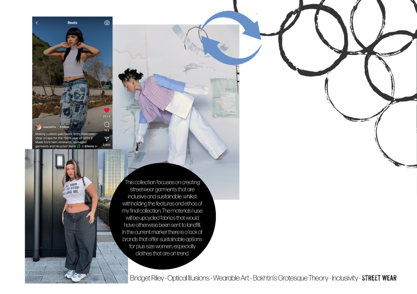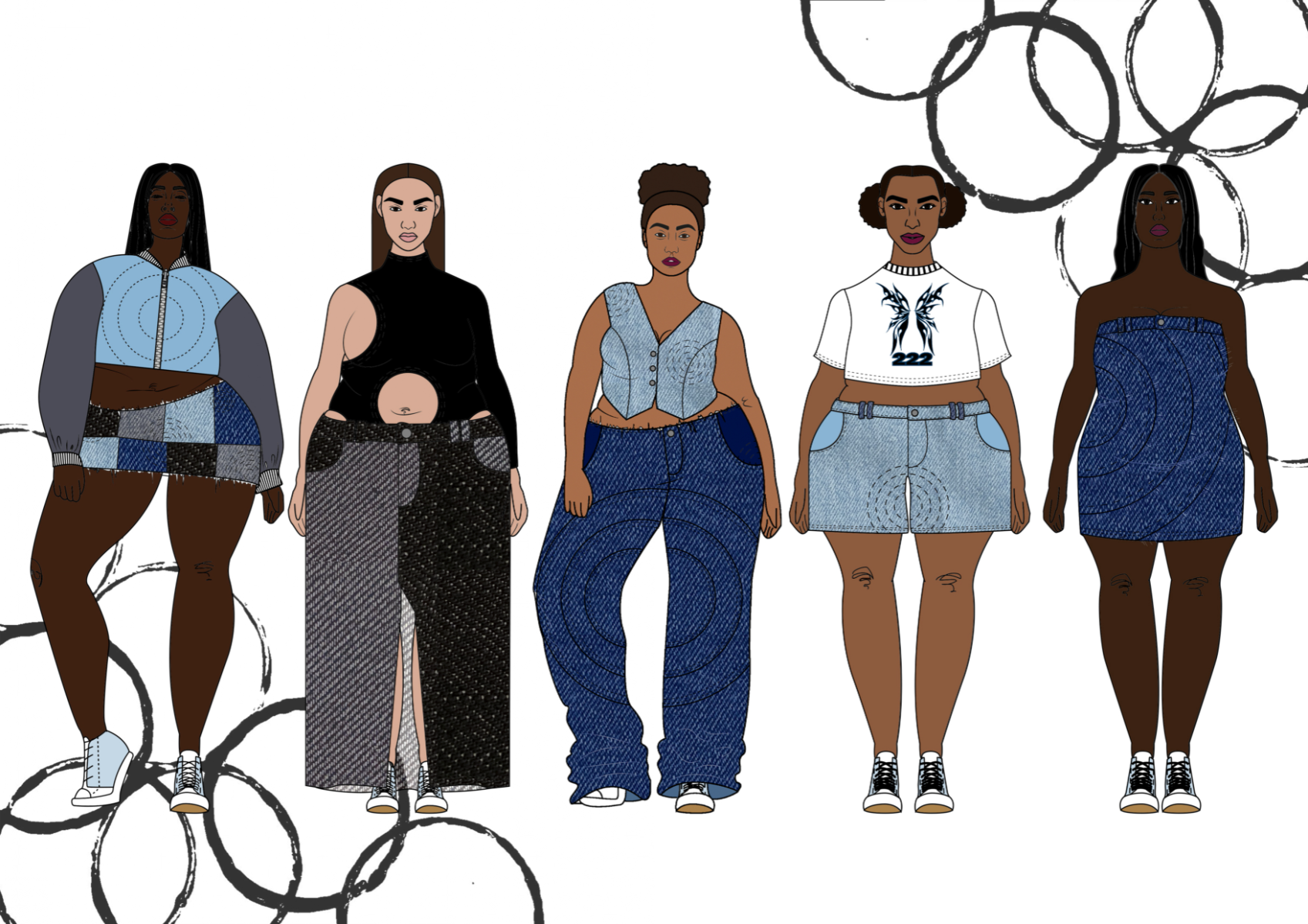 As an extension of my Final Major Project, I created a streetwear collection aimed towards plus-sized women & Gen-Z. My streetwear collection focuses on using upcycled denim in order to create a sustainable brand, which I believe is lacking in the current market, especially for plus-sized women.