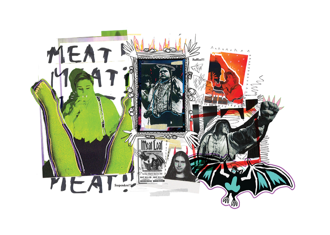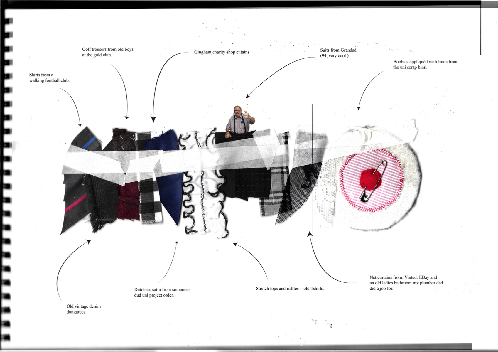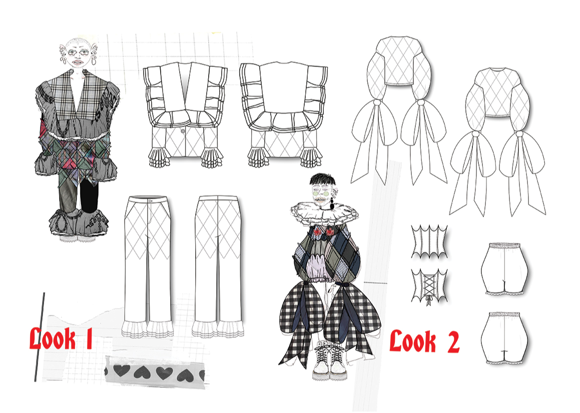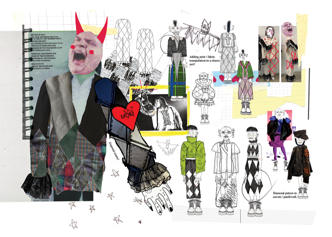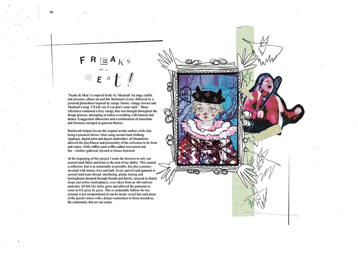 Meatloaf has an onstage presence and delivery that was so full of energy and fire that I couldn't help but try and harness it. Inspired by Jim Steinman's lyrics, Meatloafs performances onstage and in 'The Rocky Horror Picture Show', and a personal photoshoot I organised (taking notes from campy horror, vintage clowns and the song 'I'll kill you if you don't come back') the culmination of all this developed pieces full of fun and drama. Working within this concept is the fact that the collection is also made using sustainable practices, with all fabric being sourced second hand through donations, charity shops and online market places. I wanted to show that sustainability doesn't have to look one way, it can be dark and silly and over the top. Sustainability is the present and the future but that doesn't mean creativity and personality need to be left behind.