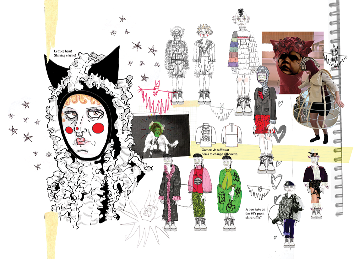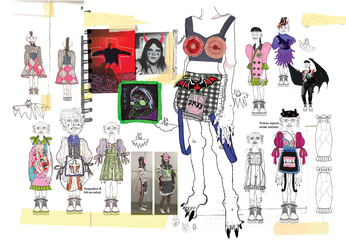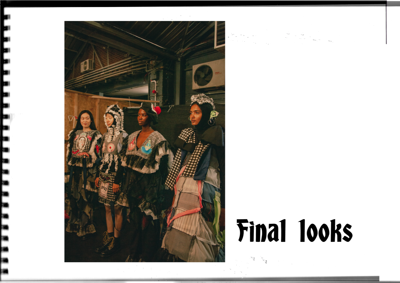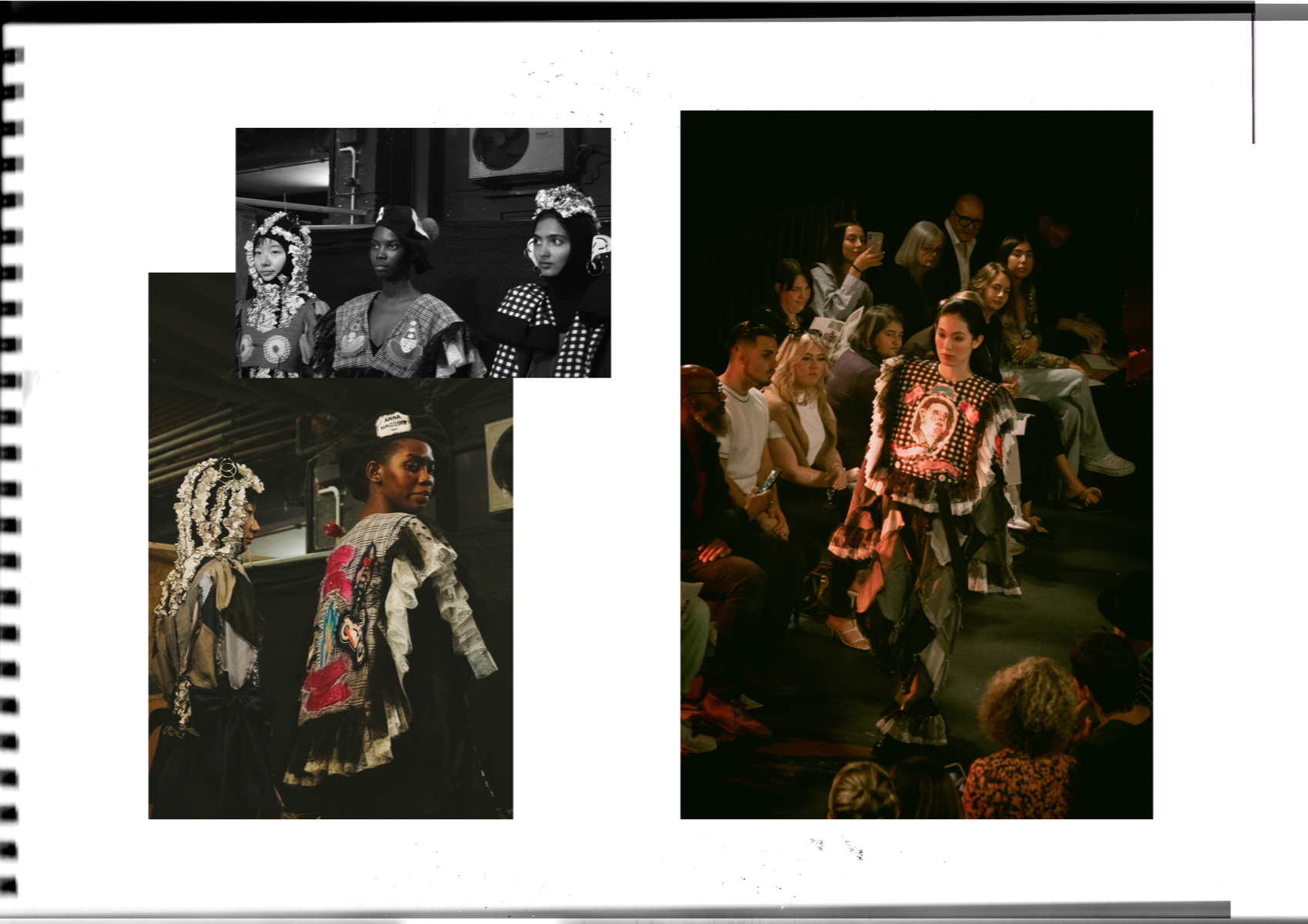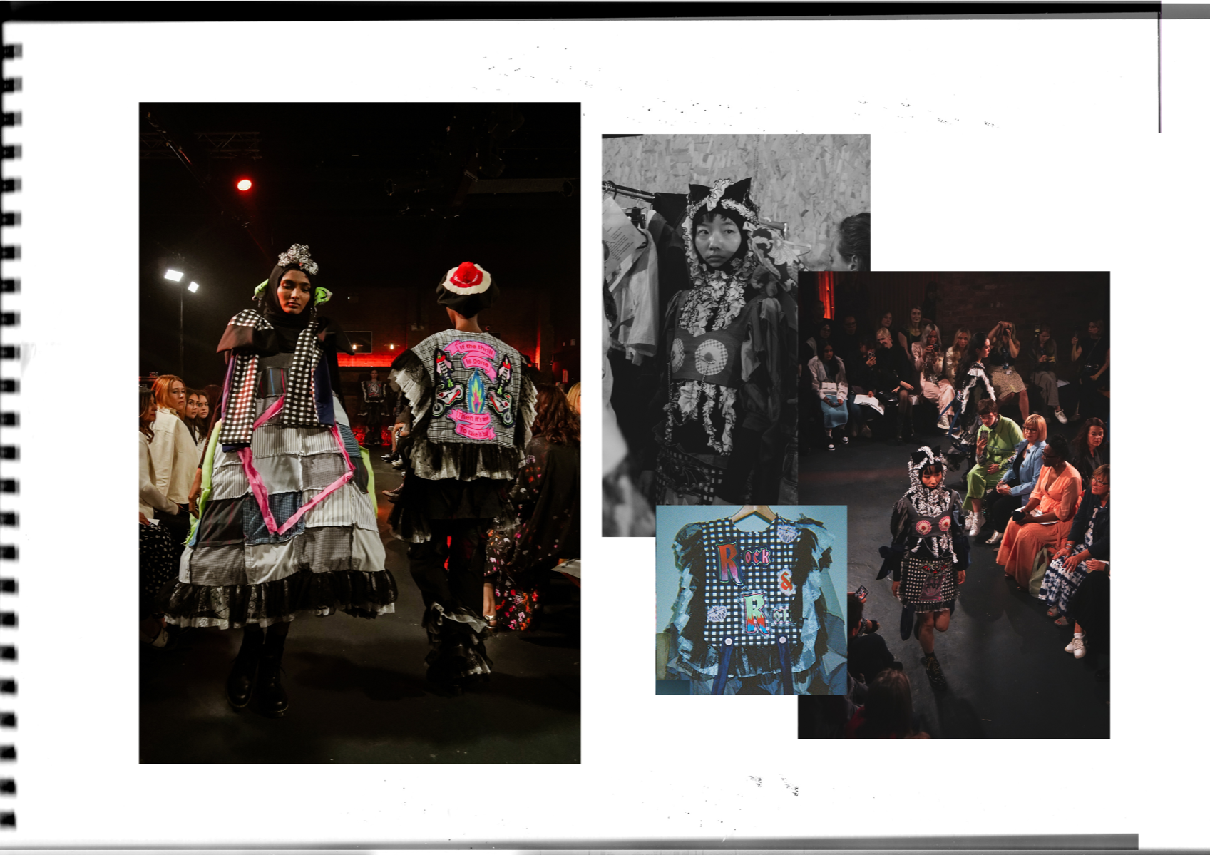 Meatloaf has an onstage presence and delivery that was so full of energy and fire that I couldn't help but try and harness it. Inspired by Jim Steinman's lyrics, Meatloafs performances onstage and in 'The Rocky Horror Picture Show', and a personal photoshoot I organised (taking notes from campy horror, vintage clowns and the song 'I'll kill you if you don't come back') the culmination of all this developed pieces full of fun and drama. Working within this concept is the fact that the collection is also made using sustainable practices, with all fabric being sourced second hand through donations, charity shops and online market places. I wanted to show that sustainability doesn't have to look one way, it can be dark and silly and over the top. Sustainability is the present and the future but that doesn't mean creativity and personality need to be left behind.