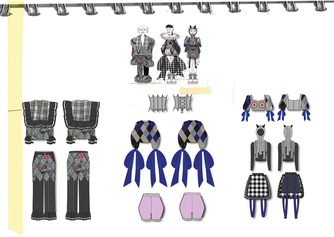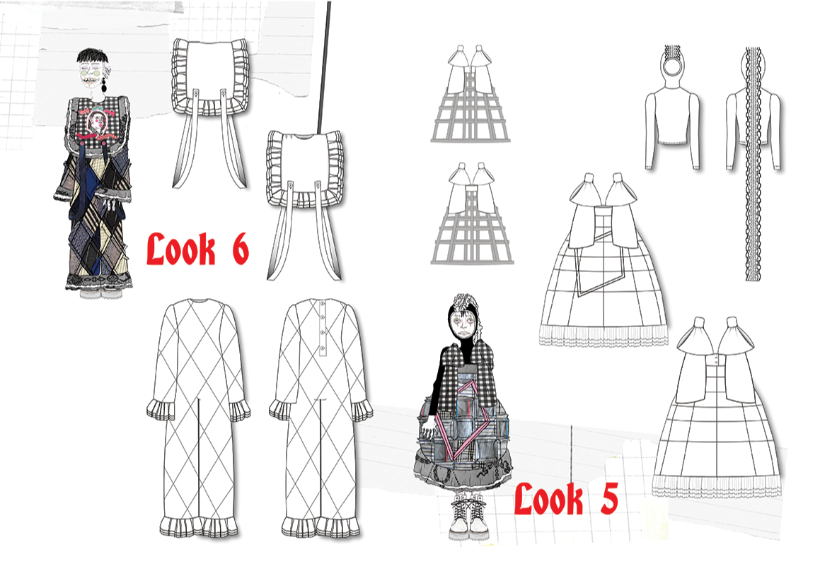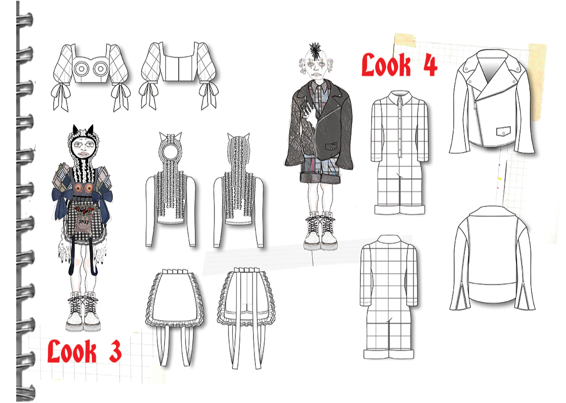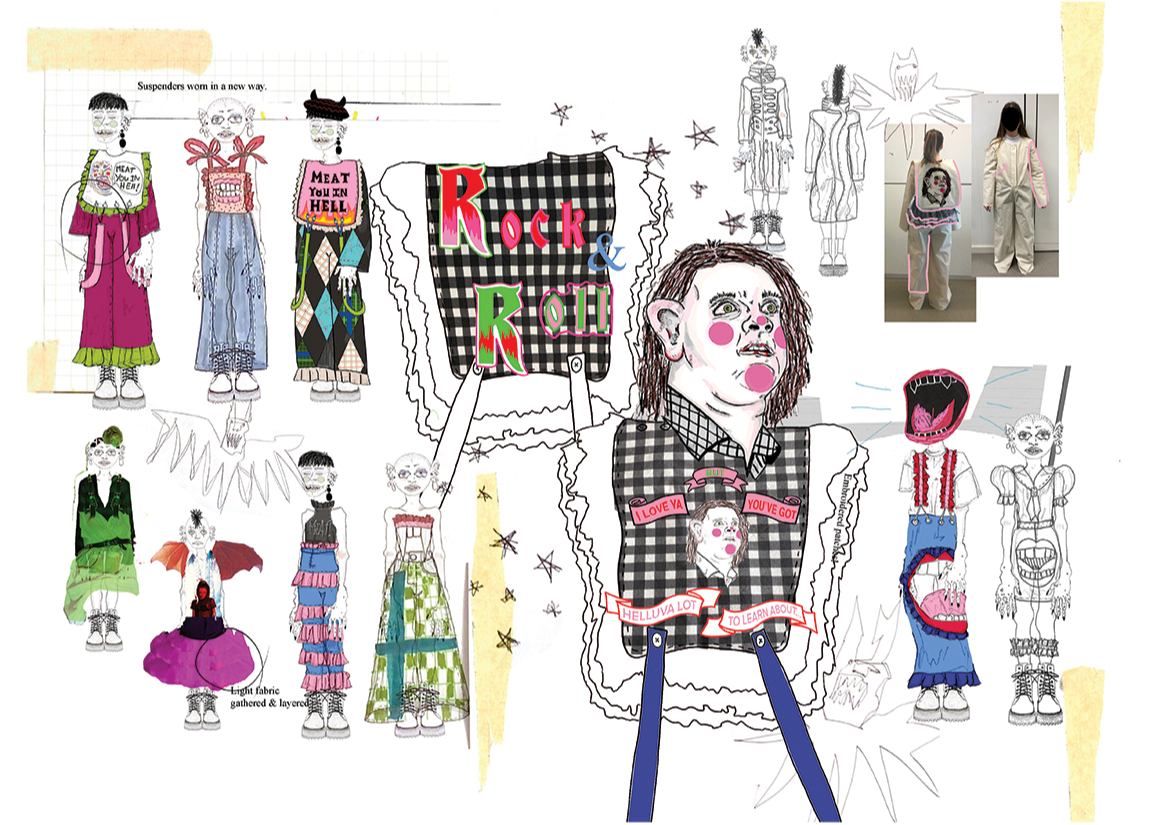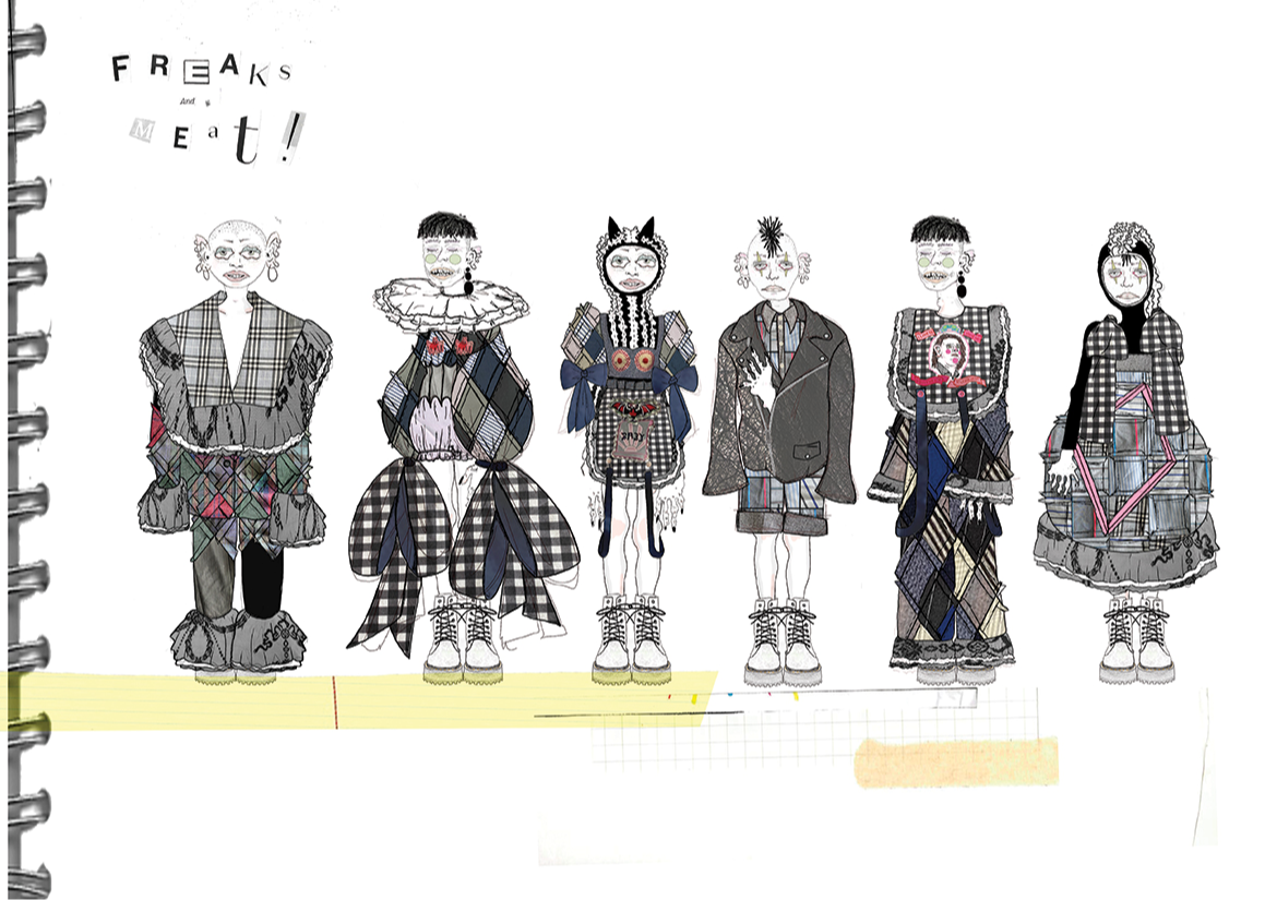 Meatloaf has an onstage presence and delivery that was so full of energy and fire that I couldn't help but try and harness it. Inspired by Jim Steinman's lyrics, Meatloafs performances onstage and in 'The Rocky Horror Picture Show', and a personal photoshoot I organised (taking notes from campy horror, vintage clowns and the song 'I'll kill you if you don't come back') the culmination of all this developed pieces full of fun and drama. Working within this concept is the fact that the collection is also made using sustainable practices, with all fabric being sourced second hand through donations, charity shops and online market places. I wanted to show that sustainability doesn't have to look one way, it can be dark and silly and over the top. Sustainability is the present and the future but that doesn't mean creativity and personality need to be left behind.
