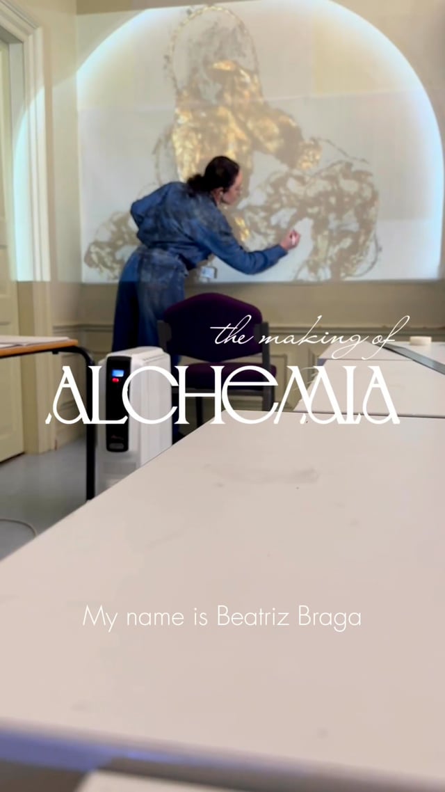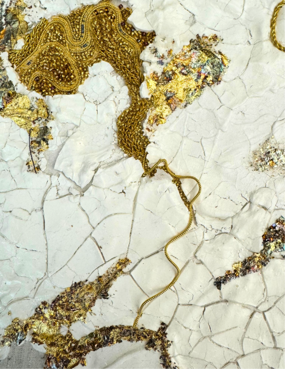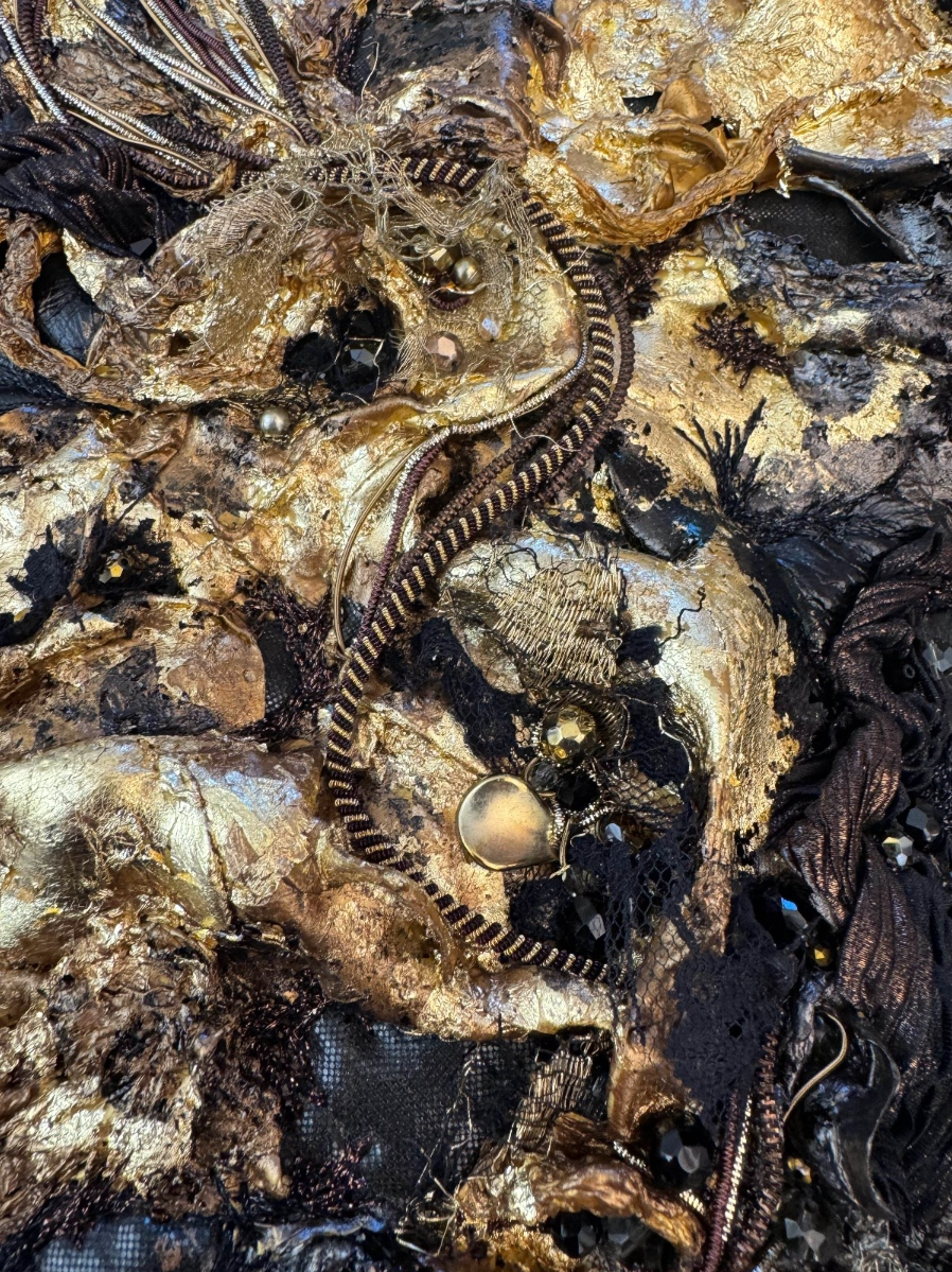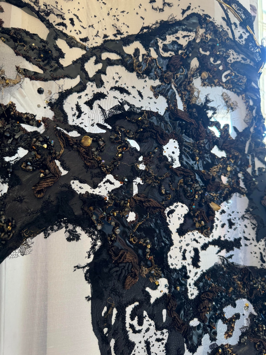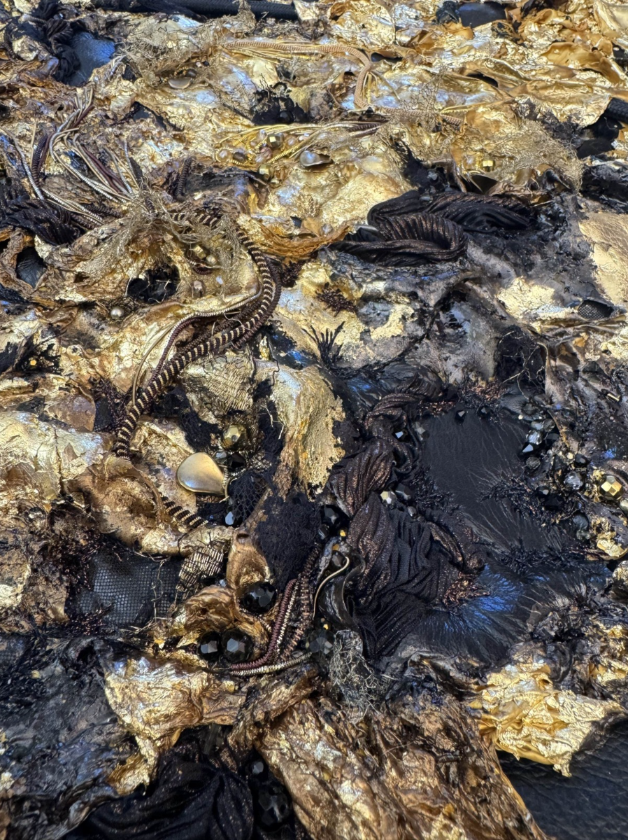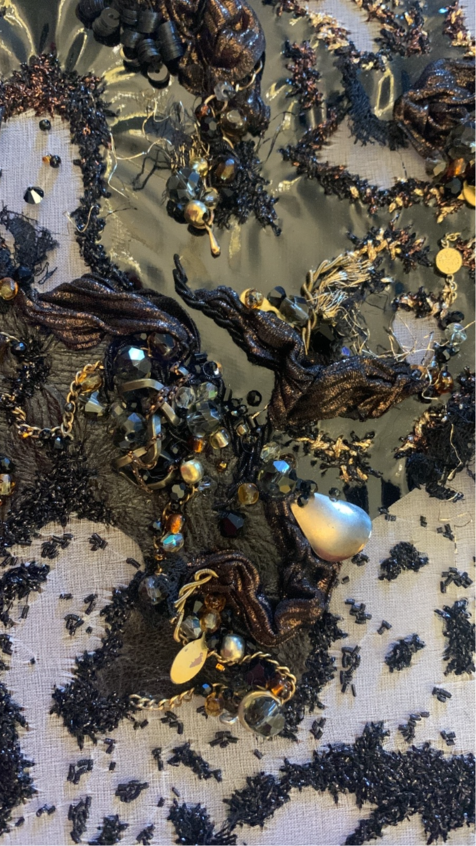 ALCHEMIA - The Design of Time, a 2x2 meter art installation, is inspired by how time can act as a designer through a series of alchemical processes and how this can contribute to a new understanding of what it means to design. By looking at processes like oxidisation, friction, sedimentation, Beatriz rethinks her own creative practice by including tarnished and worn materials. Whilst navigating the universe of natural abstractions, the artist reflects on how she can take time as a creator, allowing this reflection to lead her to innovative materials and processes and breaching the barriers of how embroidery can be conceived. Inspired by the work produced by textile artists dedicated to the research of biomaterials, ALCHEMIA shows how embroidery can be revolutionized by co-creating with non-human actors, like “time” or “nature”. Surrounded by organic inspiration, like meteorites, marbles and other sedimented rocks, the artist produces a piece where there are no linear or self-contained shapes: every element is shredded and diffuse, allowing the audience to be immersed in this haptic universe. Starring as the main part of this design is an exploration of latex rubber, that, once peeled from a plastic base, scrunches up and creates folds that are organically disposed in the design – an intrinsically material-led process. This is then reappropriated by the artist, through highly specialised hand embroidery techniques, pushing even further the materiality of this organic aesthetic. Without controlling every step of the process, Beatriz allows the materials, such as different types of repurposed fabrics, crystals, goldwork wires and tarnished and salvaged chains and jewellery bits, to dictate the direction of the creation. ALCHEMIA is, hence, a signature piece of Beatriz's style of creating and sets her apart, presenting an innovative approach to embroidery, be it in terms of scale, process or materiality.