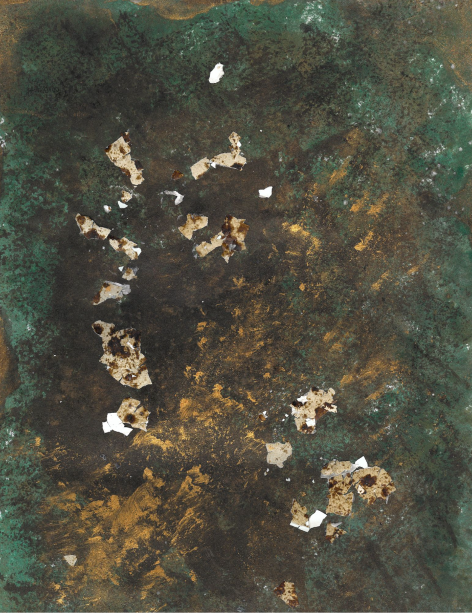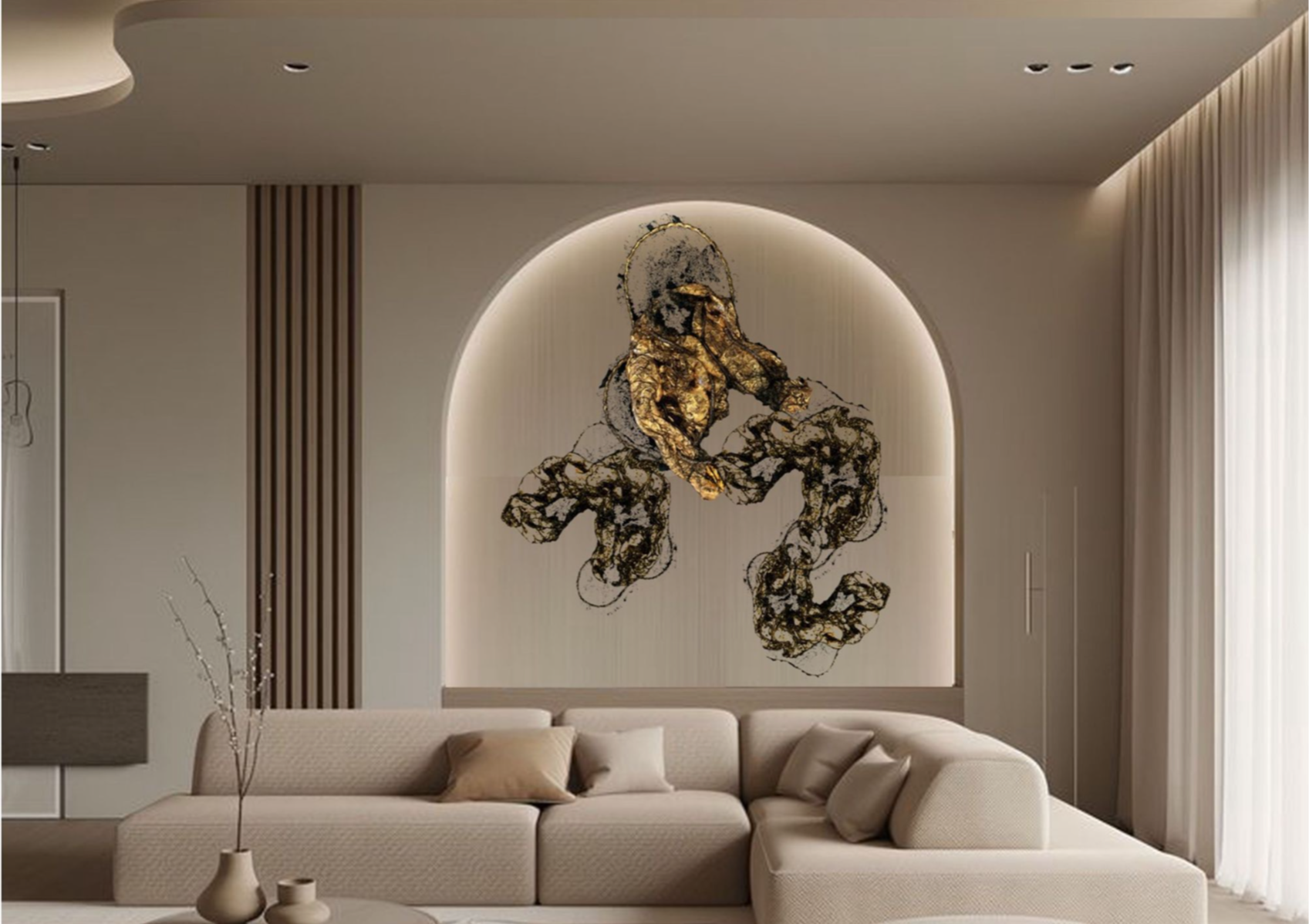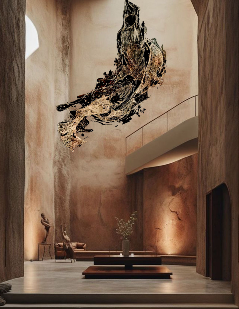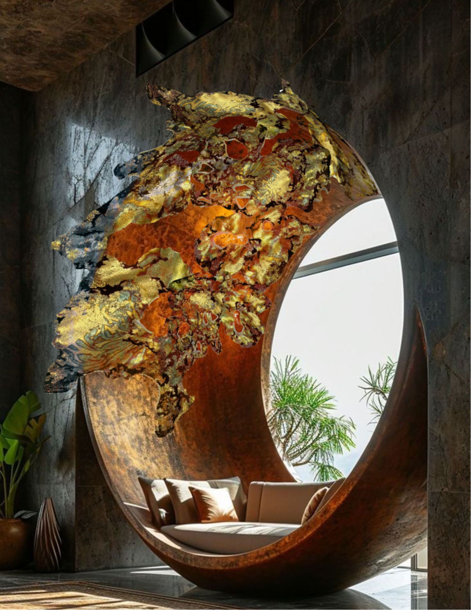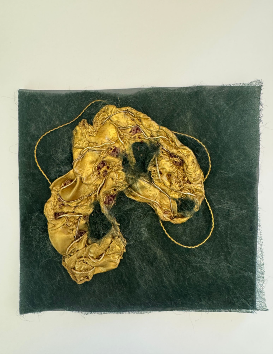ALCHEMIA - The Design of Time, a 2x2 meter art installation, is inspired by how time can act as a designer through a series of alchemical processes and how this can contribute to a new understanding of what it means to design. By looking at processes like oxidisation, friction, sedimentation, Beatriz rethinks her own creative practice by including tarnished and worn materials. Whilst navigating the universe of natural abstractions, the artist reflects on how she can take time as a creator, allowing this reflection to lead her to innovative materials and processes and breaching the barriers of how embroidery can be conceived. Inspired by the work produced by textile artists dedicated to the research of biomaterials, ALCHEMIA shows how embroidery can be revolutionized by co-creating with non-human actors, like “time” or “nature”. Surrounded by organic inspiration, like meteorites, marbles and other sedimented rocks, the artist produces a piece where there are no linear or self-contained shapes: every element is shredded and diffuse, allowing the audience to be immersed in this haptic universe. Starring as the main part of this design is an exploration of latex rubber, that, once peeled from a plastic base, scrunches up and creates folds that are organically disposed in the design – an intrinsically material-led process. This is then reappropriated by the artist, through highly specialised hand embroidery techniques, pushing even further the materiality of this organic aesthetic. Without controlling every step of the process, Beatriz allows the materials, such as different types of repurposed fabrics, crystals, goldwork wires and tarnished and salvaged chains and jewellery bits, to dictate the direction of the creation. ALCHEMIA is, hence, a signature piece of Beatriz's style of creating and sets her apart, presenting an innovative approach to embroidery, be it in terms of scale, process or materiality.
