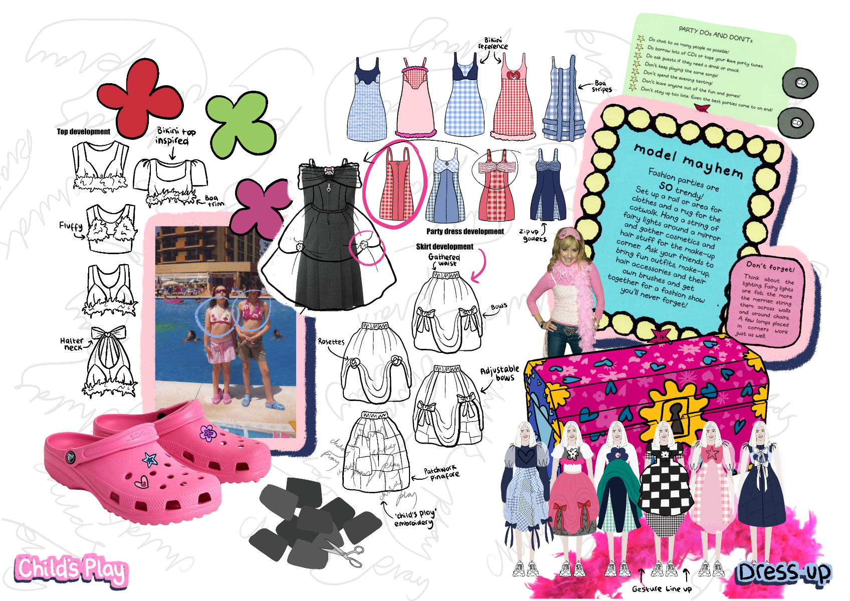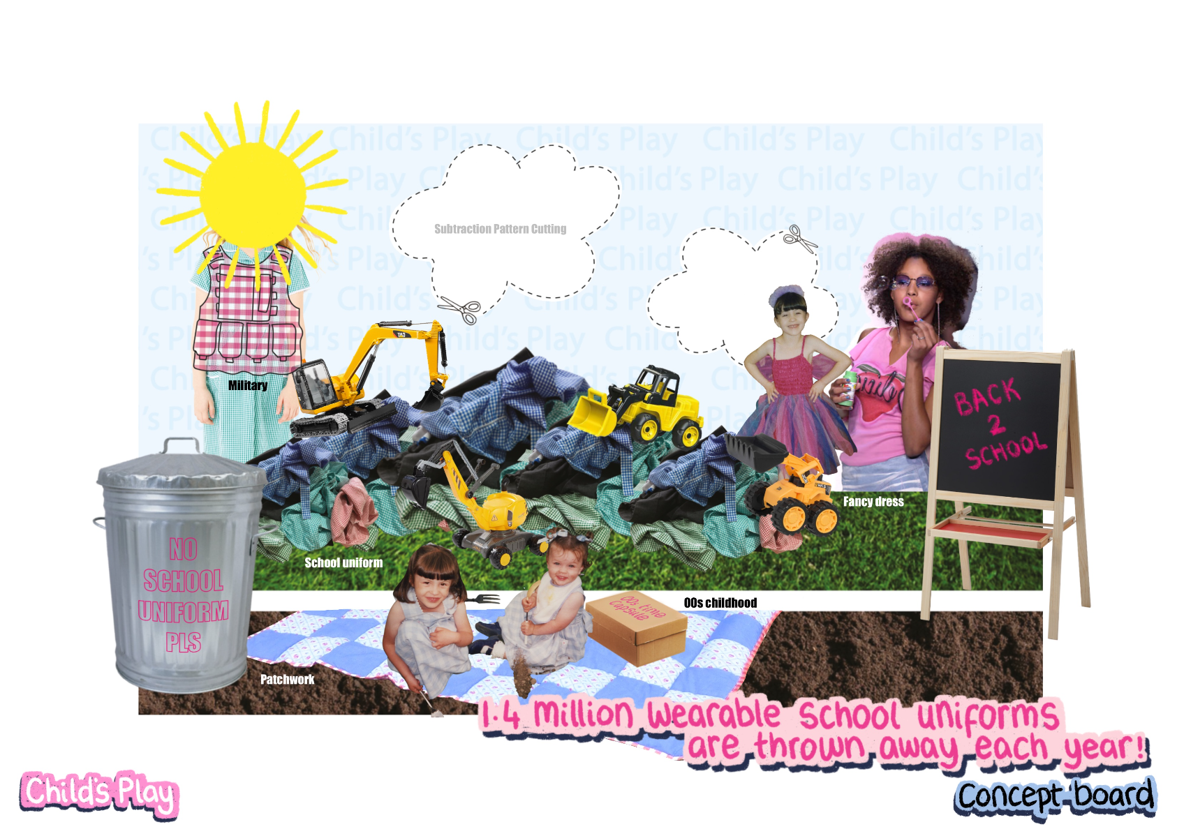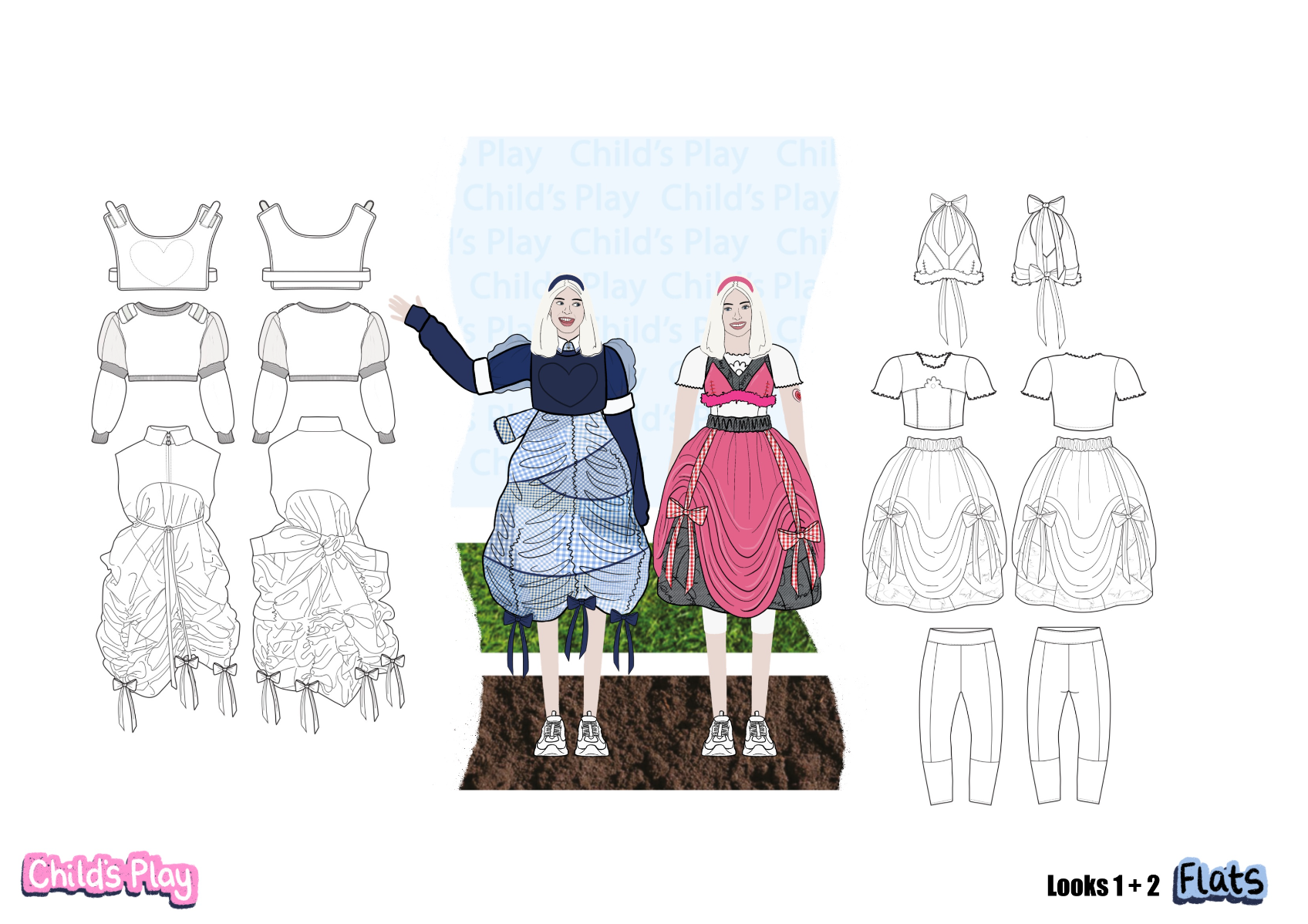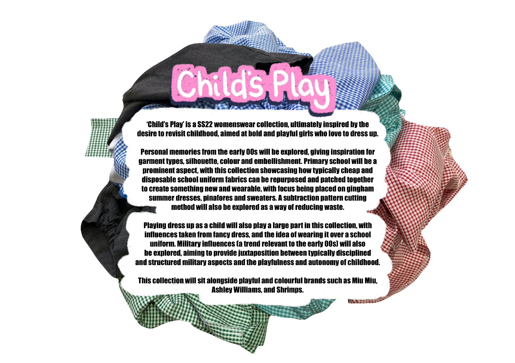 'Child's Play' is a SS22 womenswear collection, ultimately inspired by the desire to revisit childhood. Personal memories from the early '00's have been explored, with fancy dress and primary school being prominent aspects. This collection showcases how typically cheap and disposable school uniform fabrics can be transformed into something fun and wearable.