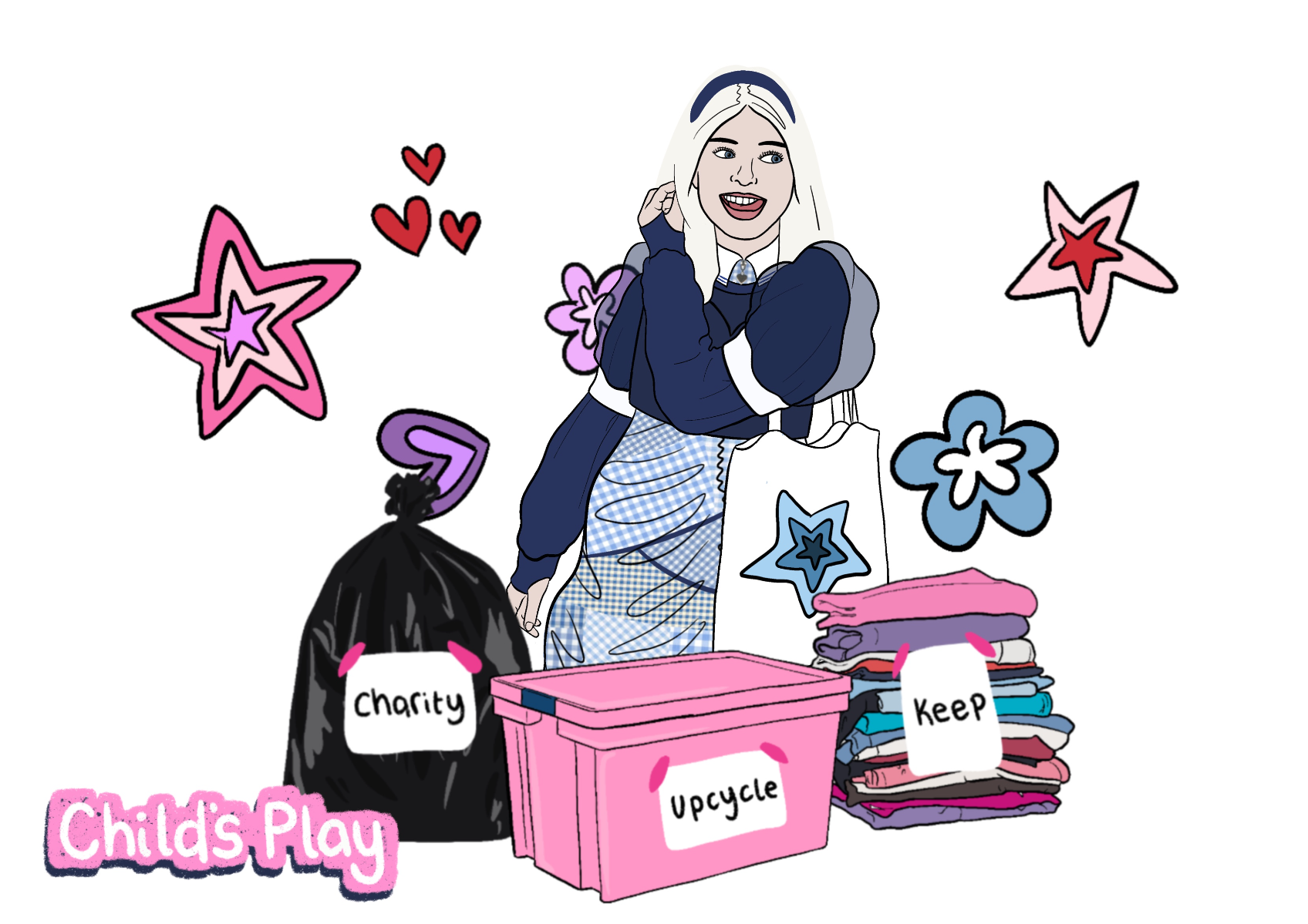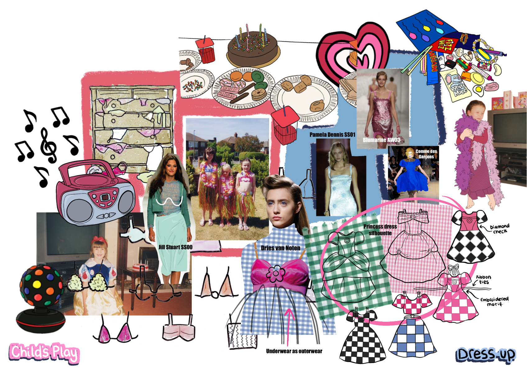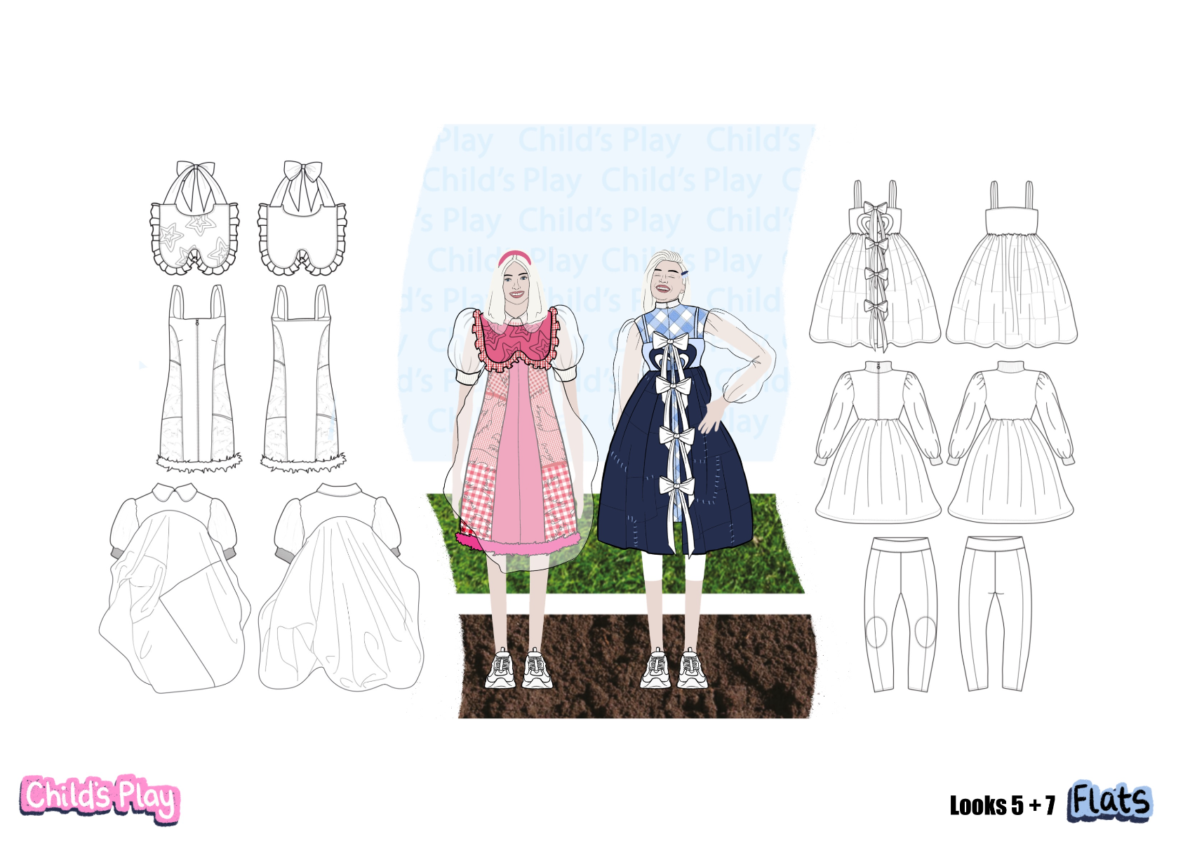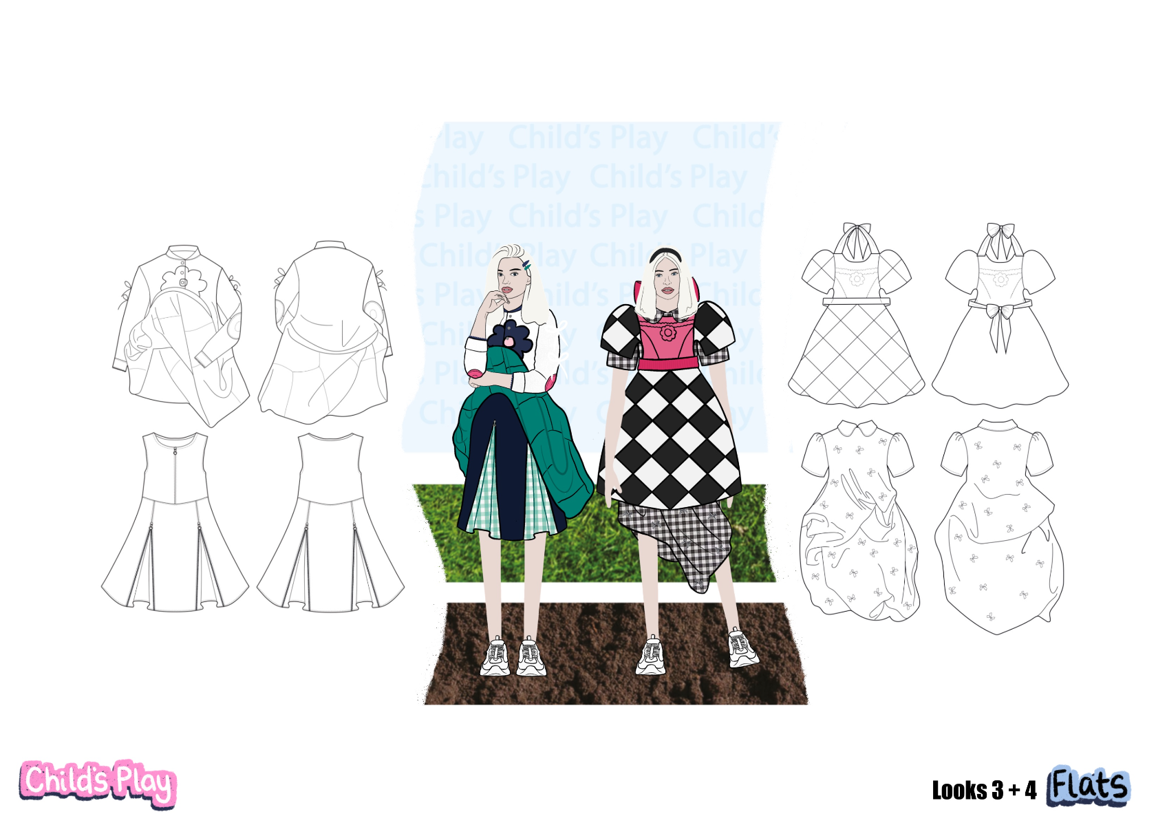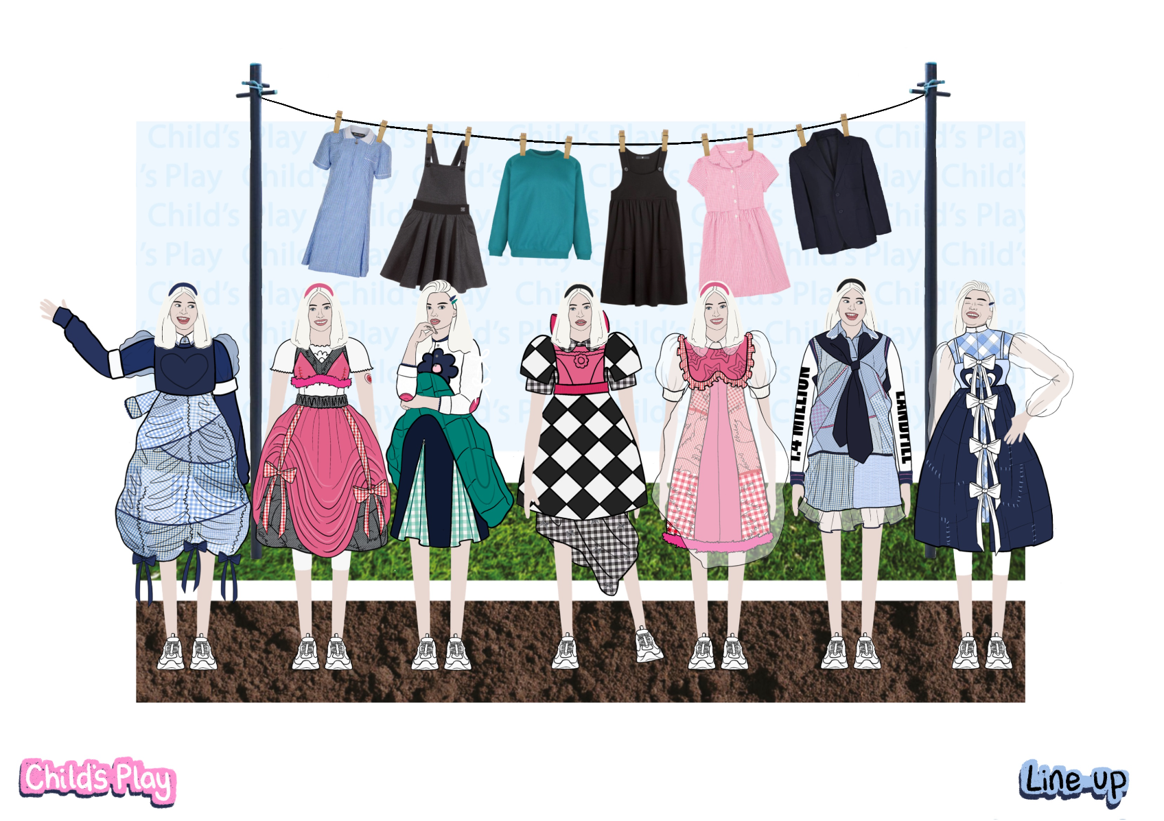 'Child's Play' is a SS22 womenswear collection, ultimately inspired by the desire to revisit childhood. Personal memories from the early '00's have been explored, with fancy dress and primary school being prominent aspects. This collection showcases how typically cheap and disposable school uniform fabrics can be transformed into something fun and wearable.