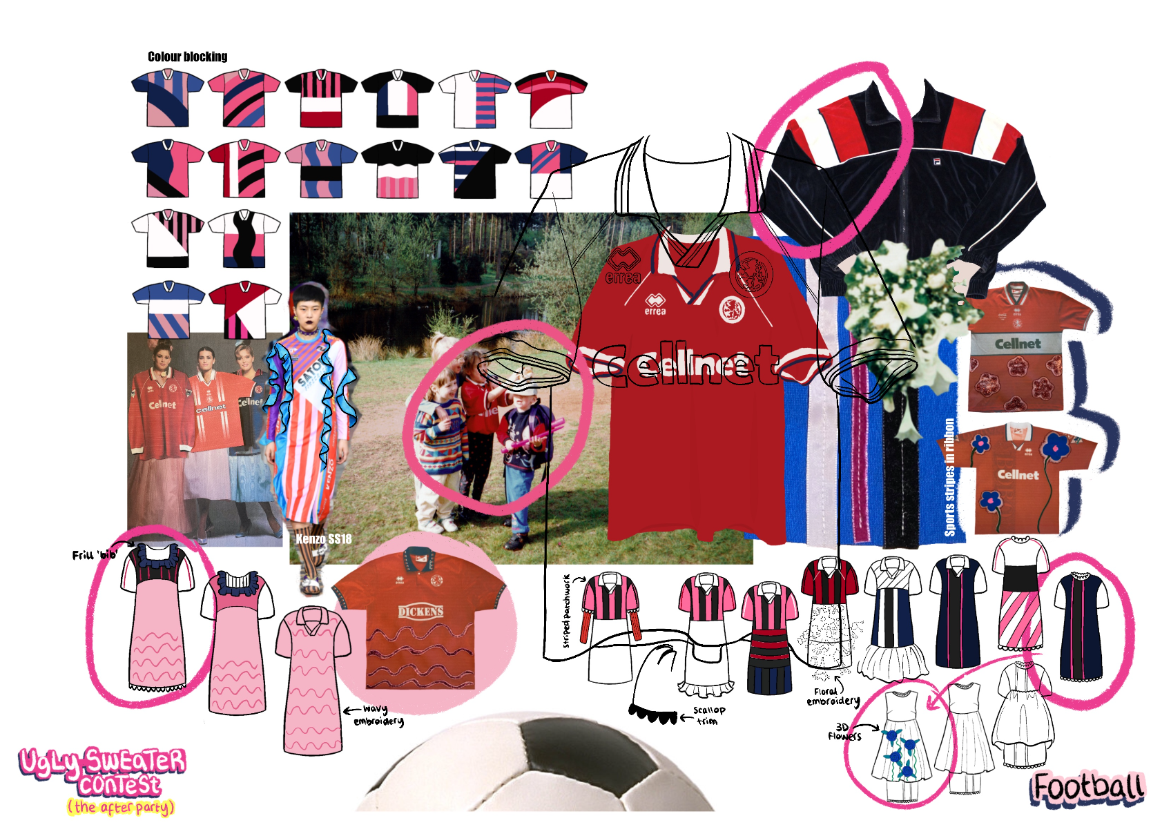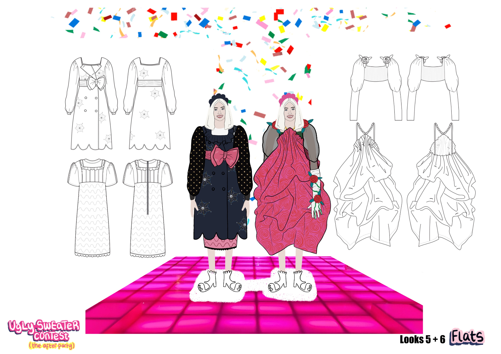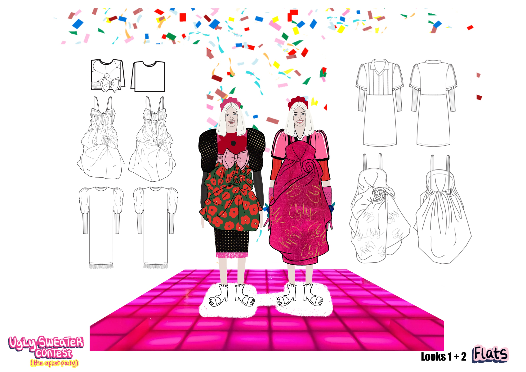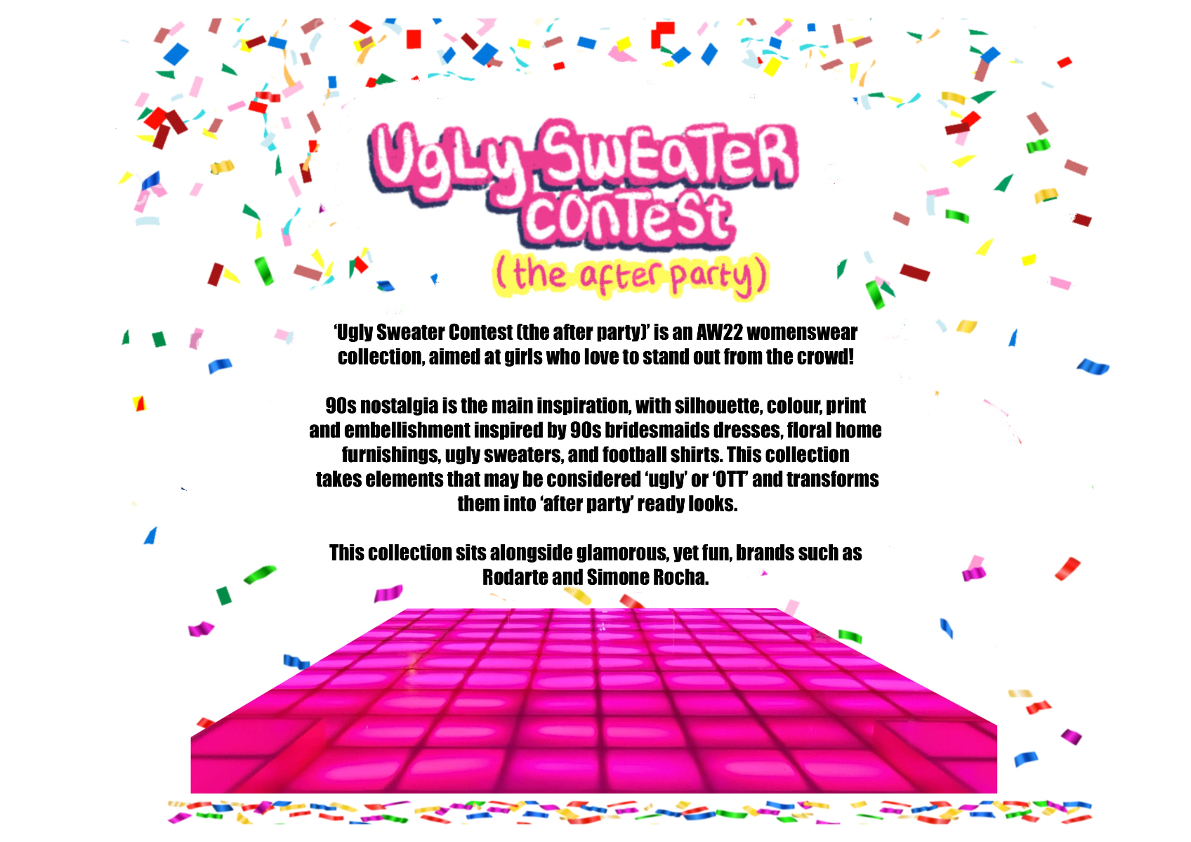 ‘Ugly Sweater Contest’ (the after party)' is an AW22 womenswear collection, ultimately inspired by 90s elements, such as bridesmaids dresses, home furnishings, and football shirts. This collection takes 'ugly elements', such as OTT sweaters and clashing florals, and transforms them into 'after party' ready looks, suitable for girls who love to stand out!